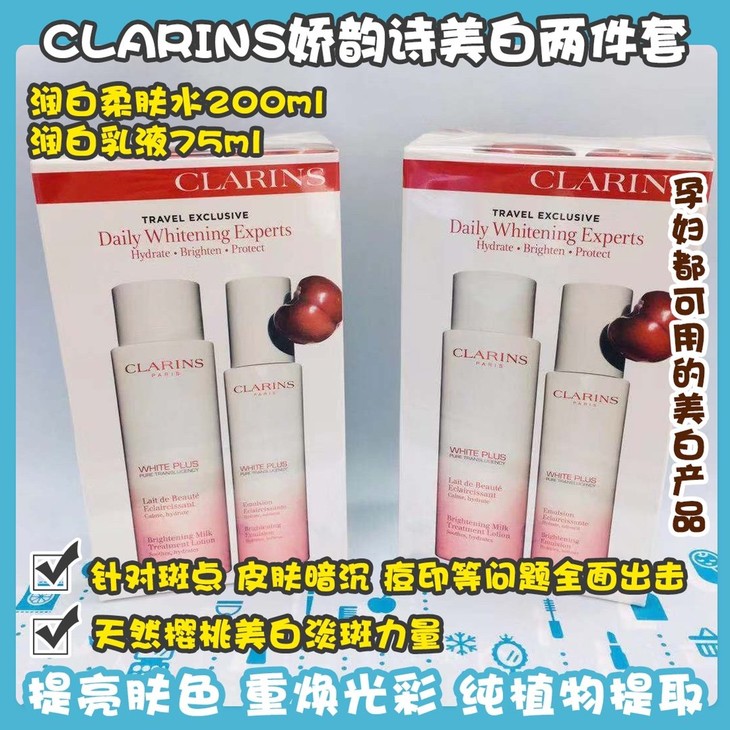 CLARINS娇韵诗美白两件套👍纯植物提取🌱,孕妇都可用的美白产品✅!它以美白为主要诉求☁,针对斑点,皮肤暗沉,痘印等问题全面出击👊。天然樱桃美白淡斑力量🍒,有助于减少色斑的形成🙅,唤醒肌肤的内在自然光彩✨。消除面部干枯的细胞死皮🍂,提亮肤色,重焕光彩💃。怀孕时候皮肤容易生成妊娠斑😭,这款美白乳液有淡化斑点和预防的功效哦🉑!套装包括:润白柔肤水200ml➕润白乳液75ml。