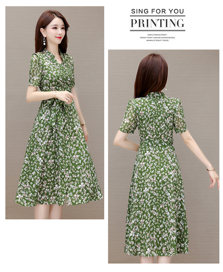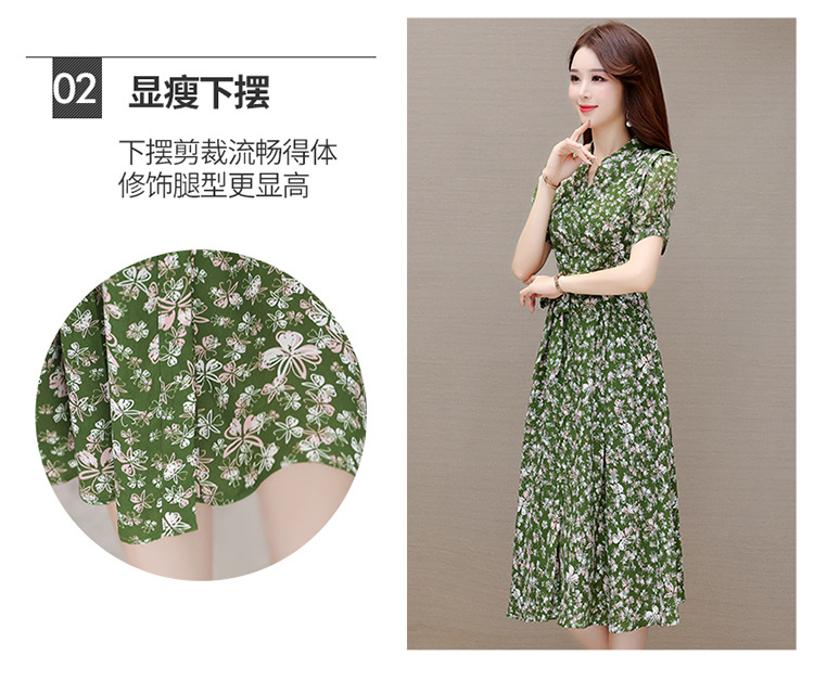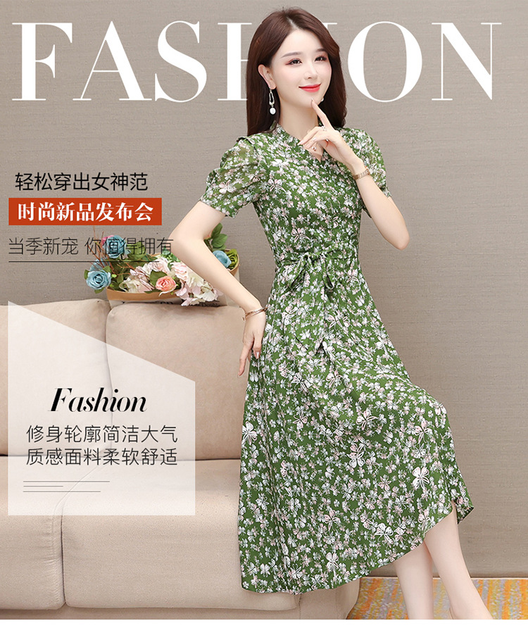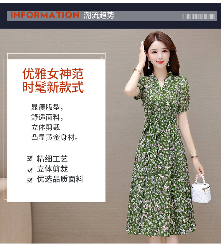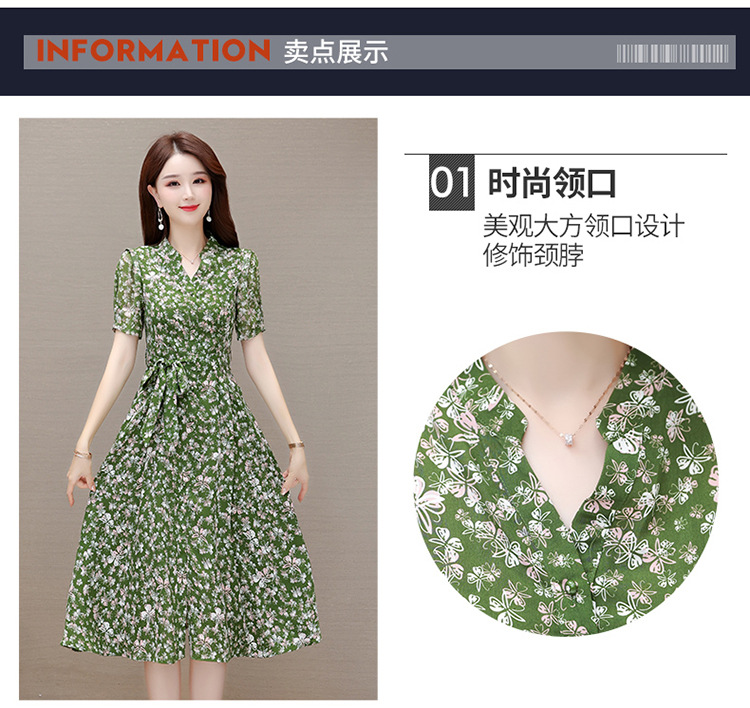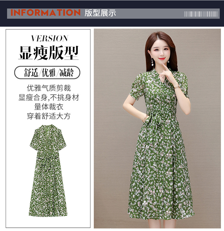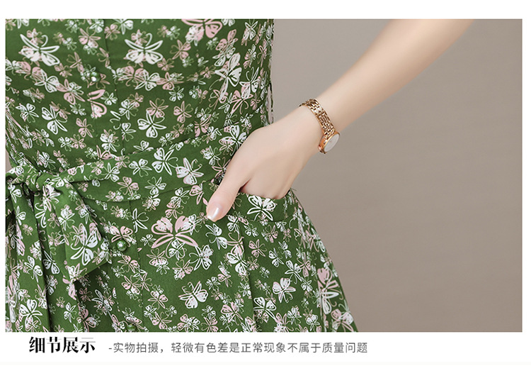 DD-时尚绿色印花连衣裙2023年新款女装系带收腰裙中长款短袖A字裙