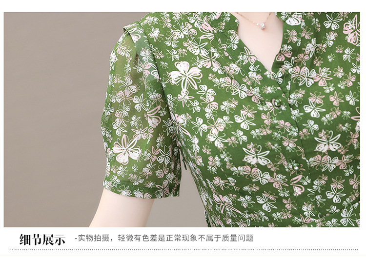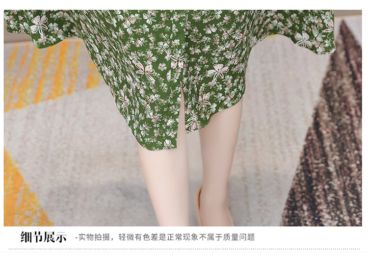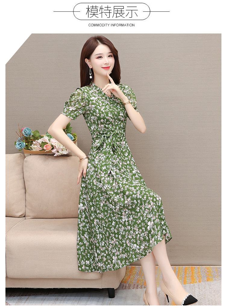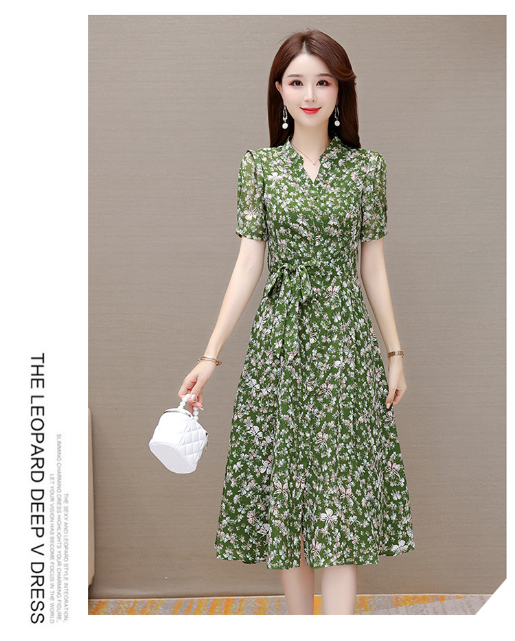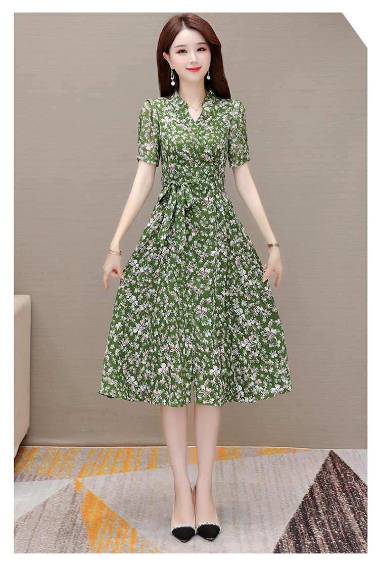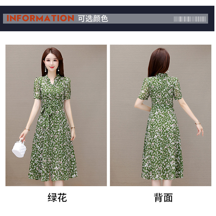 DD-时尚绿色印花连衣裙2023年新款女装系带收腰裙中长款短袖A字裙
