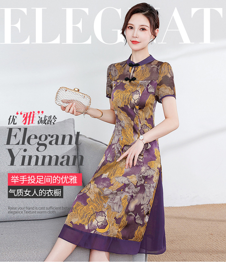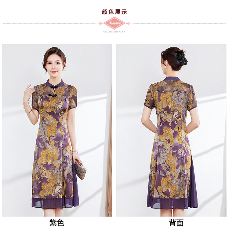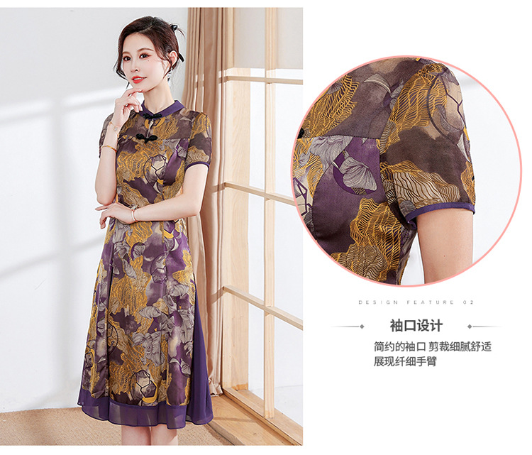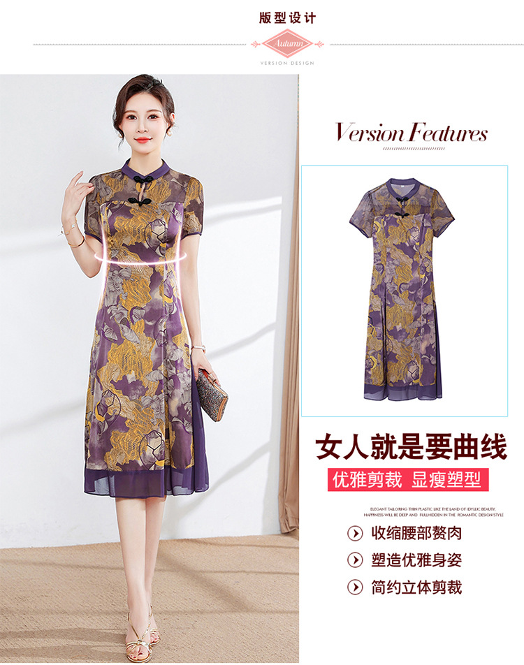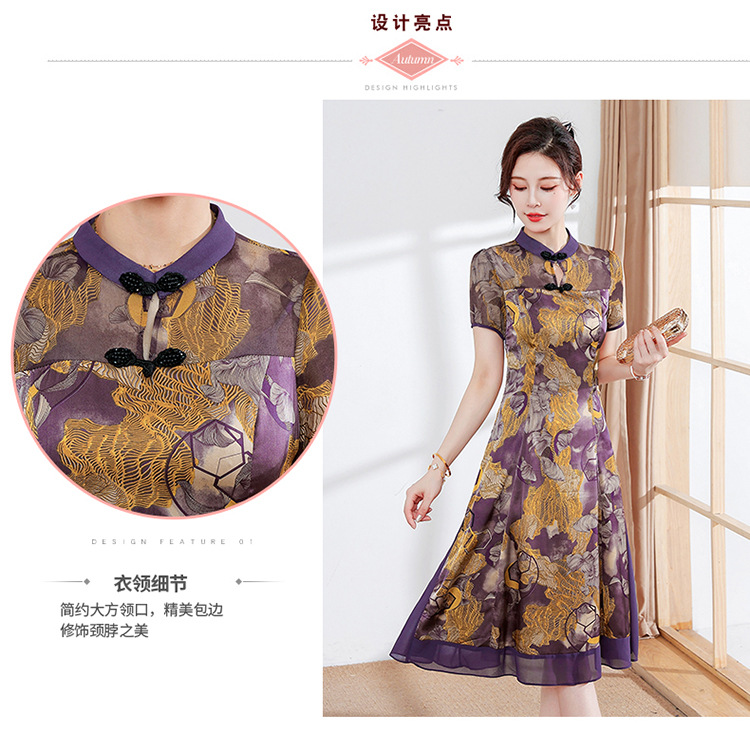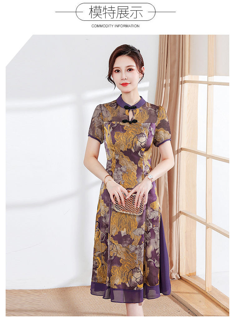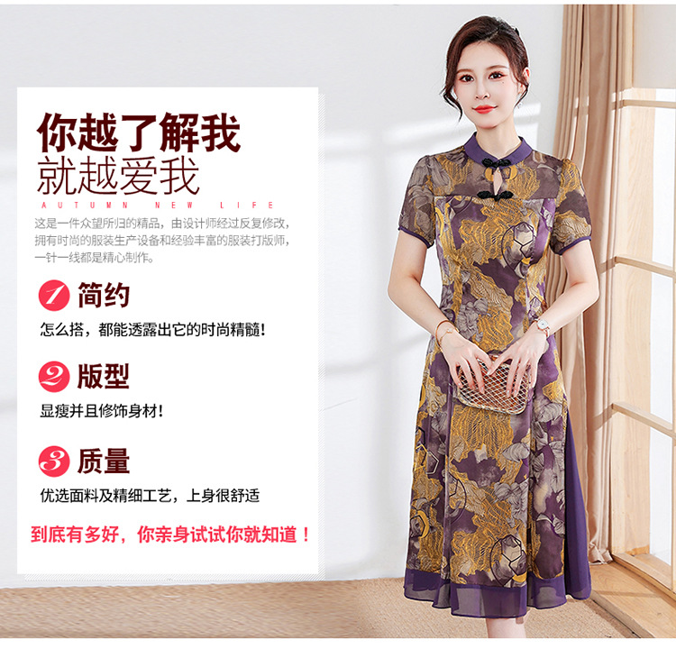 QYM-23TA52-Y复古旗袍裙夏季新款短袖裙中长款印花裙时尚气质妈妈装连衣裙