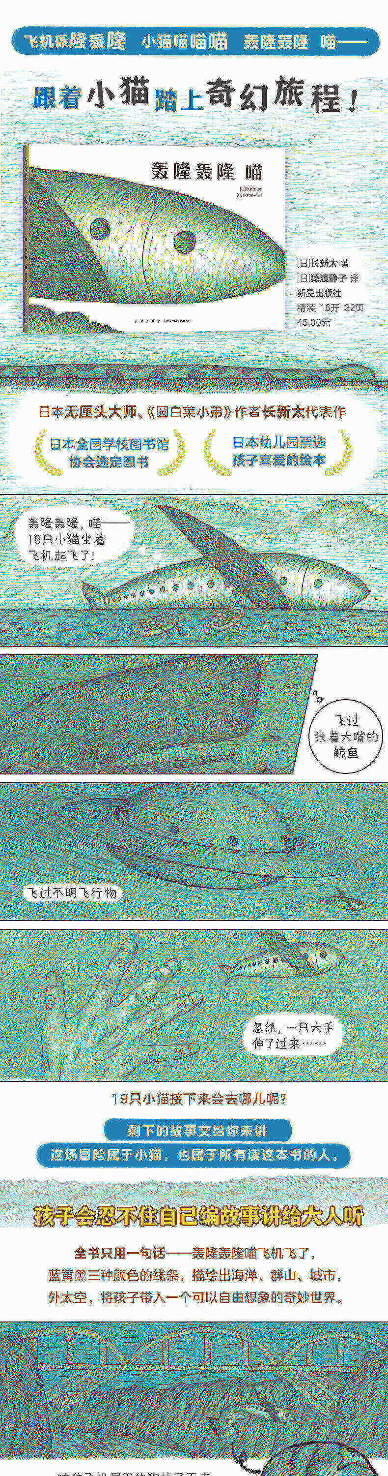 飞机轰隆轰隆,小猫喵喵喵。轰隆轰隆,喵——19只小猫坐着飞机起飞了!飞过张着大嘴的鲸鱼,飞过高山,飞过一条沉睡的蛇,飞过城市上空,飞过峡谷和森林……忽然,一只大手伸了过来……轰隆轰隆,喵!