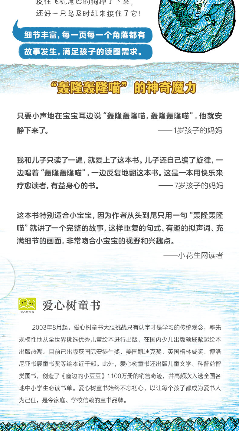 《轰隆轰隆喵》充分体现了绘本大师长新太无厘头的风格。全书只用一句话——轰隆轰隆喵飞机飞了,蓝三种颜色的线条,描绘出海洋、群山、城市,外太空,将读者带入一个可以自由想象的奇妙世界。