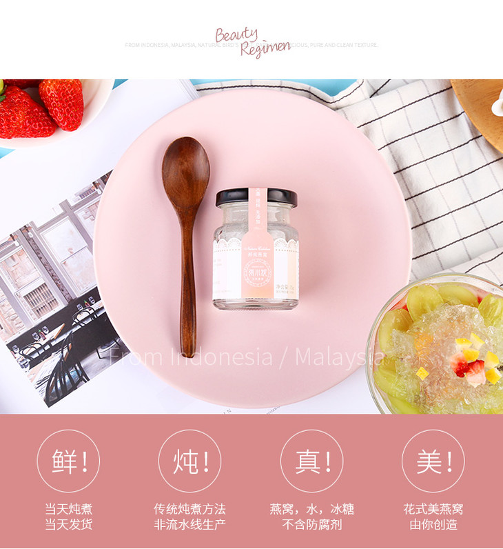 2.开盖即食,如需加热,整瓶放入温水中即可。过高温度(开水)会导致燕窝中丰富的水溶性蛋白质水化。