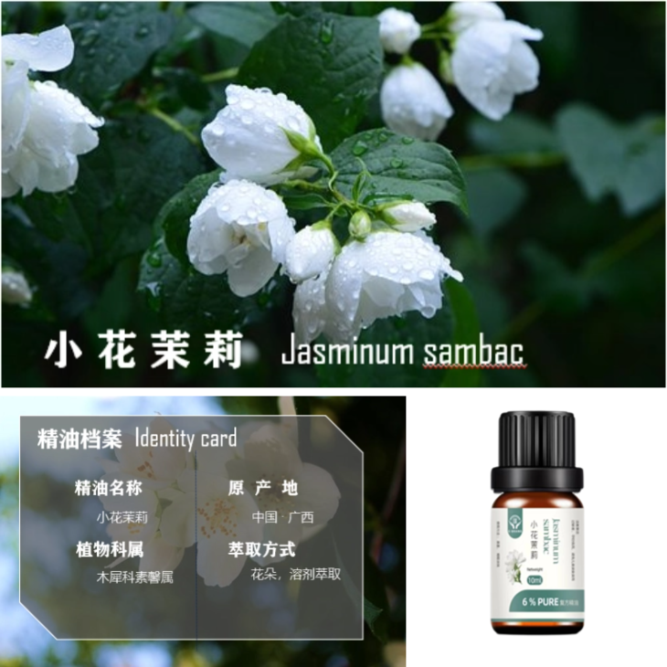 茉莉精油大约6万朵茉莉才能蒸馏出2.5毫升的茉莉精油,茉莉精油能够完美的还原茉莉花的味道,诱人的香气被称为“夜晚的女王”。