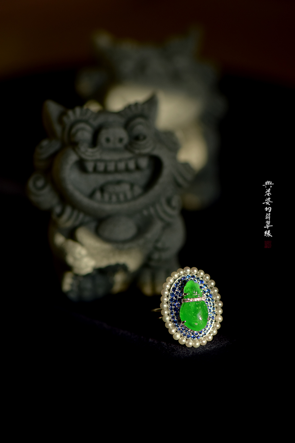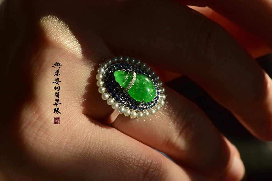 18k白金蓝宝珍珠翡翠钱袋子戒指