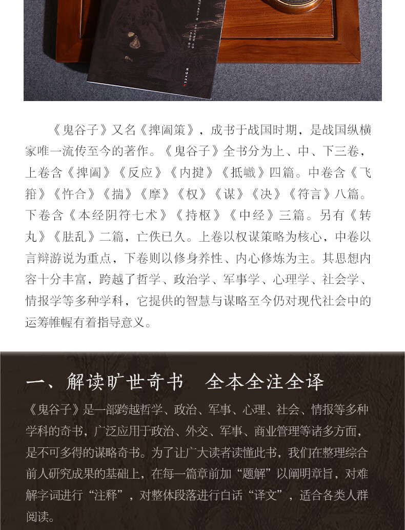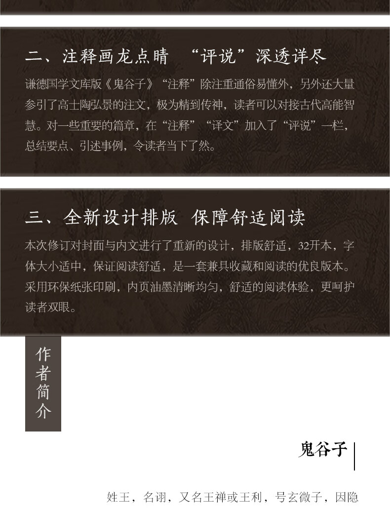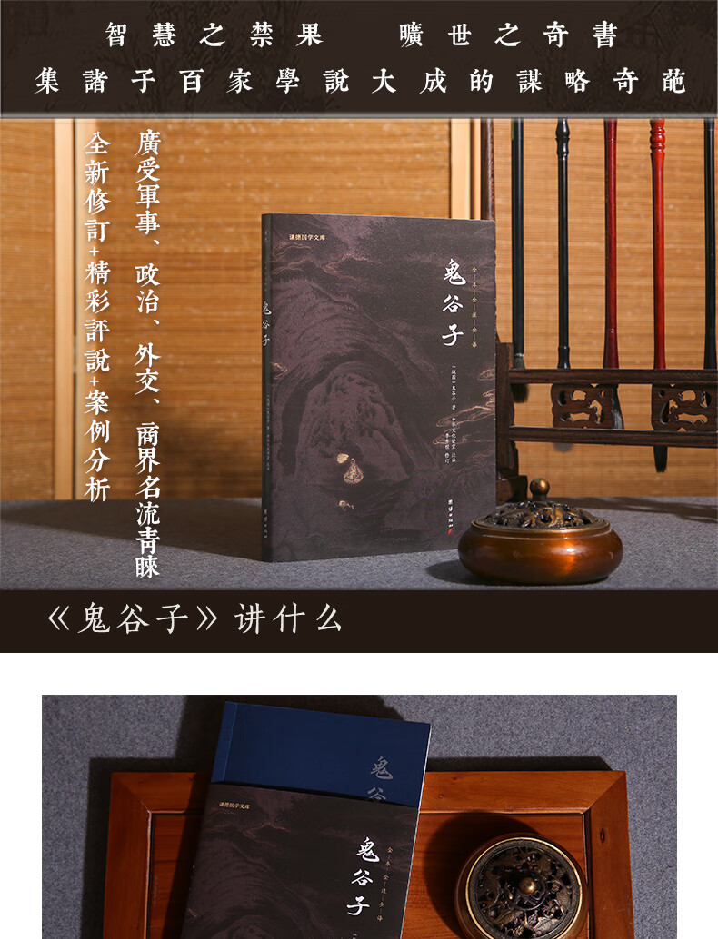 《鬼谷子》一书是鬼谷子思想的集大成之作,是纵横游说之术的高度总结,是纵横家理论争鸣著作。全书分为上、中、下三卷。上卷以权谋策略为主,中卷以言辩游说为重点,下卷则以修身养性、内心修炼为核心。《鬼谷子》堪称是一部专门探讨古代政治权谋的智慧宝典,一直被中国古代军事家、政治家和外交家所研究。本次出版,为方便现代读者阅读,我们在对原文进行精心校对的基础上,又进行了详尽的注释和准确流畅的翻译。