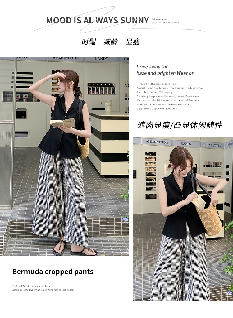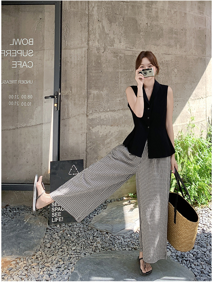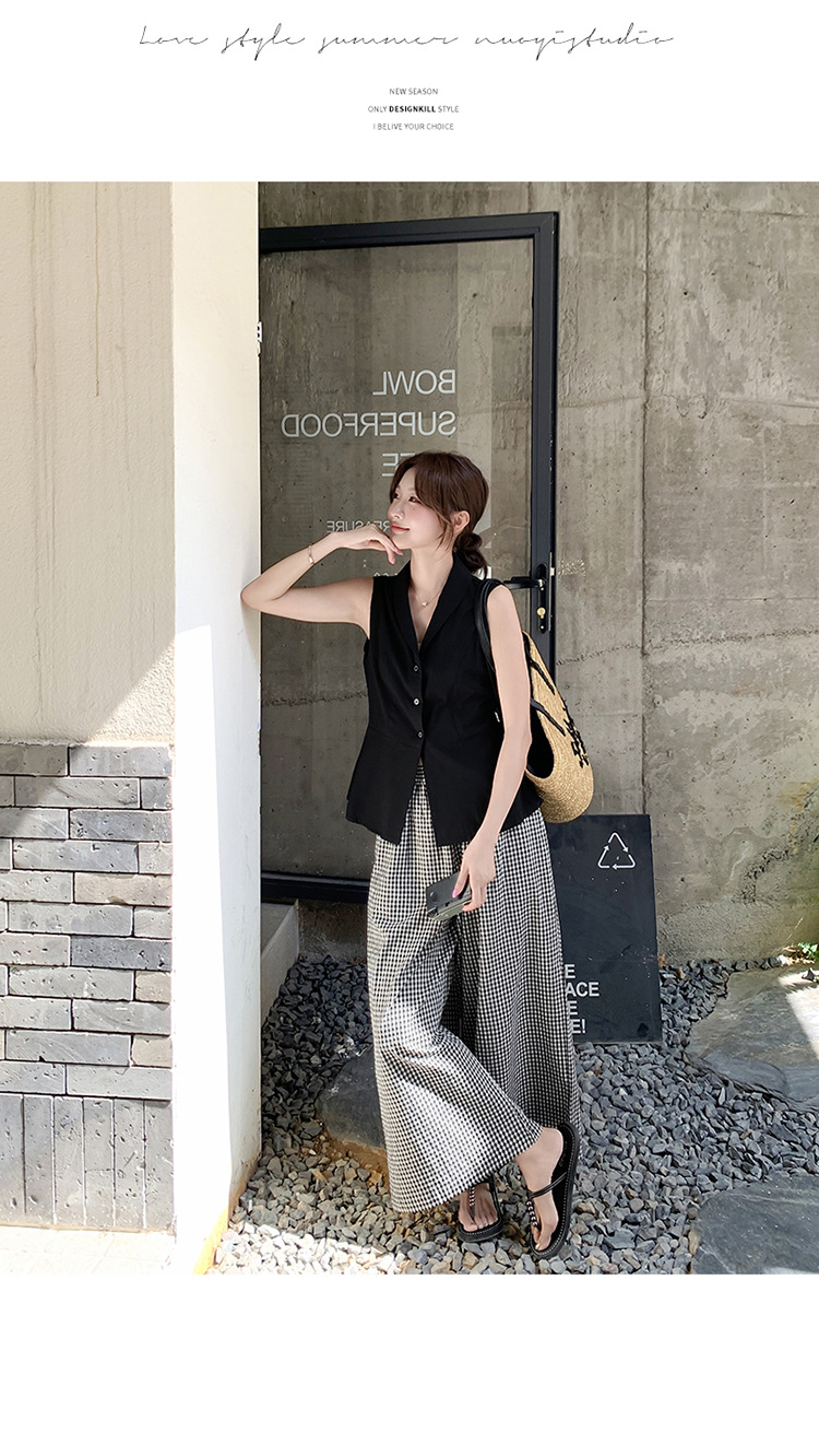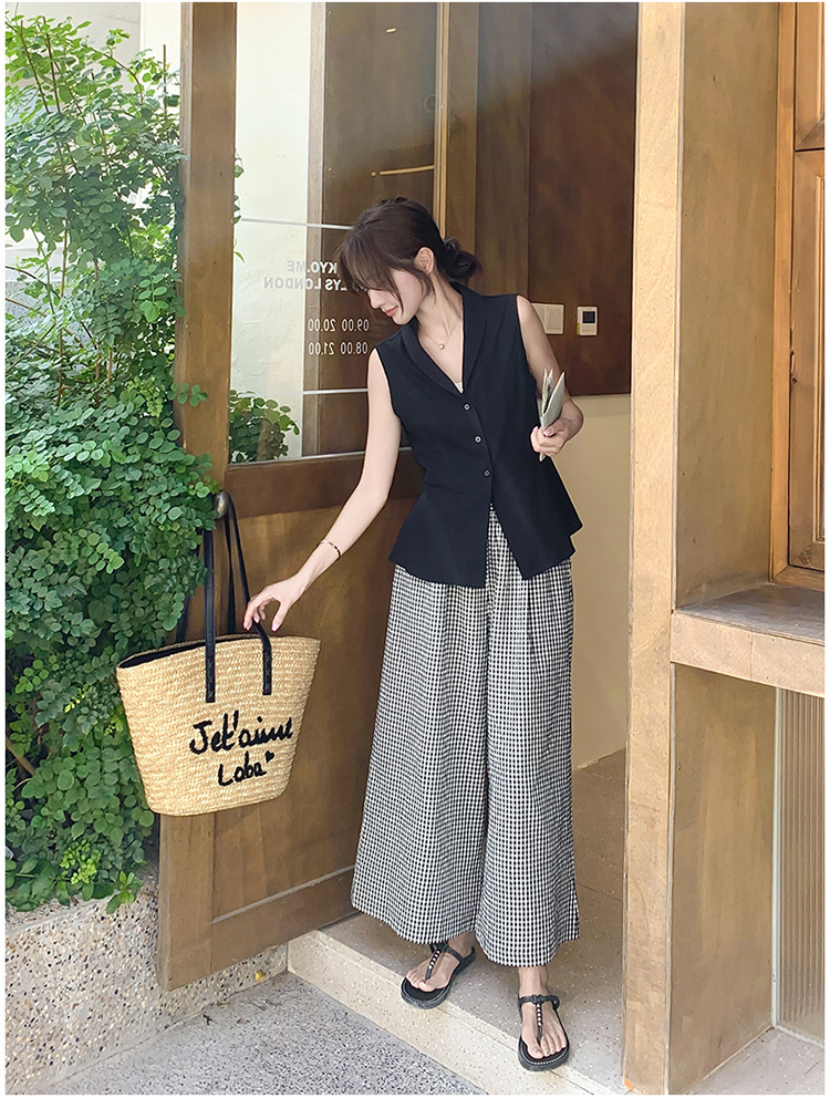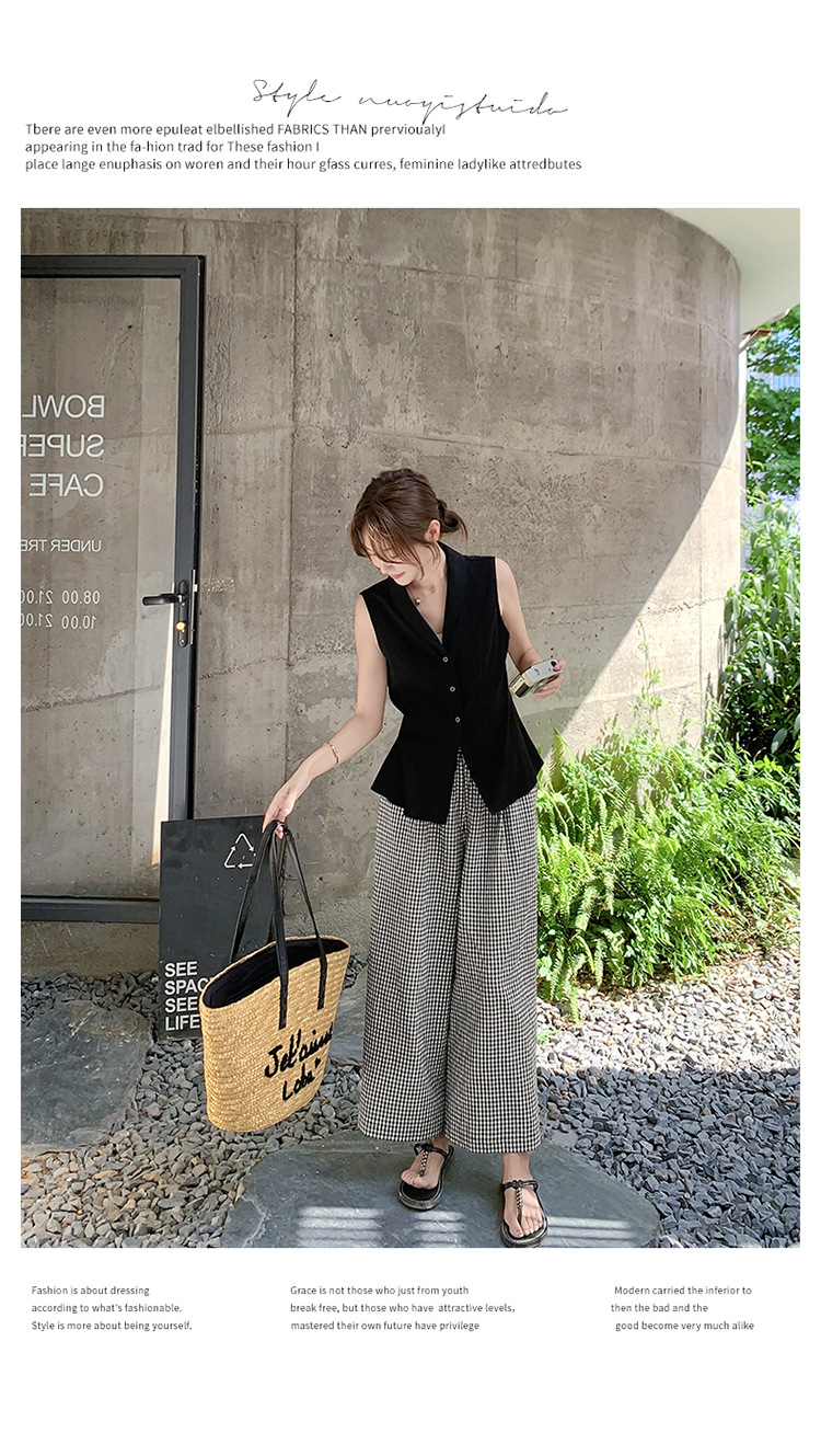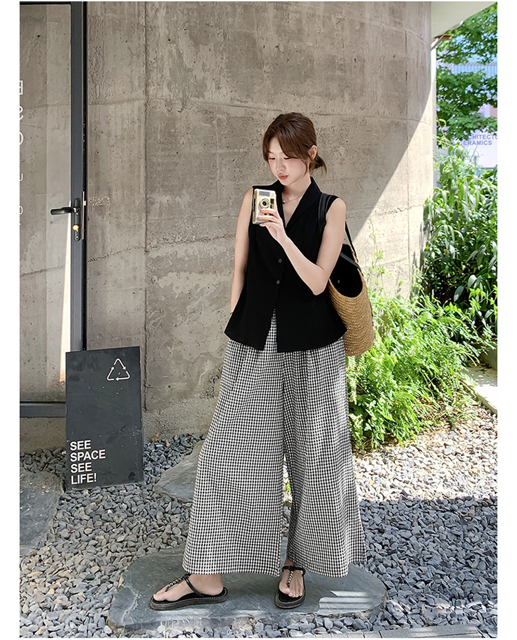 实拍御姐风黑色T恤格纹阔腿裤套装两件套女夏季温柔系又a又飒穿搭