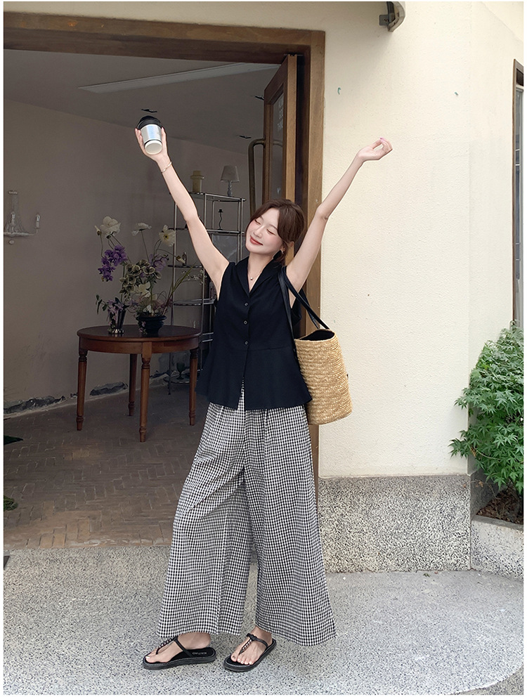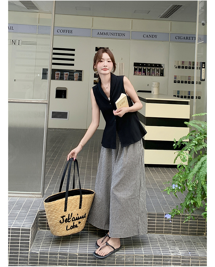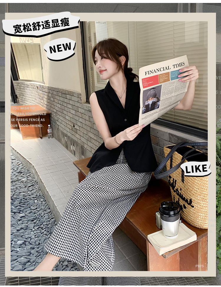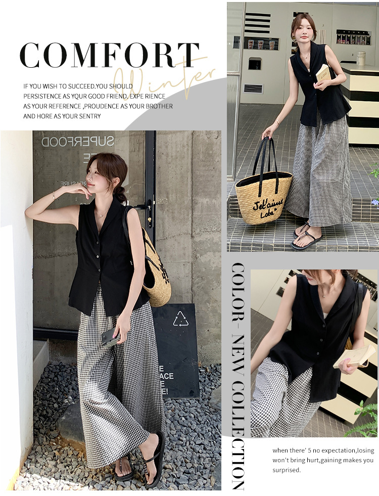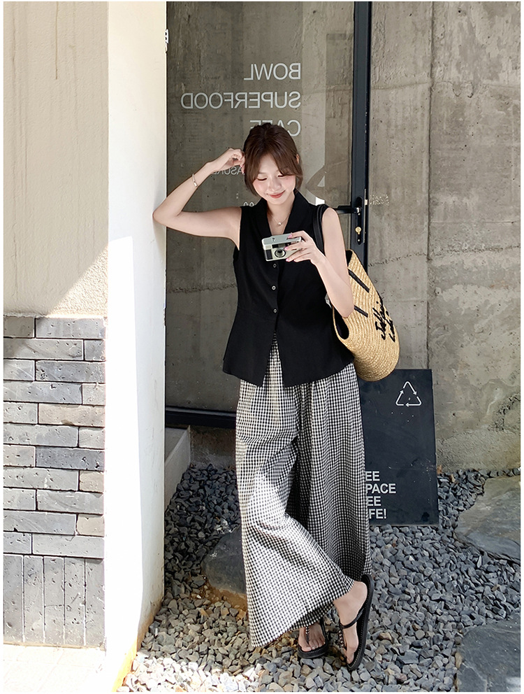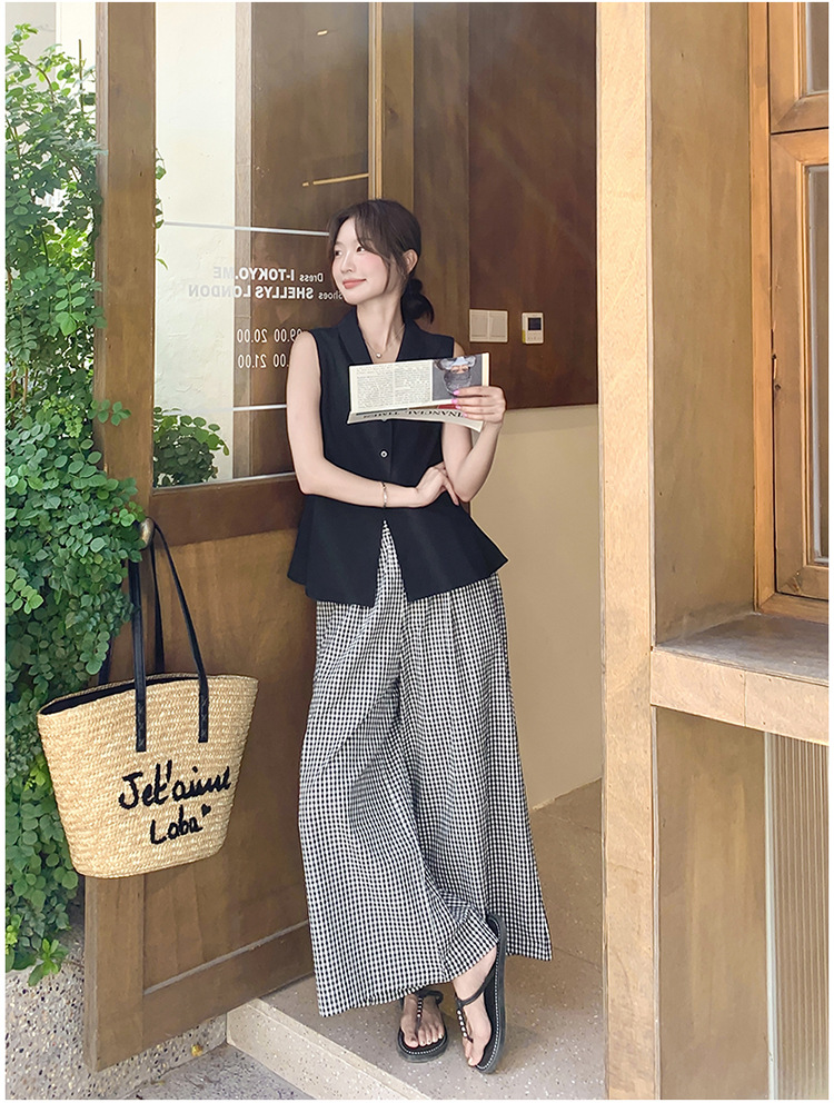 实拍御姐风黑色T恤格纹阔腿裤套装两件套女夏季温柔系又a又飒穿搭
