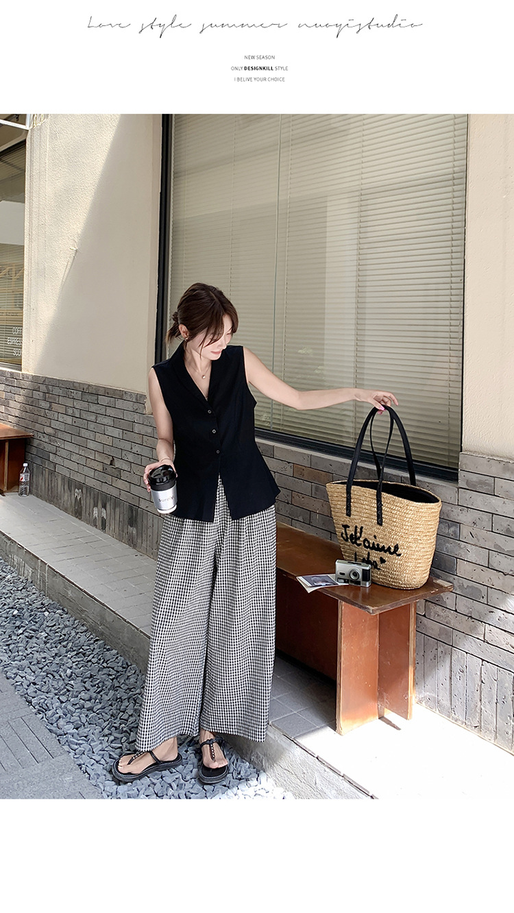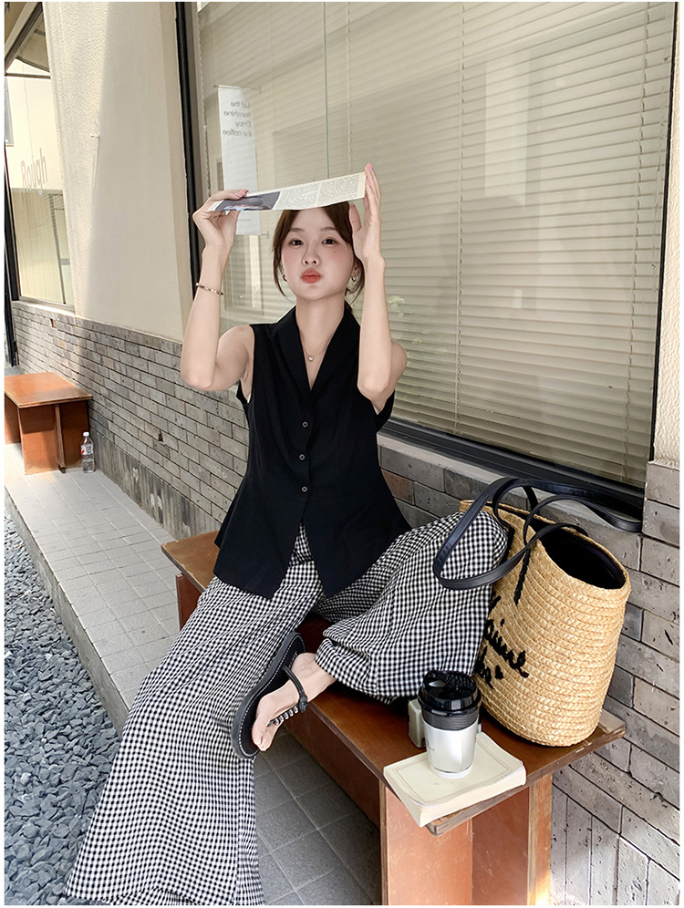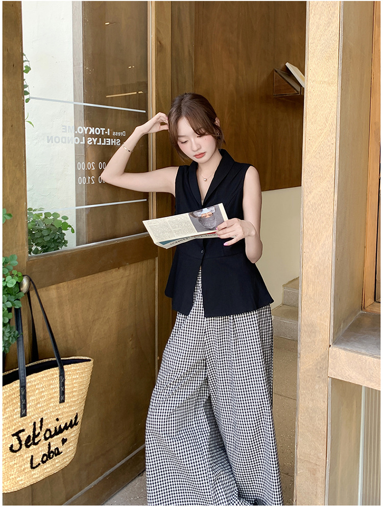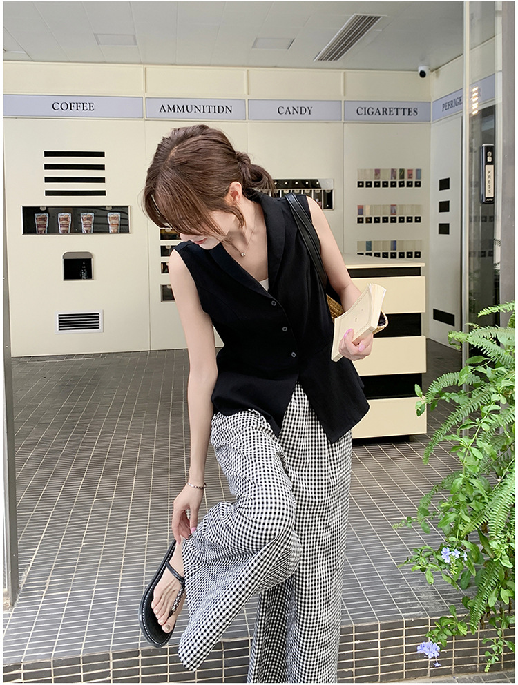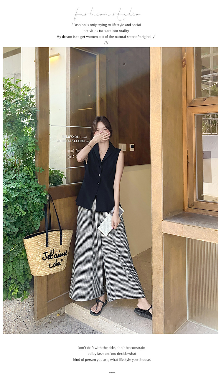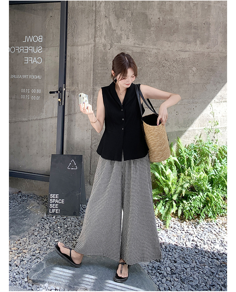 实拍御姐风黑色T恤格纹阔腿裤套装两件套女夏季温柔系又a又飒穿搭