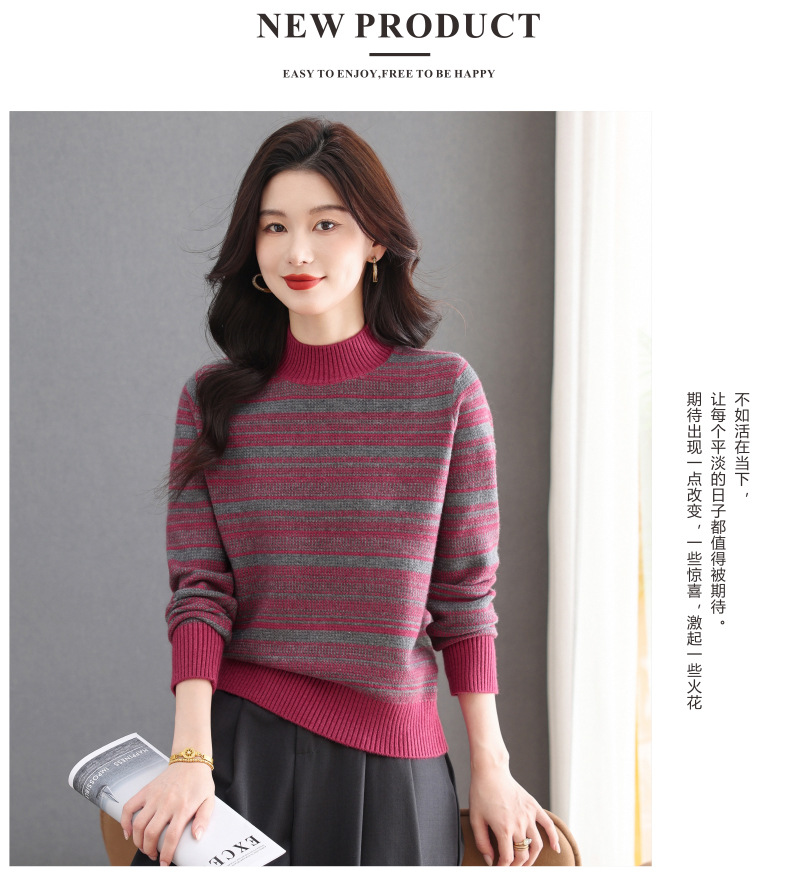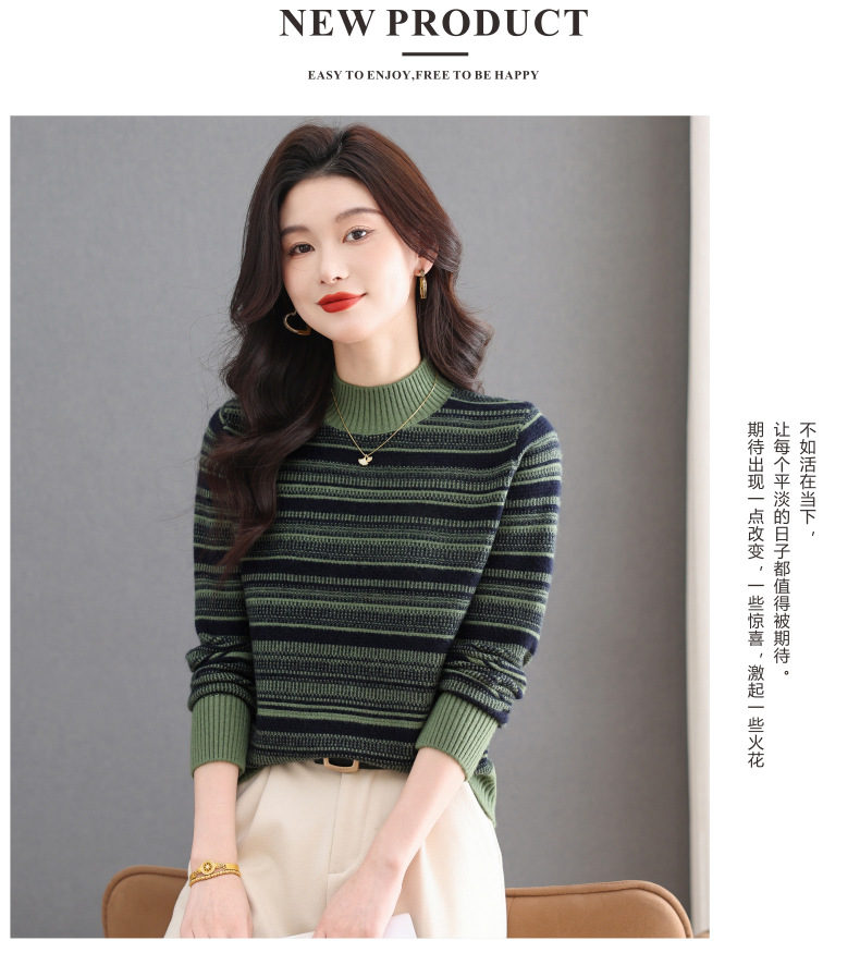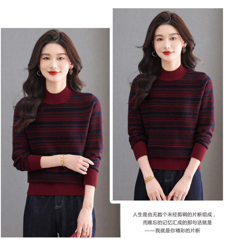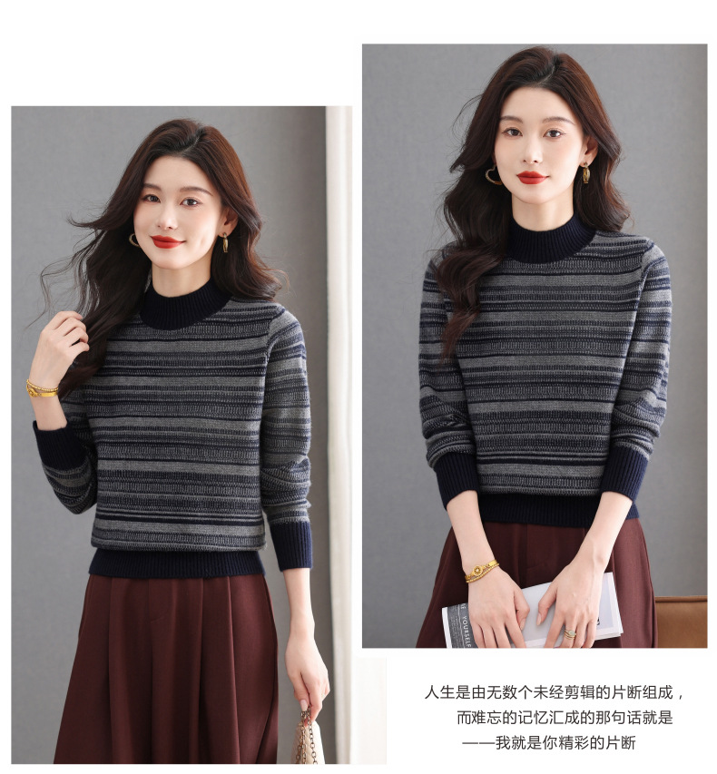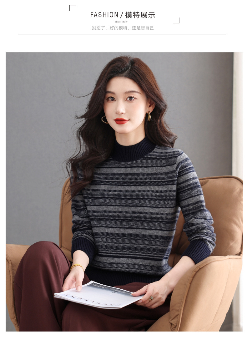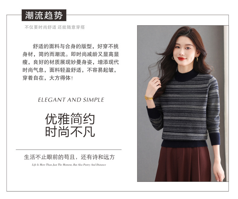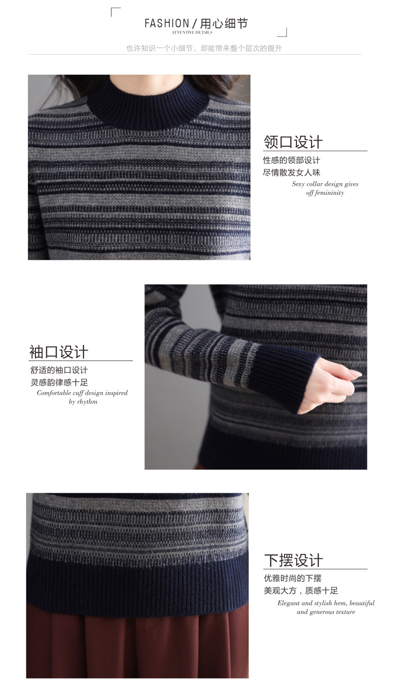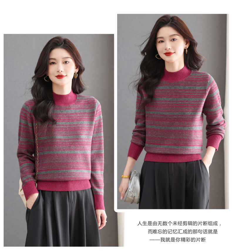 CC优雅时尚半高领条纹针织衫女秋冬新款修身显瘦撞色毛衣百搭打底衫