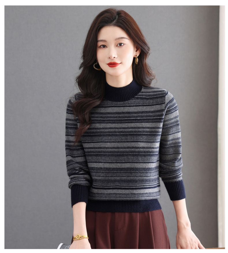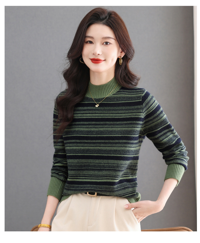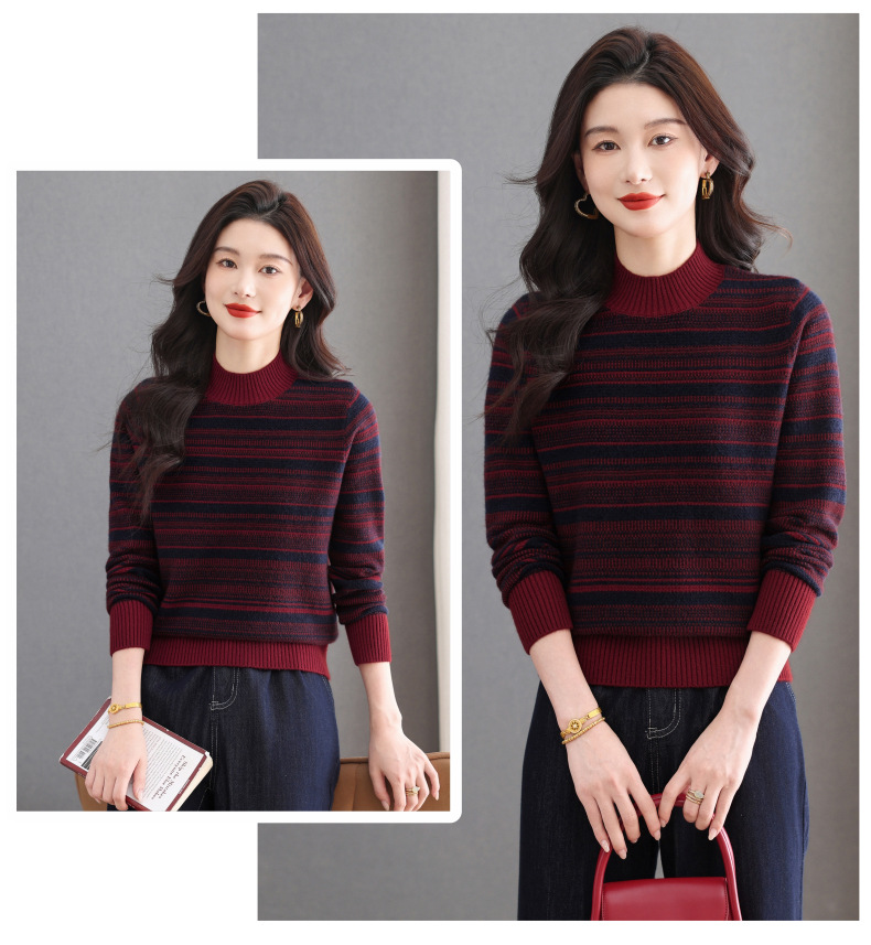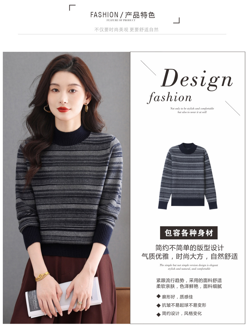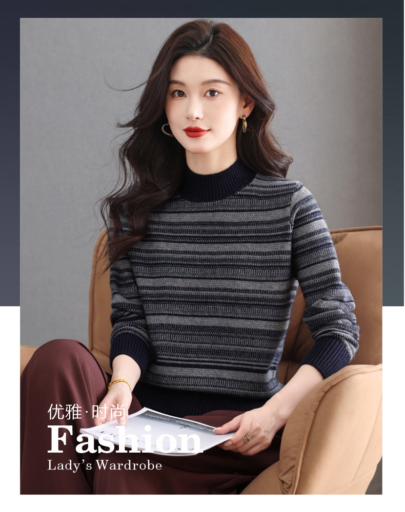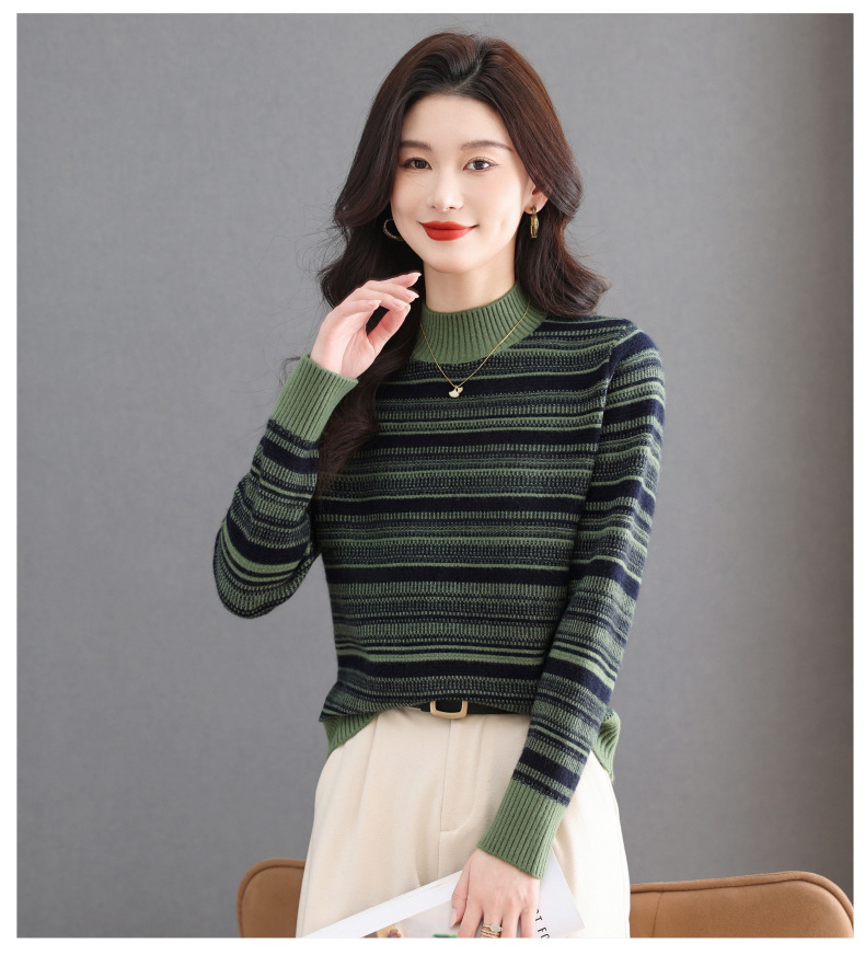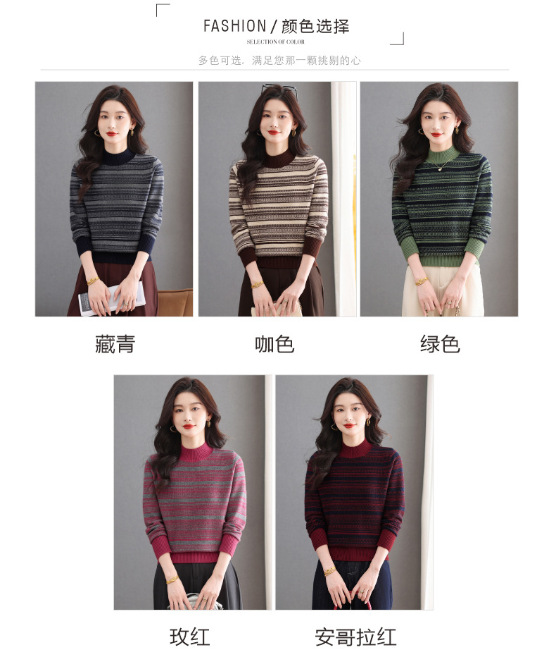 CC优雅时尚半高领条纹针织衫女秋冬新款修身显瘦撞色毛衣百搭打底衫
