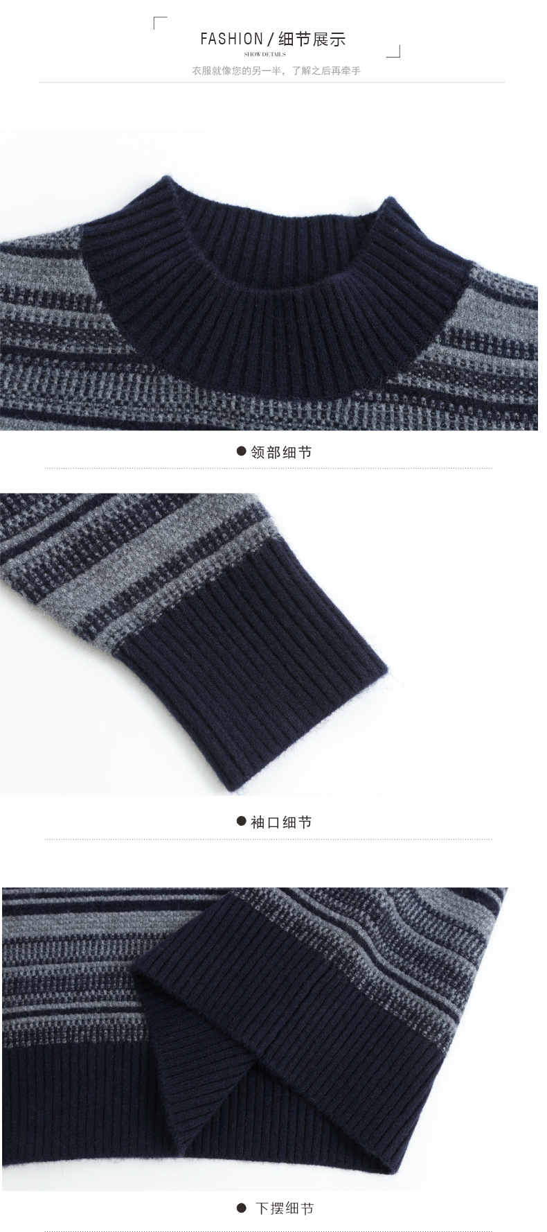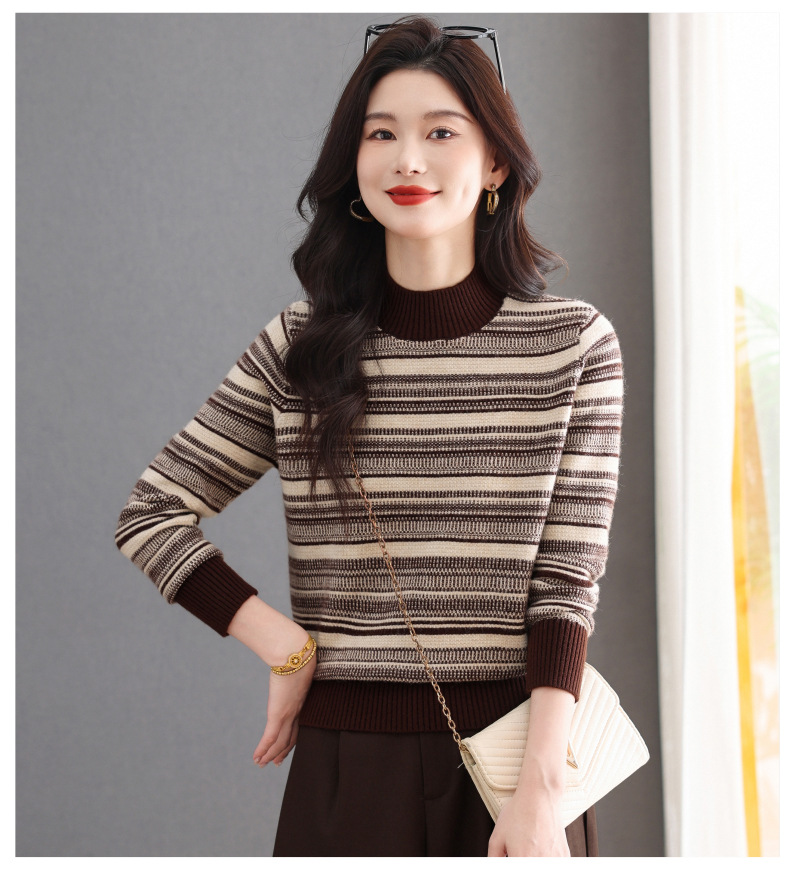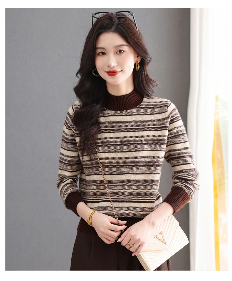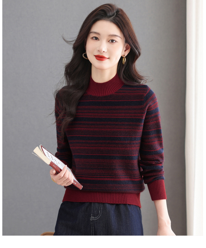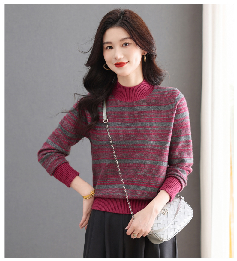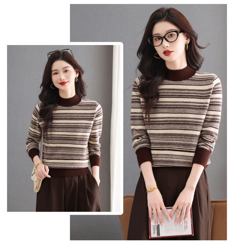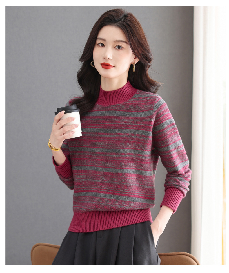 CC优雅时尚半高领条纹针织衫女秋冬新款修身显瘦撞色毛衣百搭打底衫