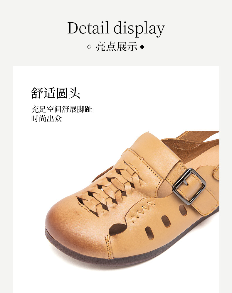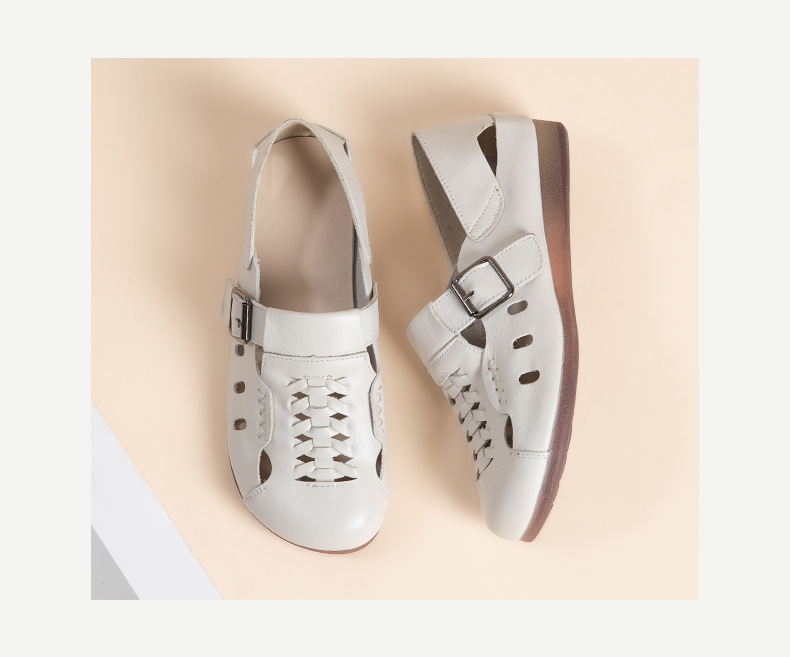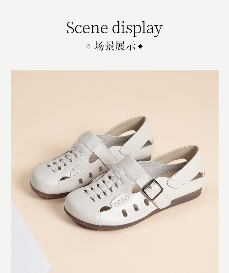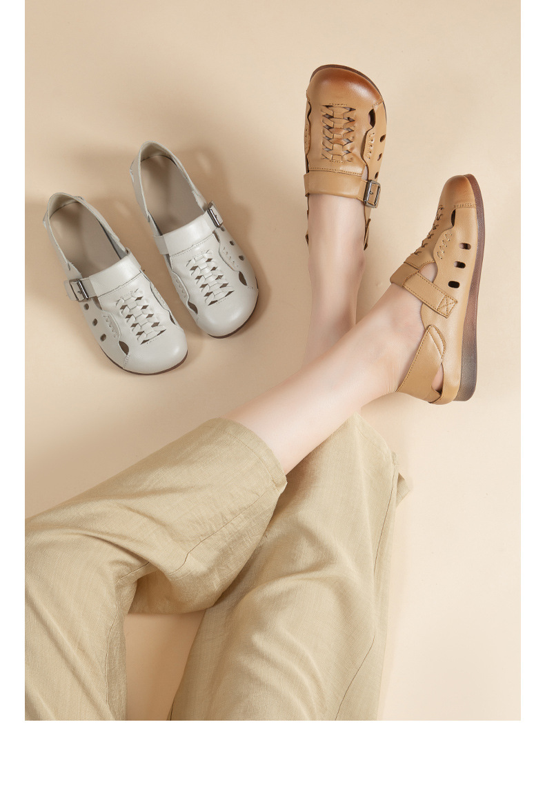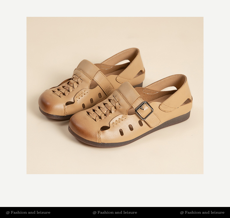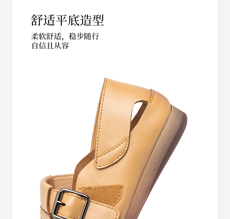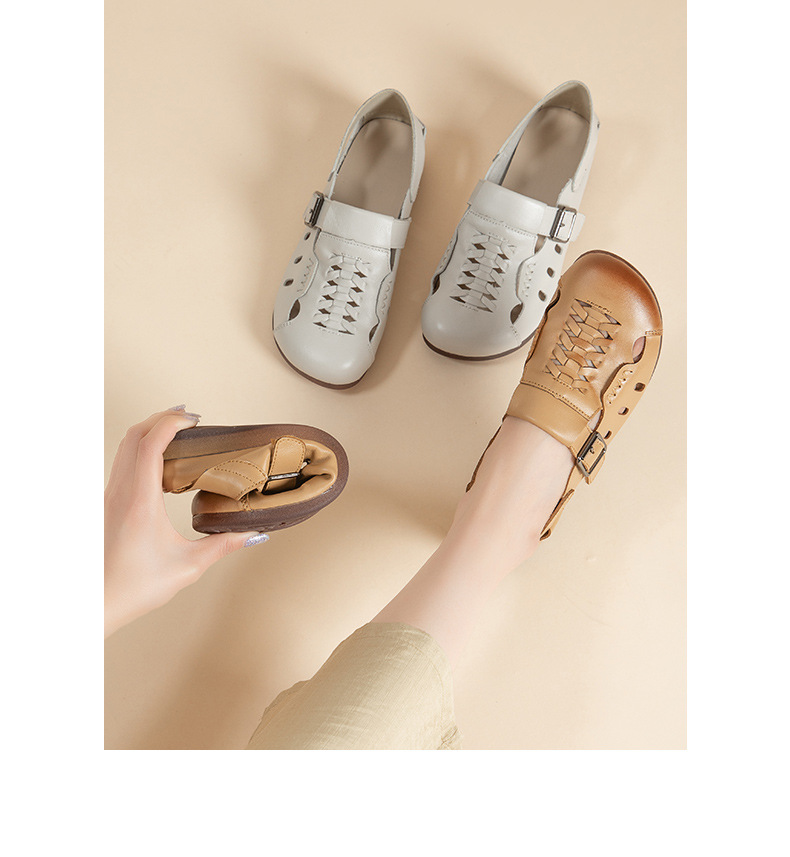 平跟牛筋软底妈妈凉鞋,镂空透气头层牛皮复古洞洞女鞋MLD-5323