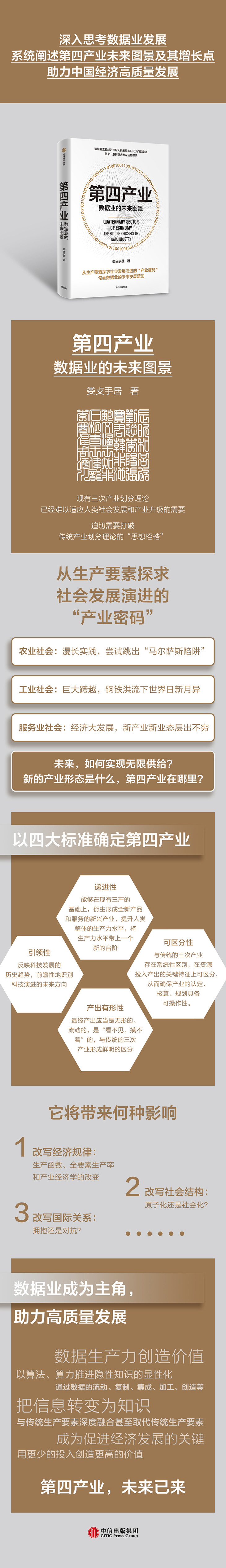 本书把产业变迁放在人类发展的历史长河中进行审视,从生产要素这一“小切口”入手,探求人类社会发展演进背后的“产业密码”和底层逻辑。作者从多个维度,对第四产业——数据业进行了精准画像,描绘了数据业的发展蓝图,也对数据业可能对产业变迁、经济规律、社会结构、国际关系等产生的一系列重大而深远的影响做了分析和阐述,构建起第四产业的理论和政策框架,是国内系统思考第四产业、数据业的开先河之作。