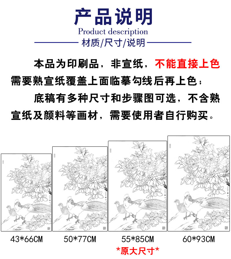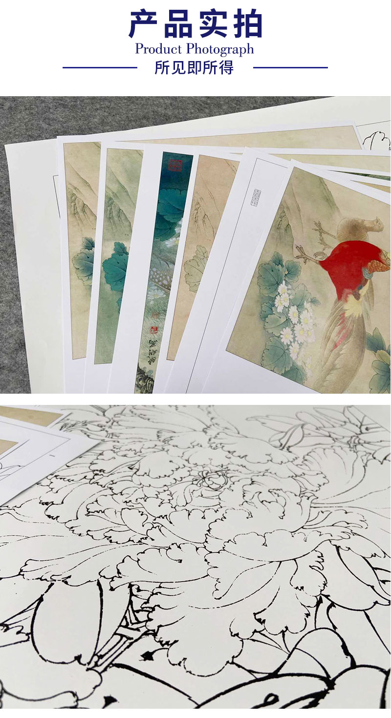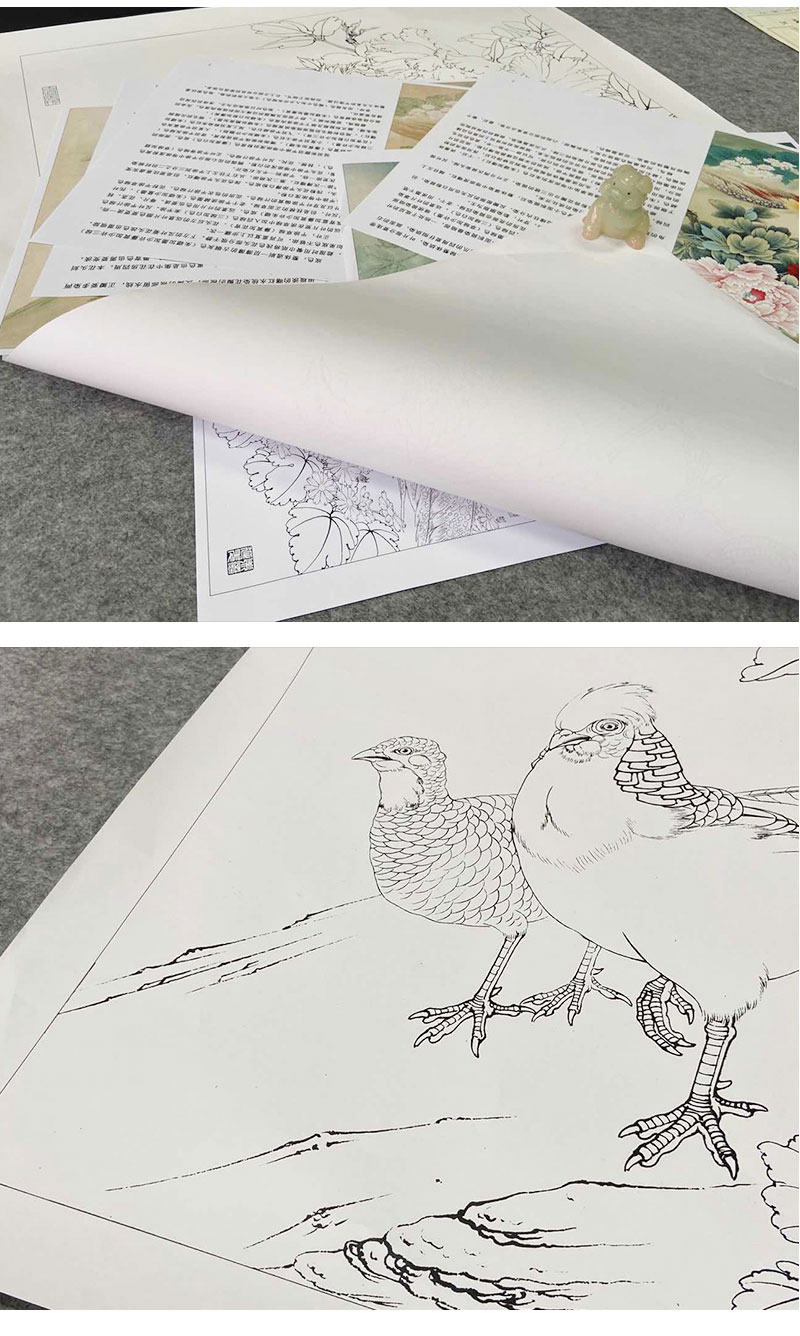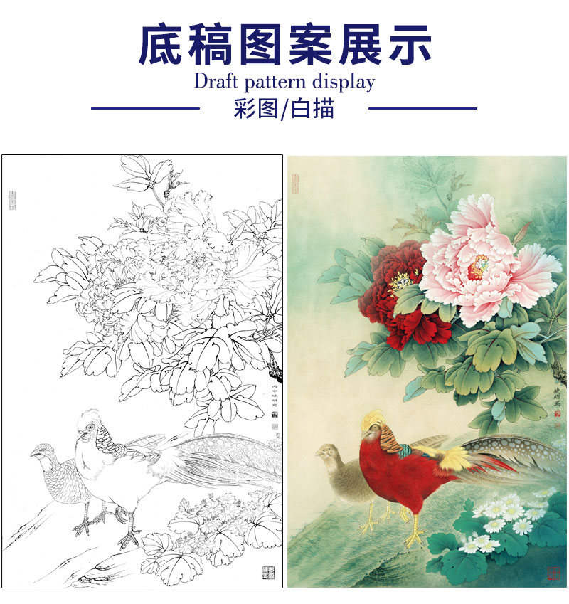 【有步骤、大彩图】李晓明工笔画白描底稿《锦鸡二乔图》牡丹初学者临摹花鸟线稿KD23