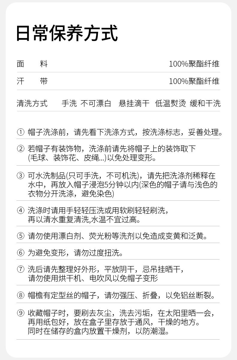 【其他注意事项】注意帽子的洗涤方式,每顶帽子都有吊牌