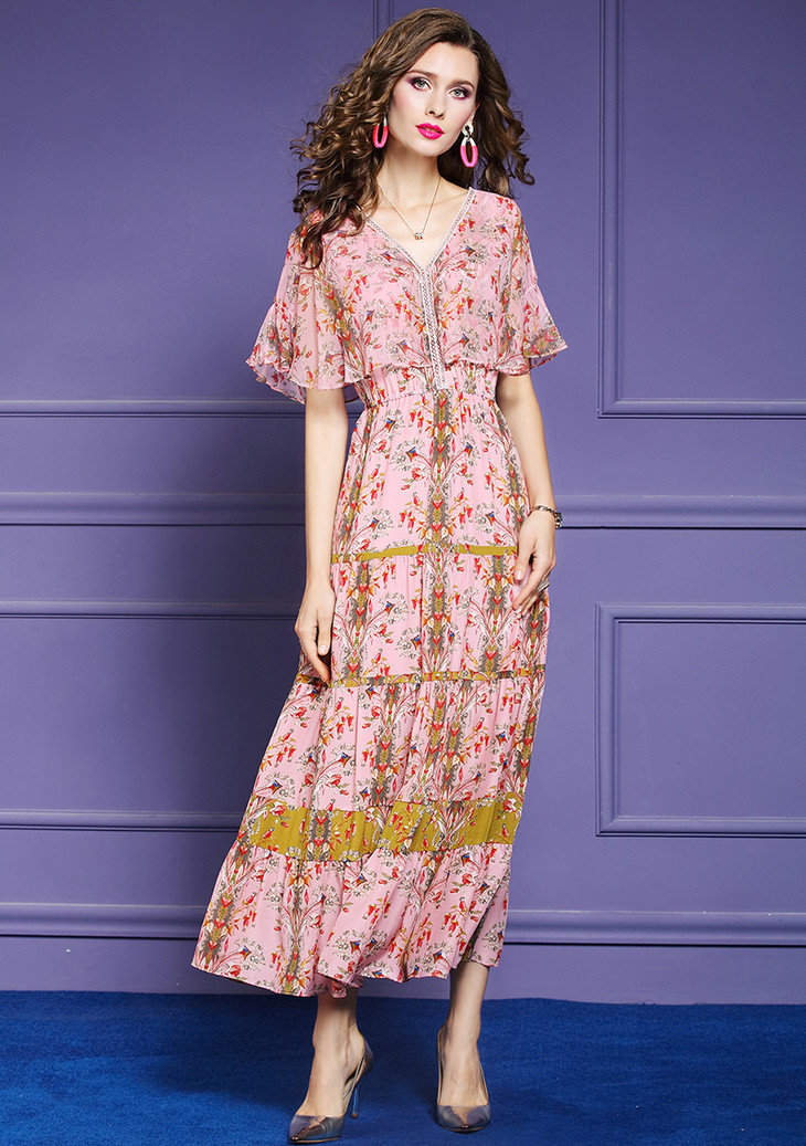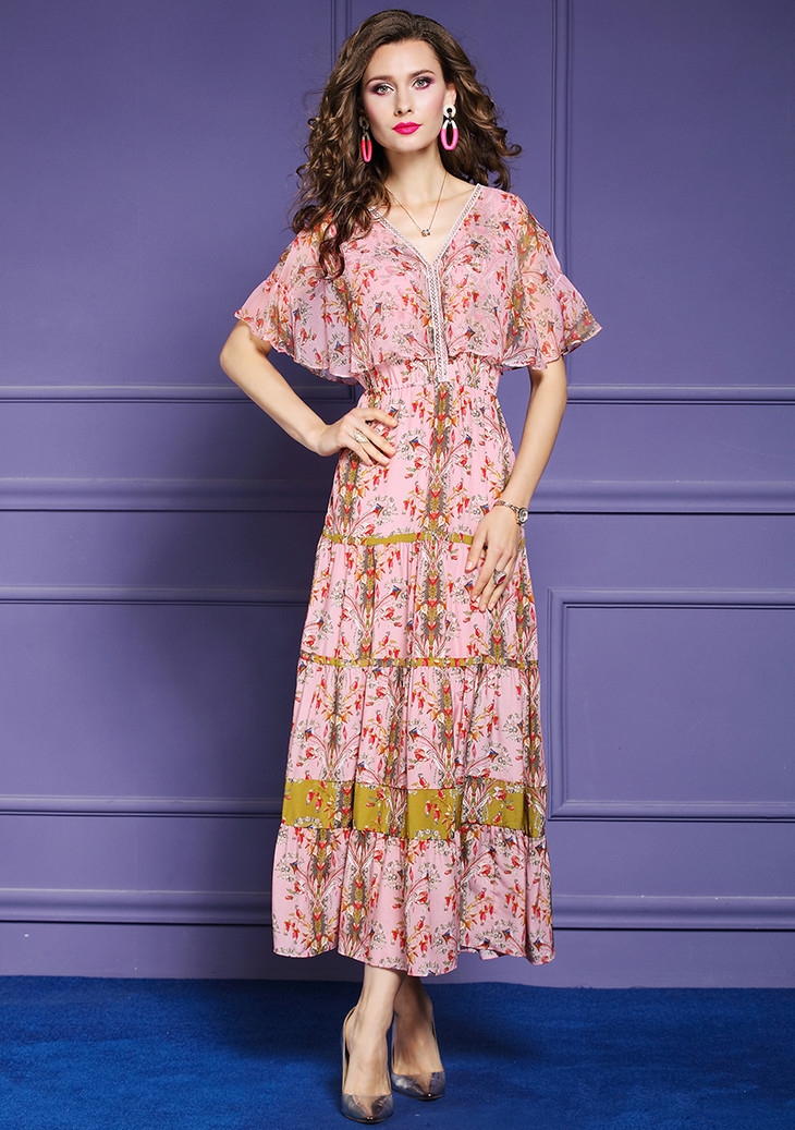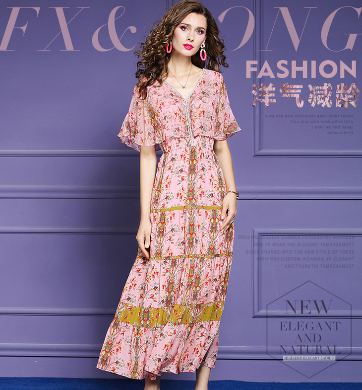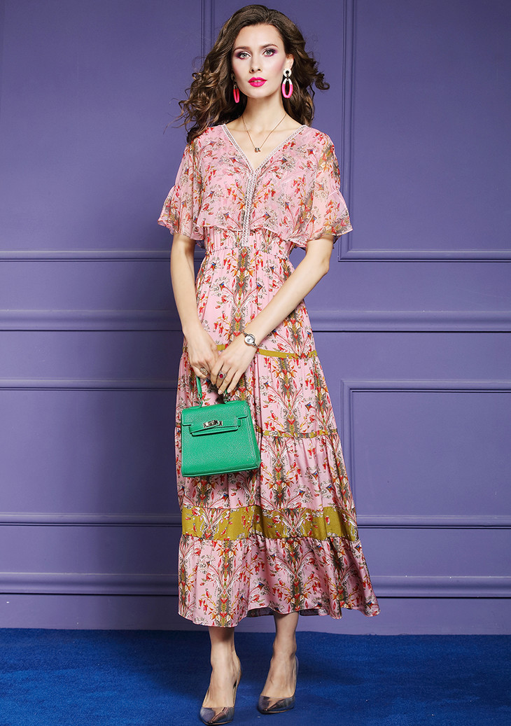 FMY-F20XL30761夏年轻款减龄显瘦V领桑蚕丝印花真丝连衣裙