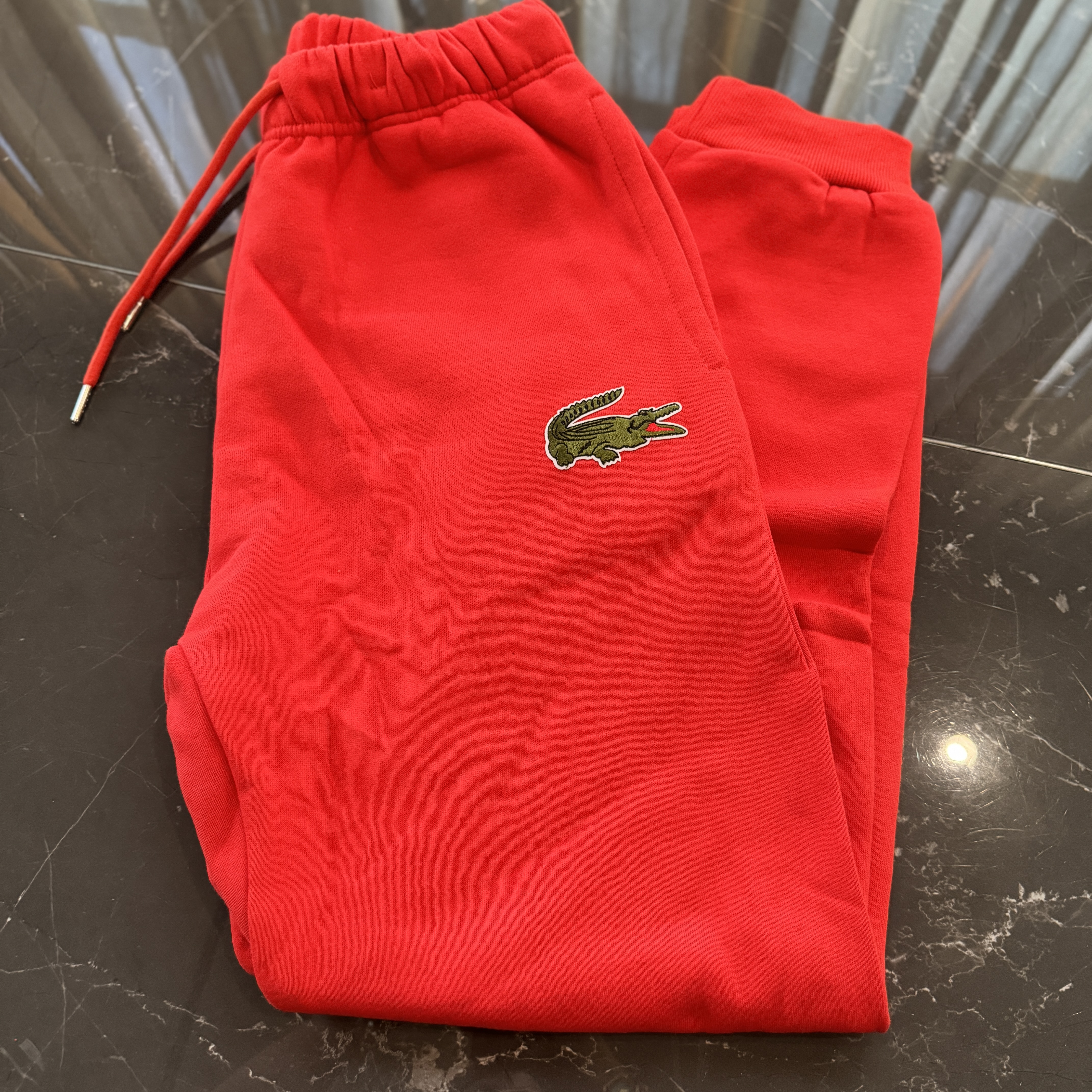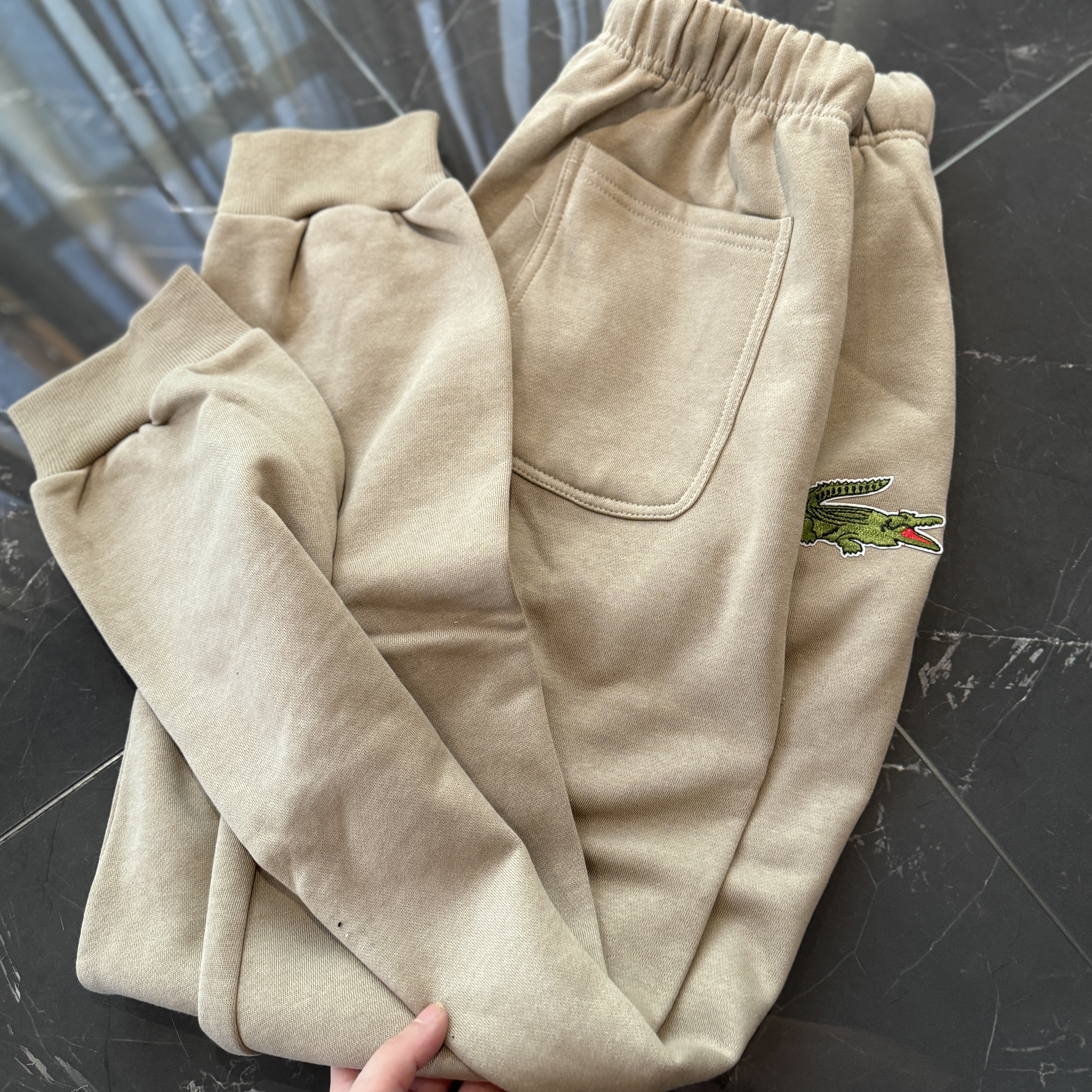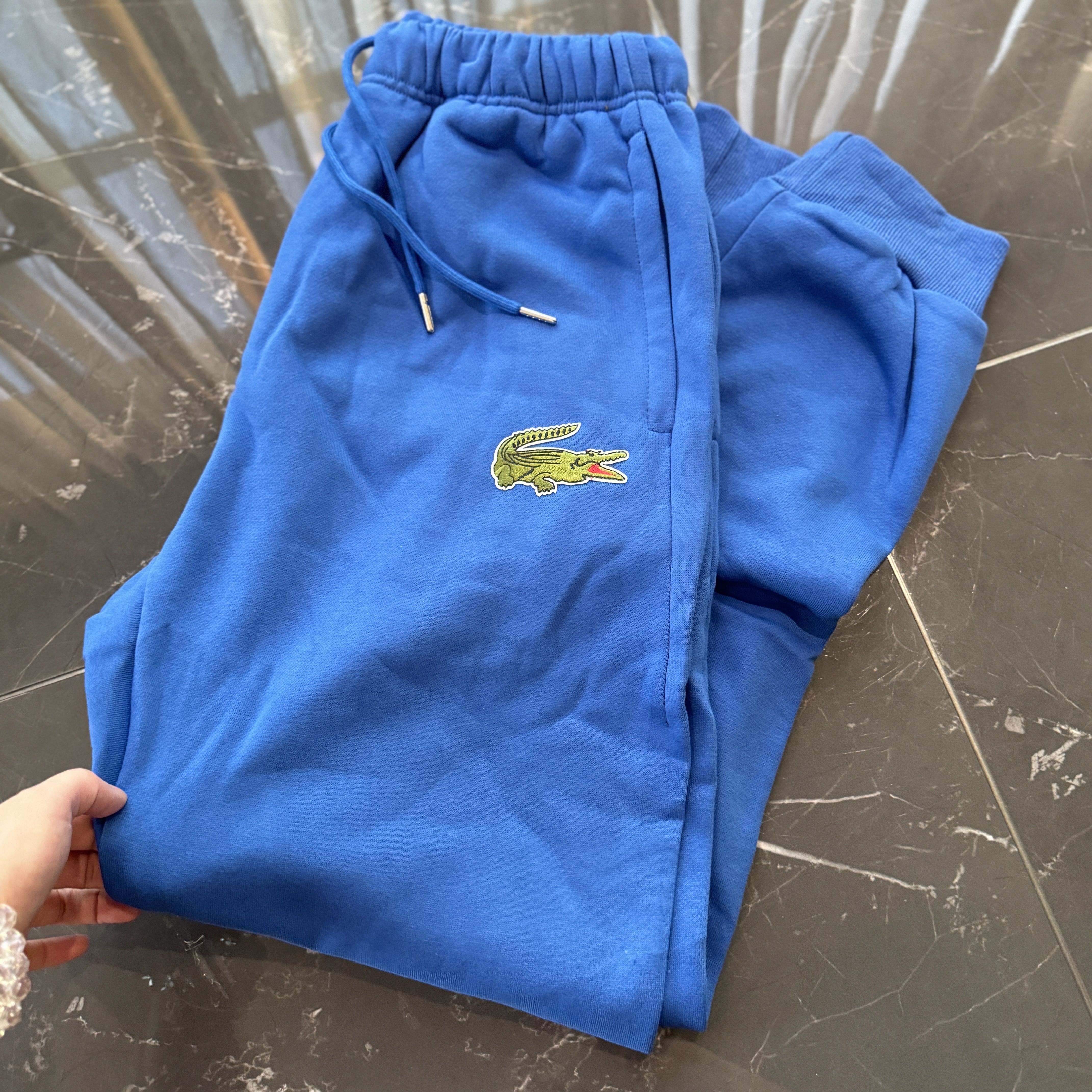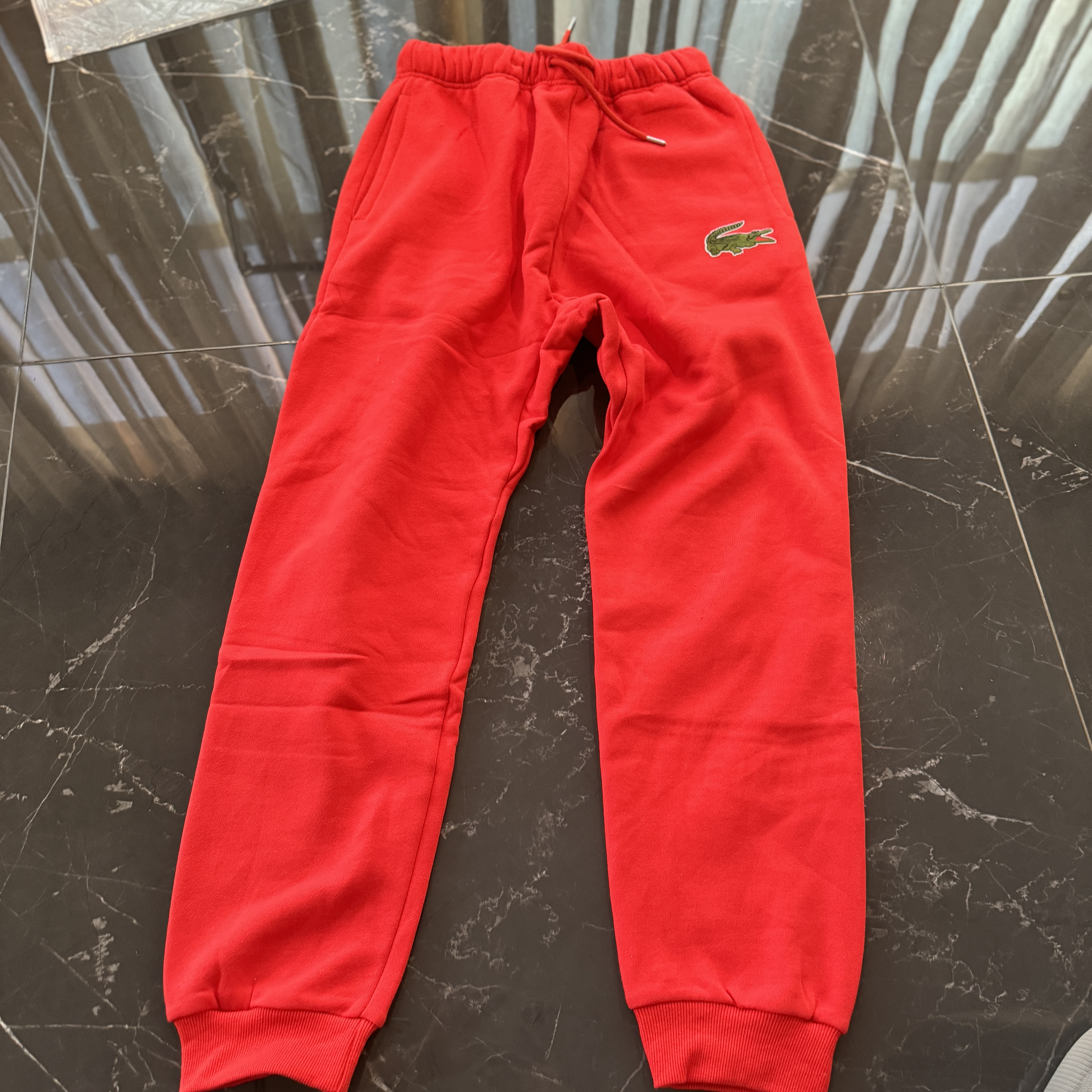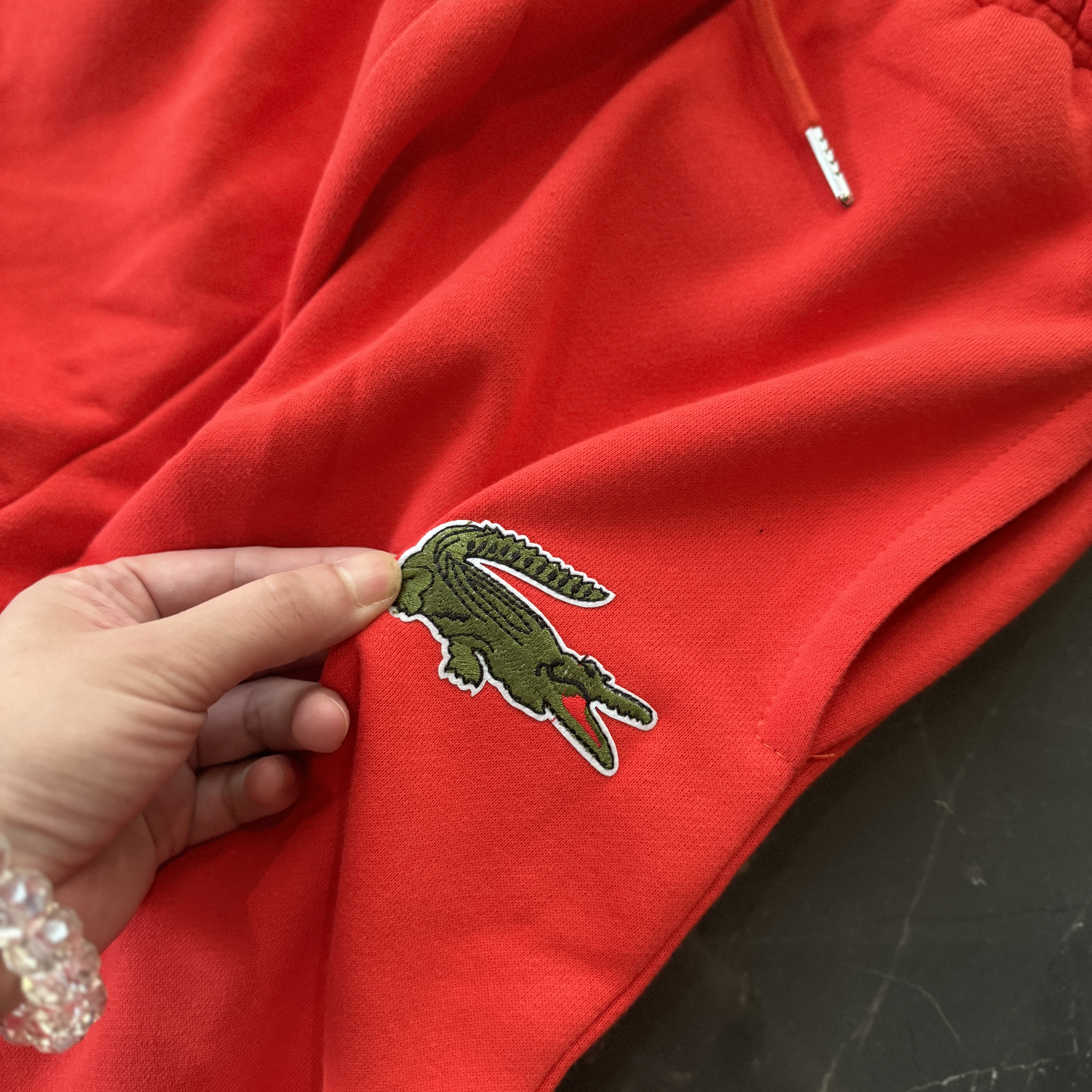 5色:黑色 浅灰色 卡其 蓝色。红色 上身百搭轻松!鳄鱼刺绣好看吸引眼球。简约款式 无复杂大logo。不挑身材 不挑人 随随便便¥1000官价。 很超值。不起球 !摸起来跟婴儿肌肤一样!一点儿都不夸张!比普通卫裤强的不止一点儿半点儿!推荐货。