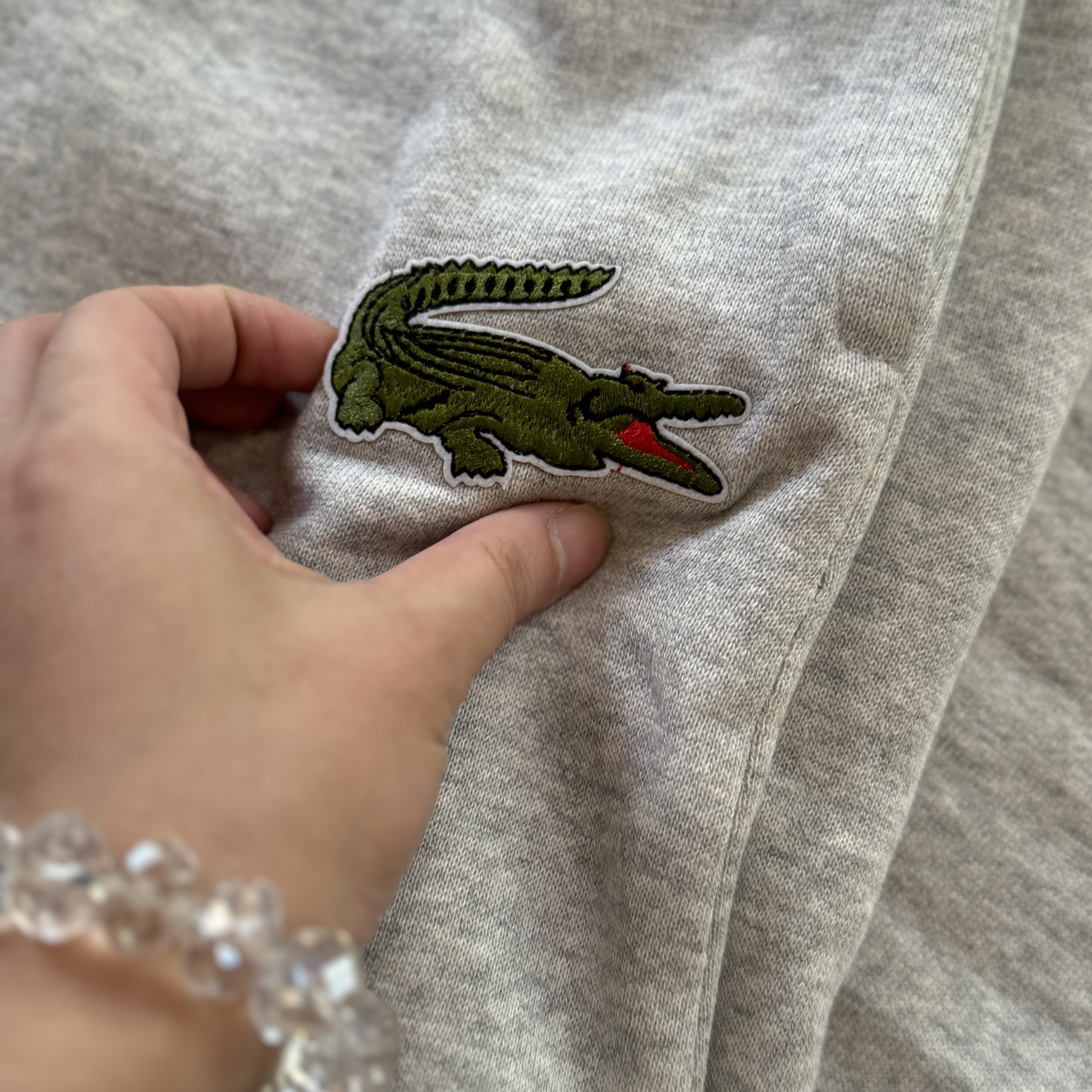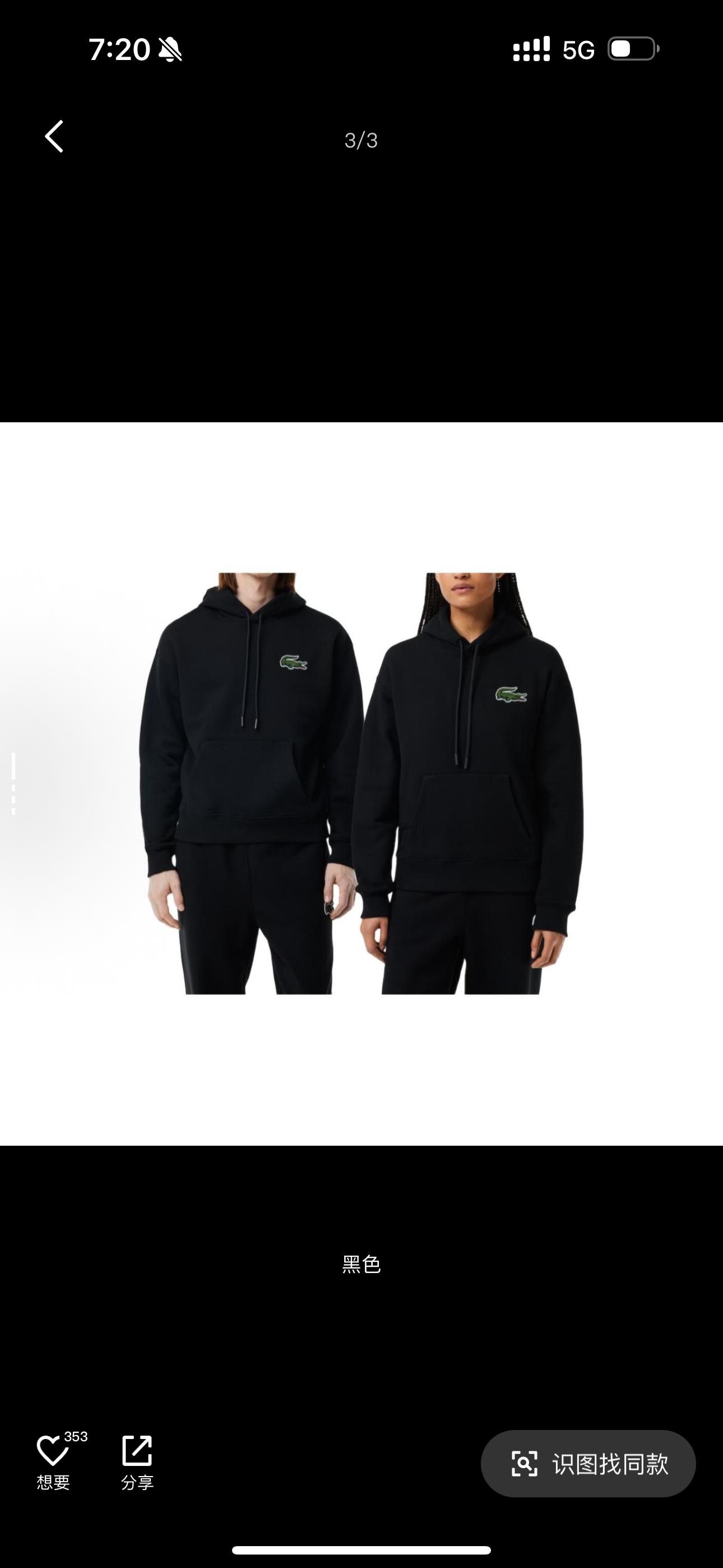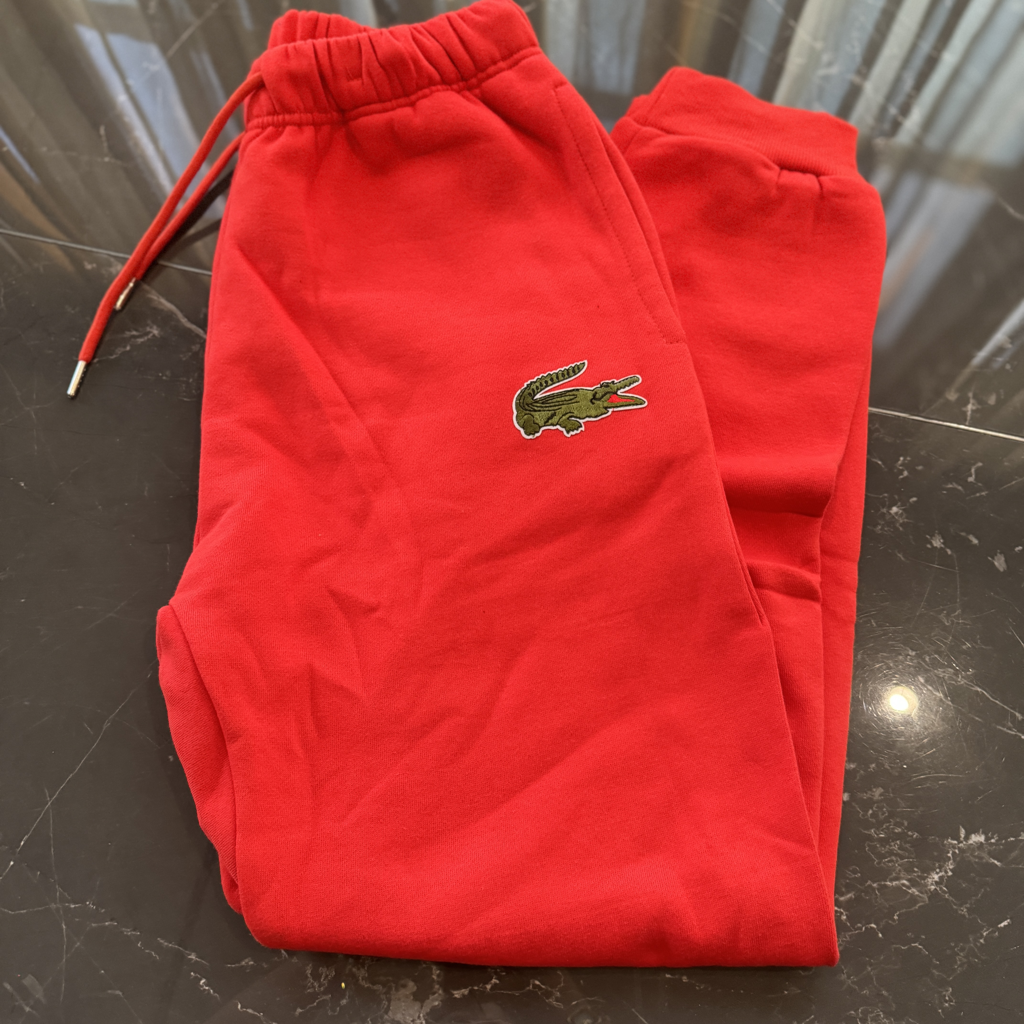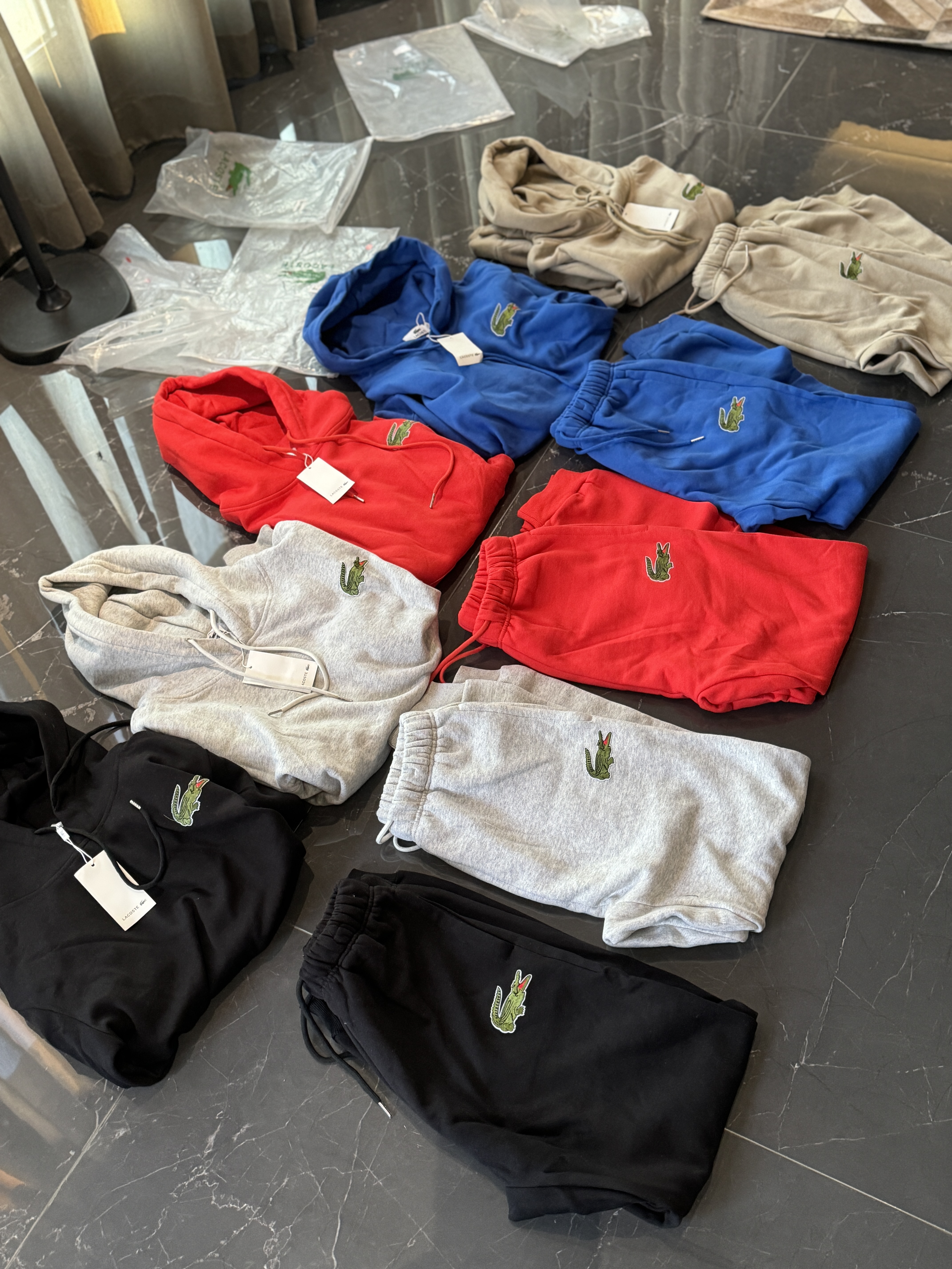 5色:黑色 浅灰色 卡其 蓝色。红色 上身百搭轻松!鳄鱼刺绣好看吸引眼球。简约款式 无复杂大logo。不挑身材 不挑人 随随便便¥1000官价。 很超值。不起球 !摸起来跟婴儿肌肤一样!一点儿都不夸张!比普通卫裤强的不止一点儿半点儿!推荐货。