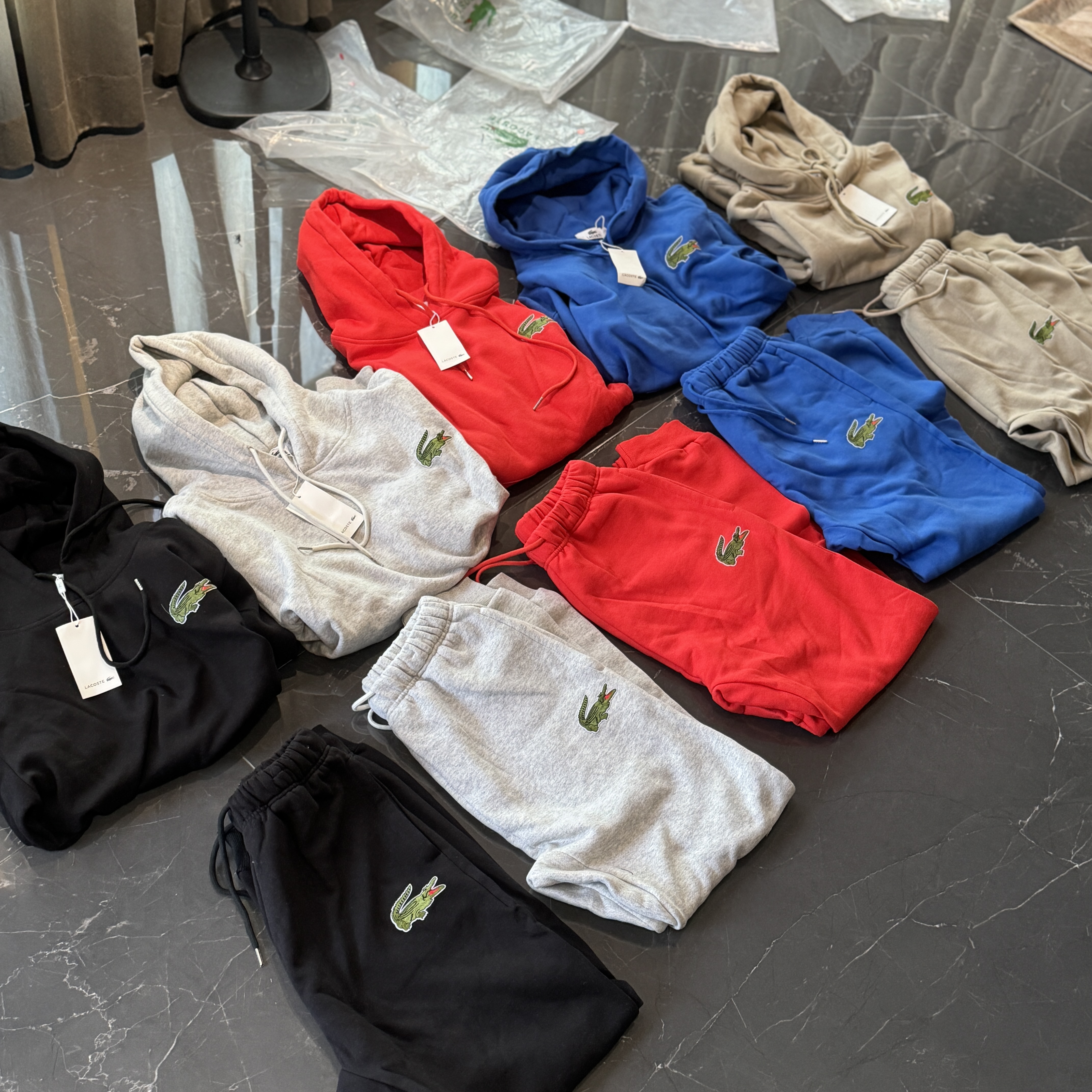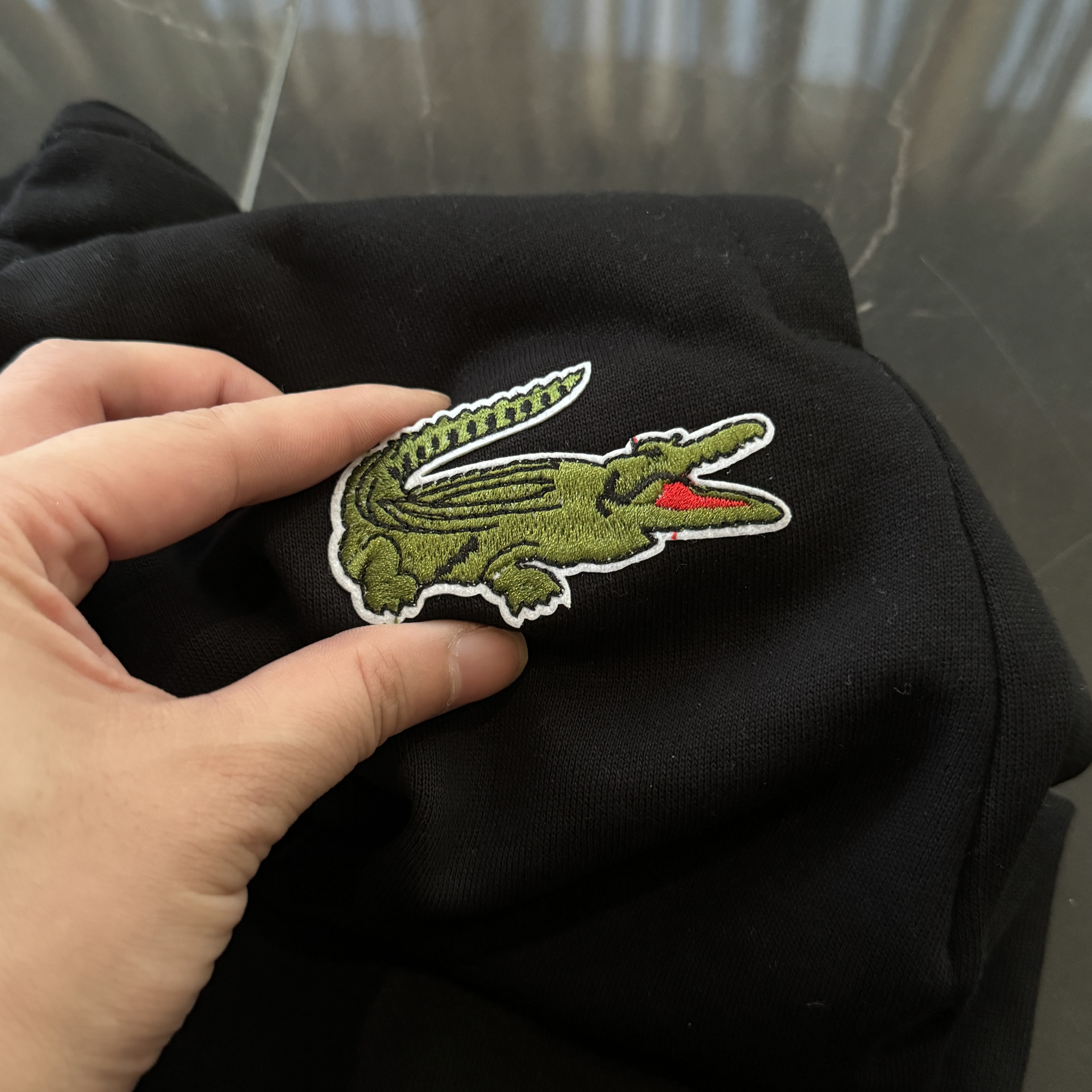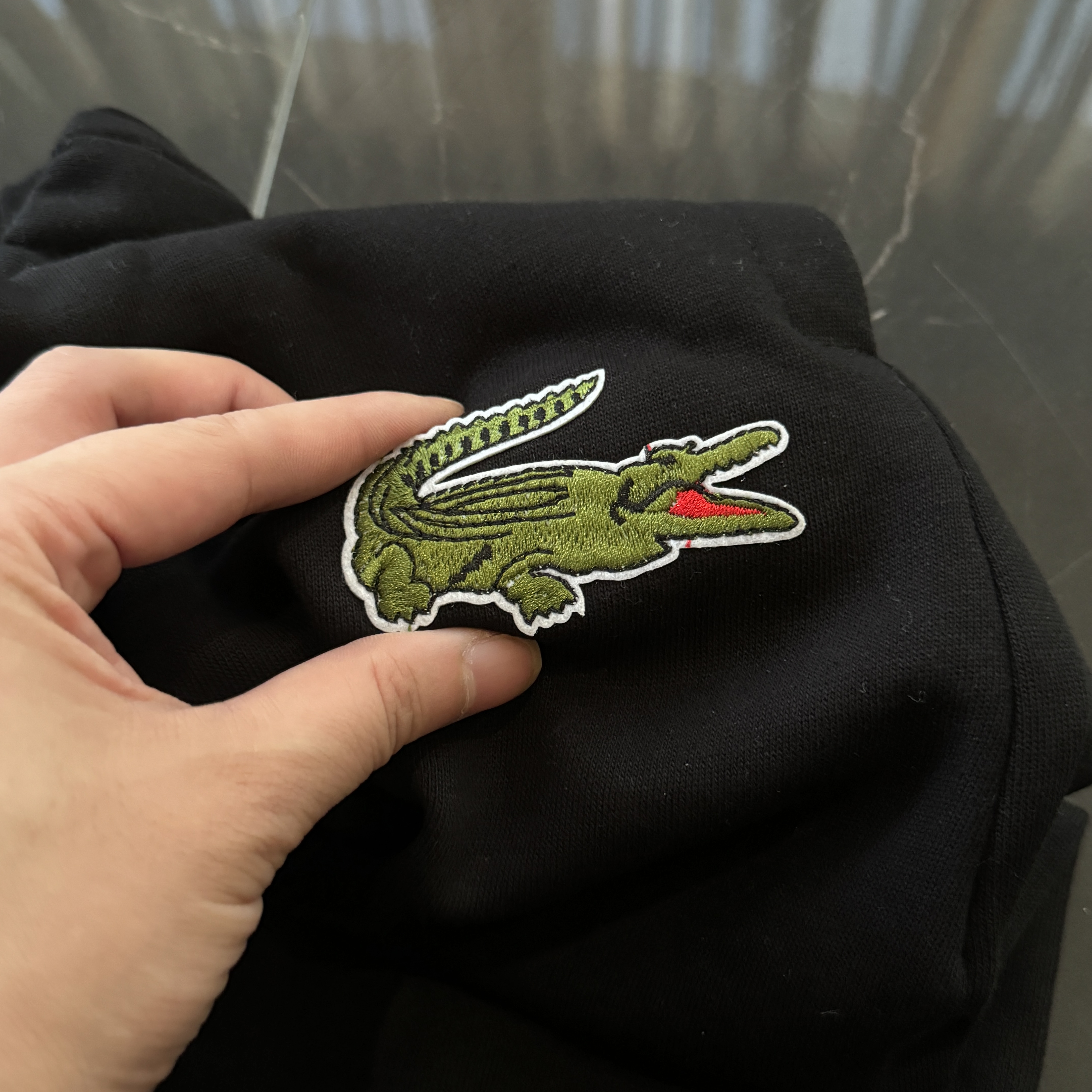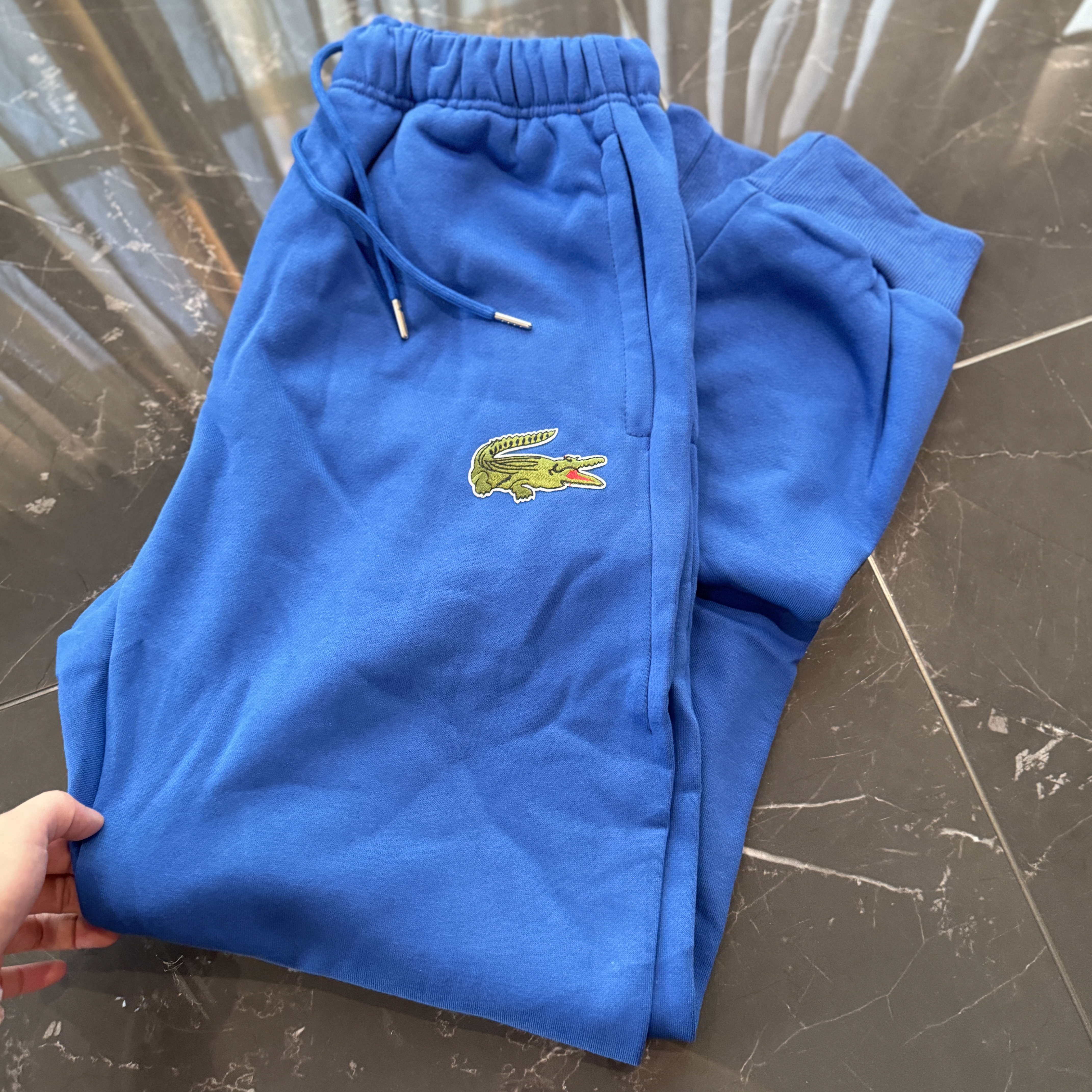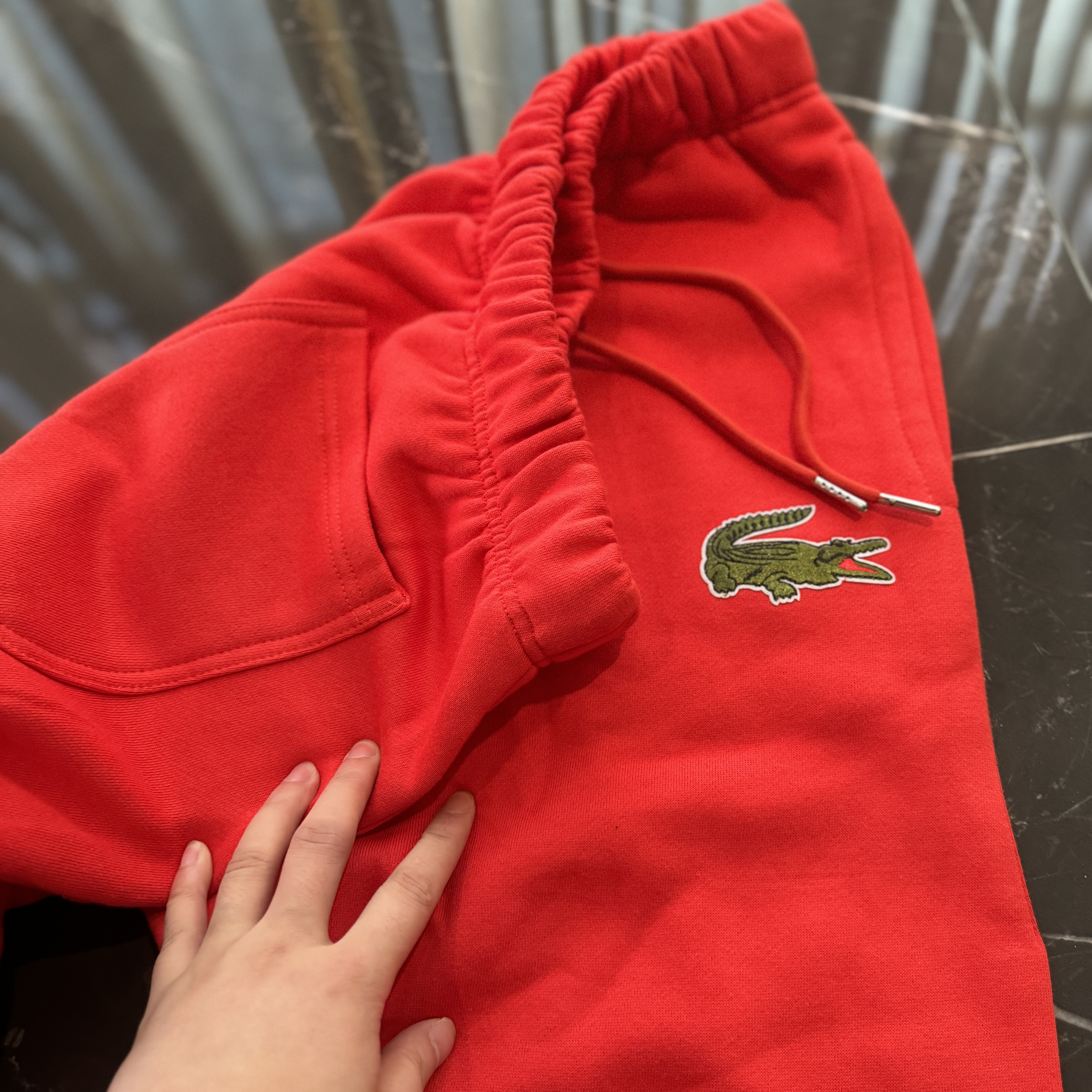 5色:黑色 浅灰色 卡其 蓝色。红色 上身百搭轻松!鳄鱼刺绣好看吸引眼球。简约款式 无复杂大logo。不挑身材 不挑人 随随便便¥1000官价。 很超值。不起球 !摸起来跟婴儿肌肤一样!一点儿都不夸张!比普通卫裤强的不止一点儿半点儿!推荐货。