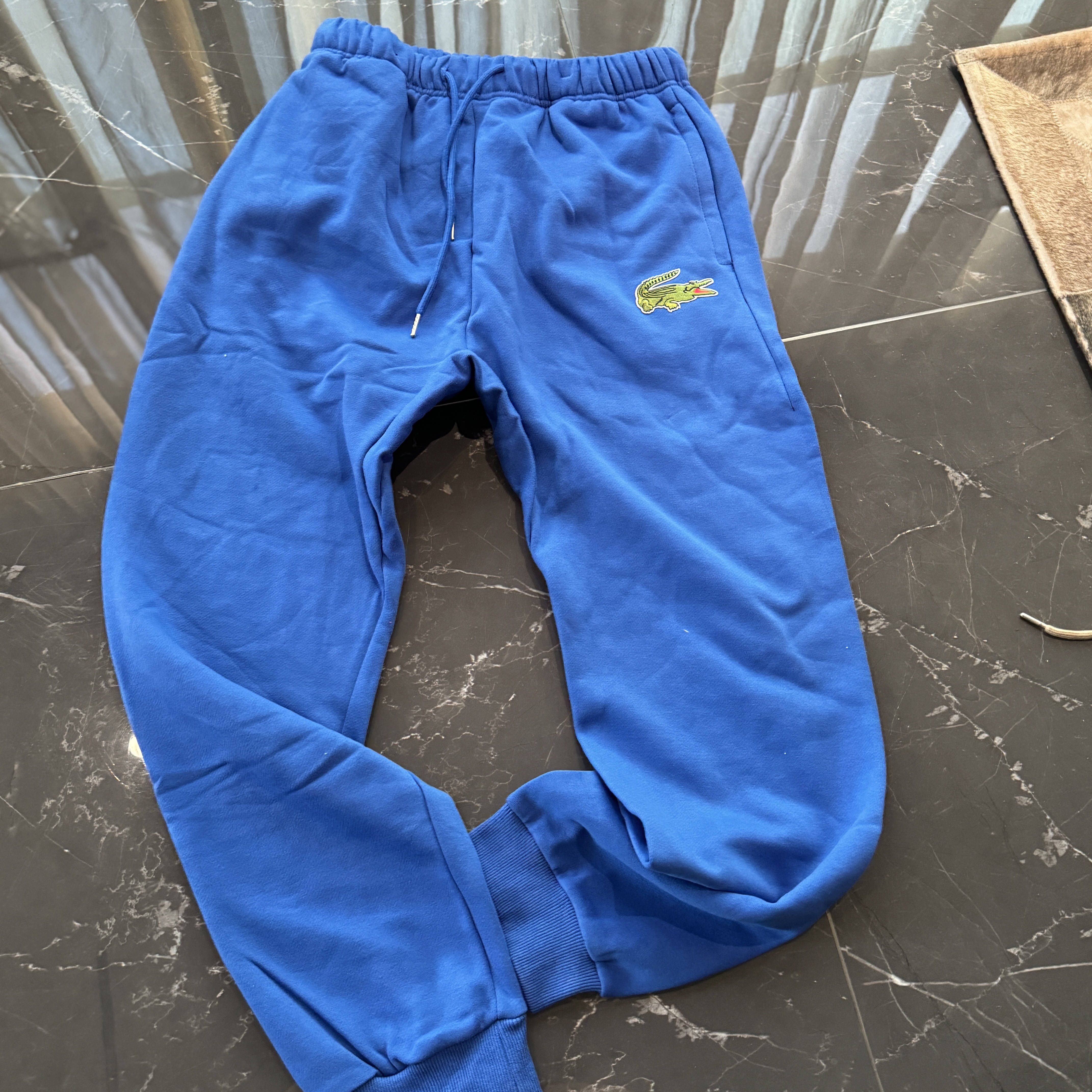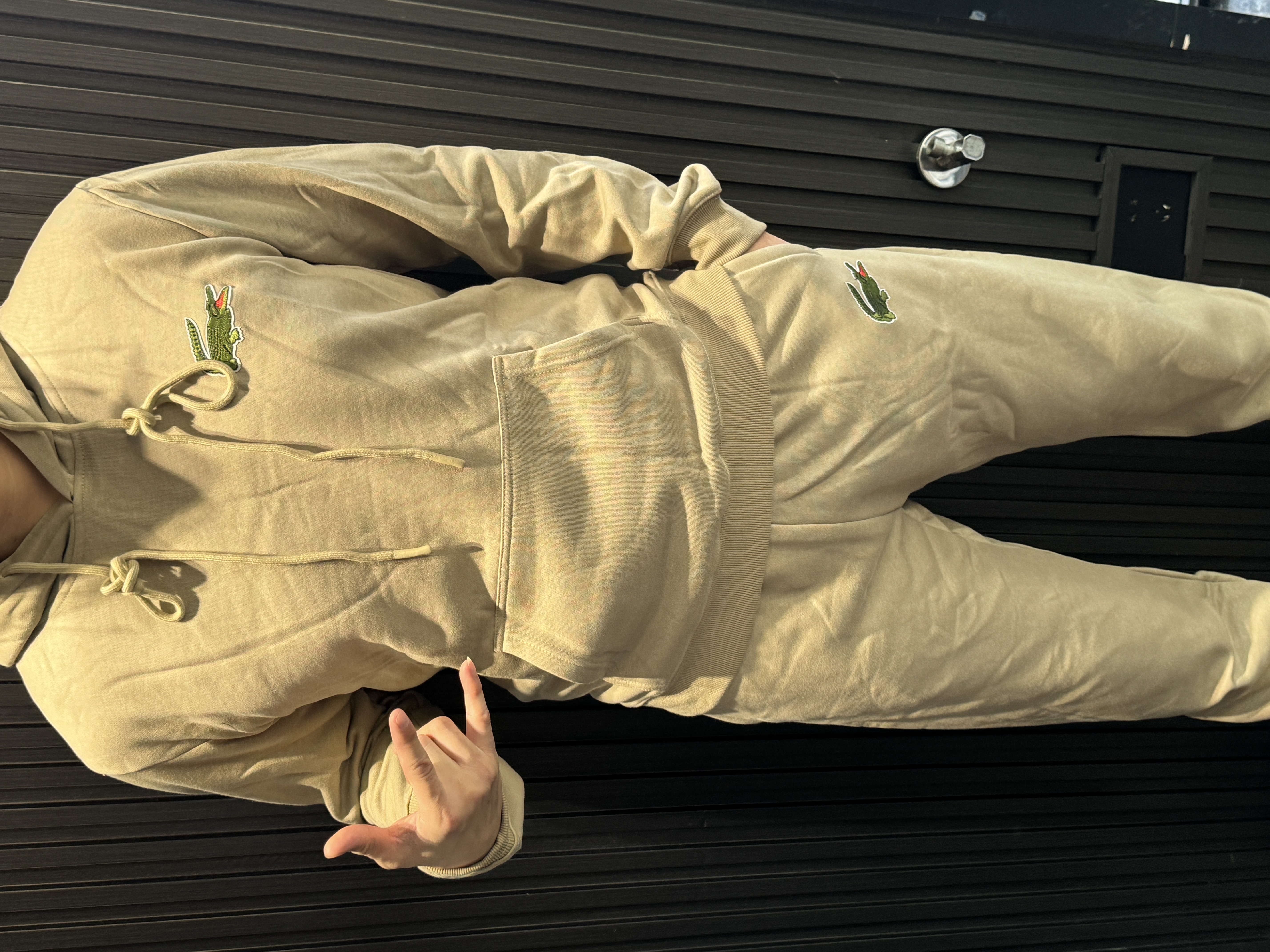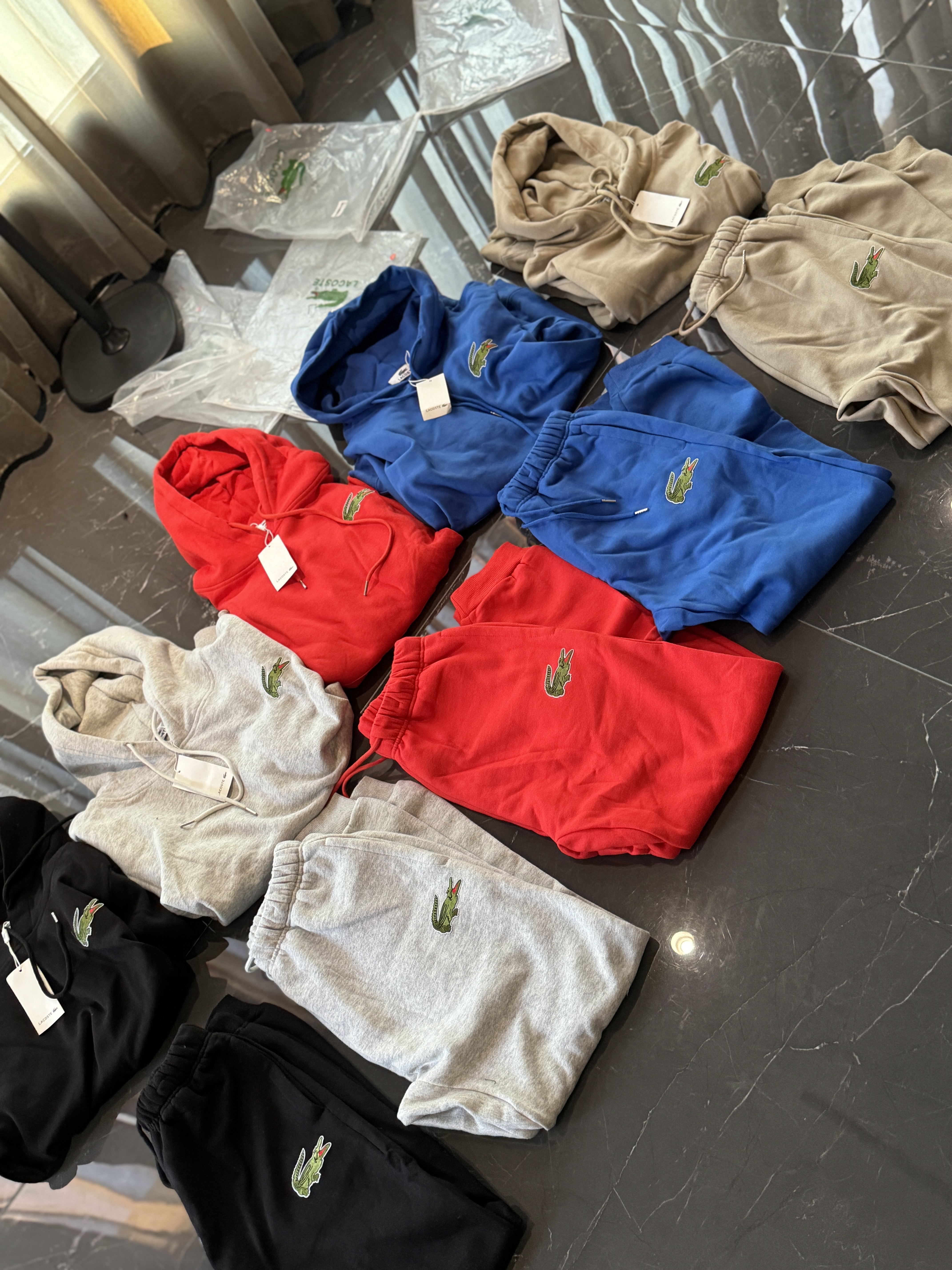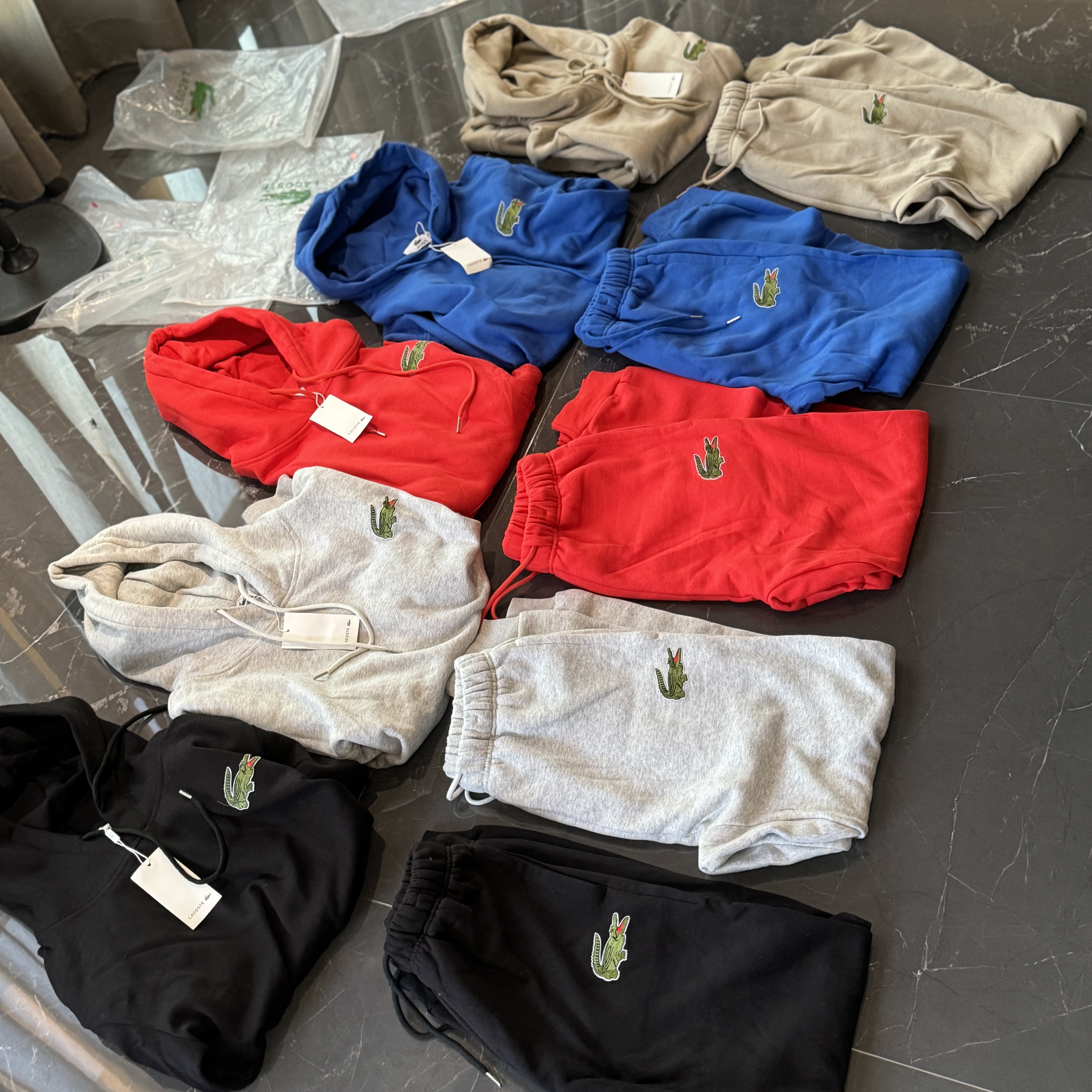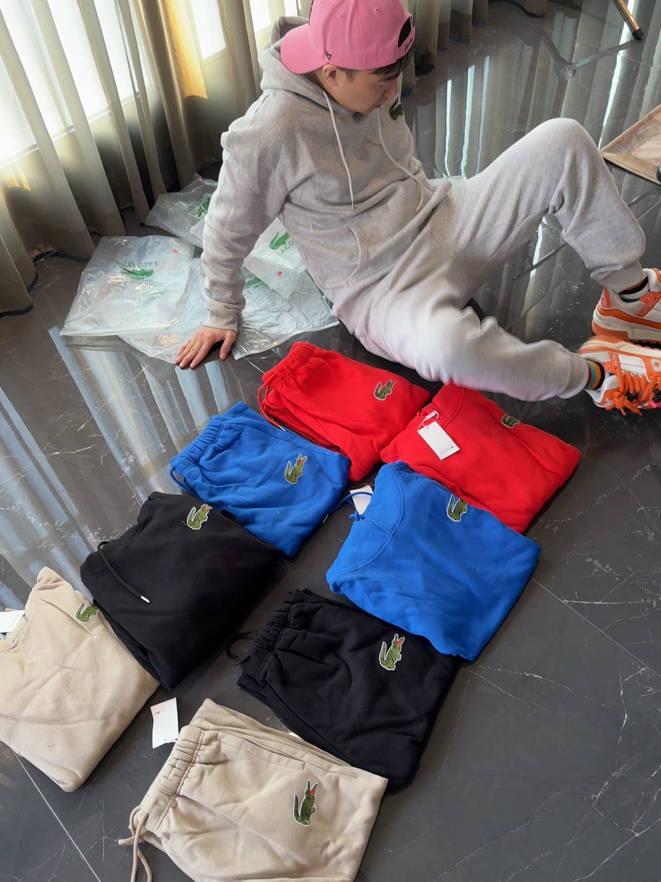 5色:黑色 浅灰色 卡其 蓝色。红色 上身百搭轻松!鳄鱼刺绣好看吸引眼球。简约款式 无复杂大logo。不挑身材 不挑人 随随便便¥1000官价。 很超值。不起球 !摸起来跟婴儿肌肤一样!一点儿都不夸张!比普通卫裤强的不止一点儿半点儿!推荐货。