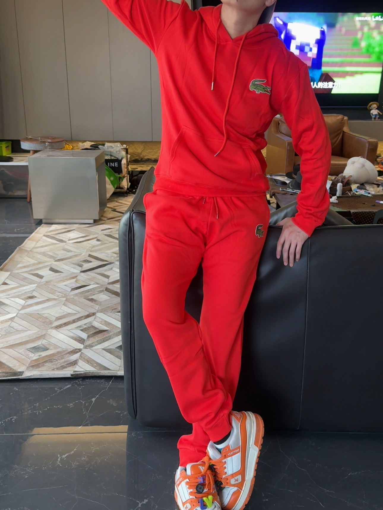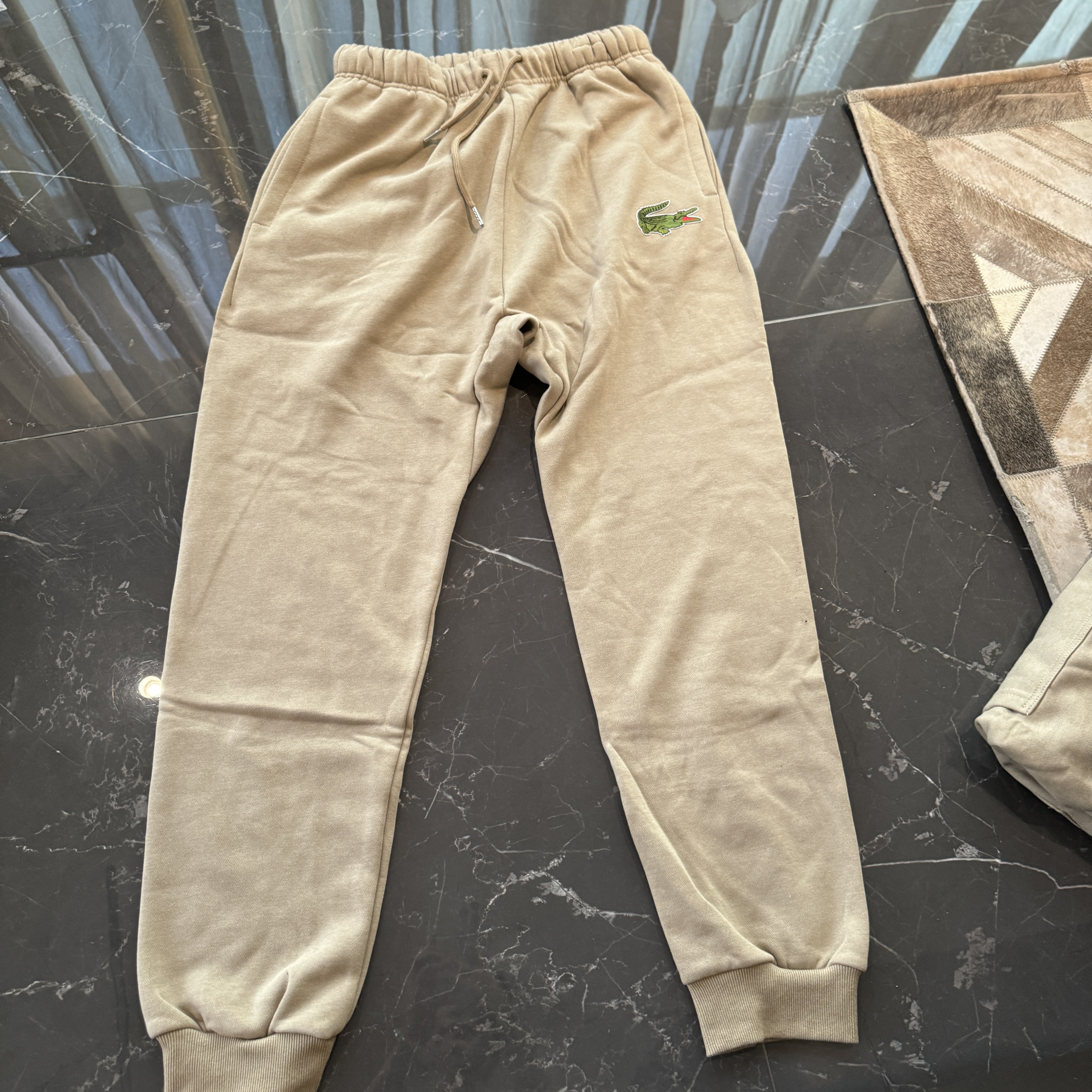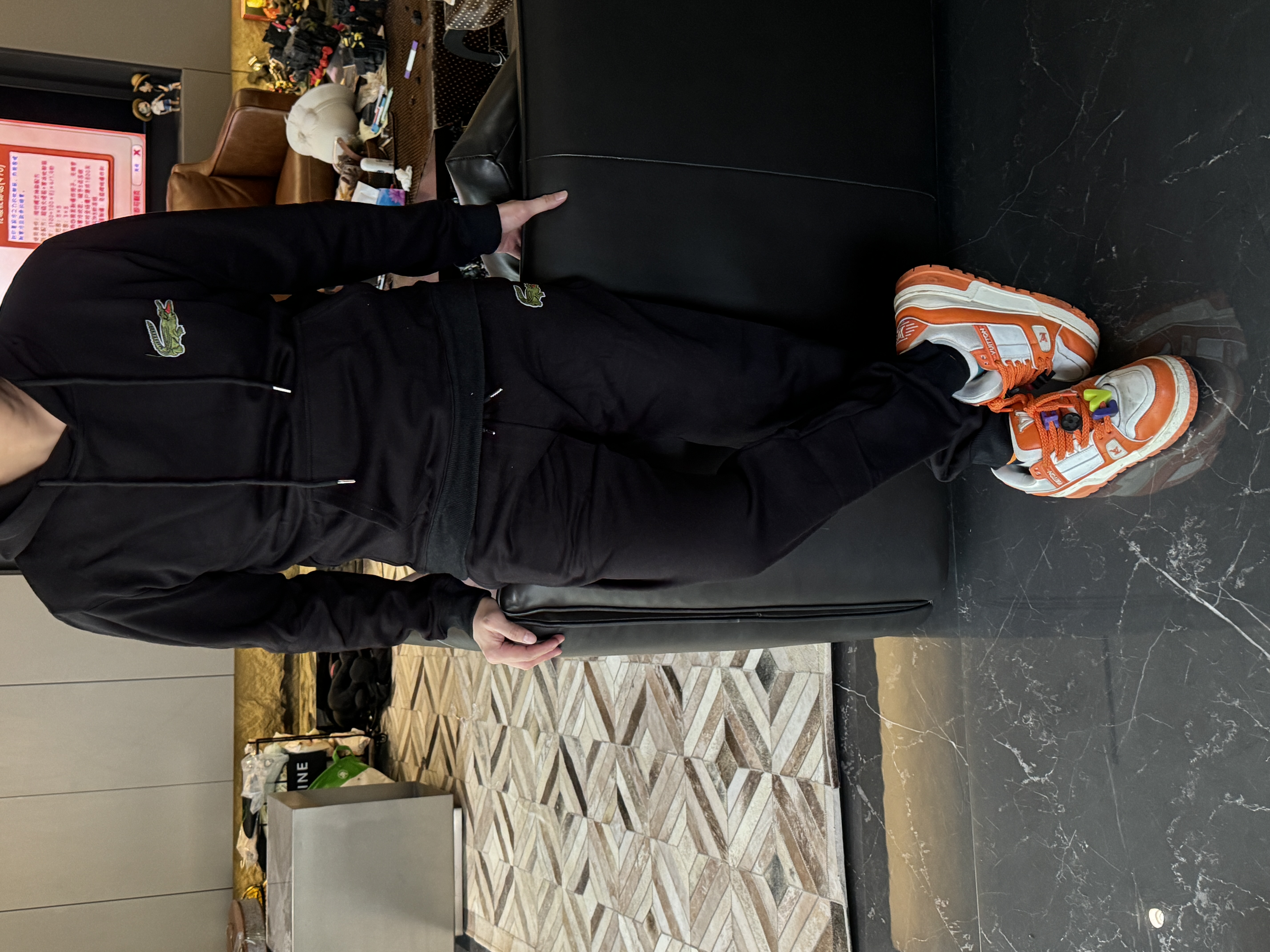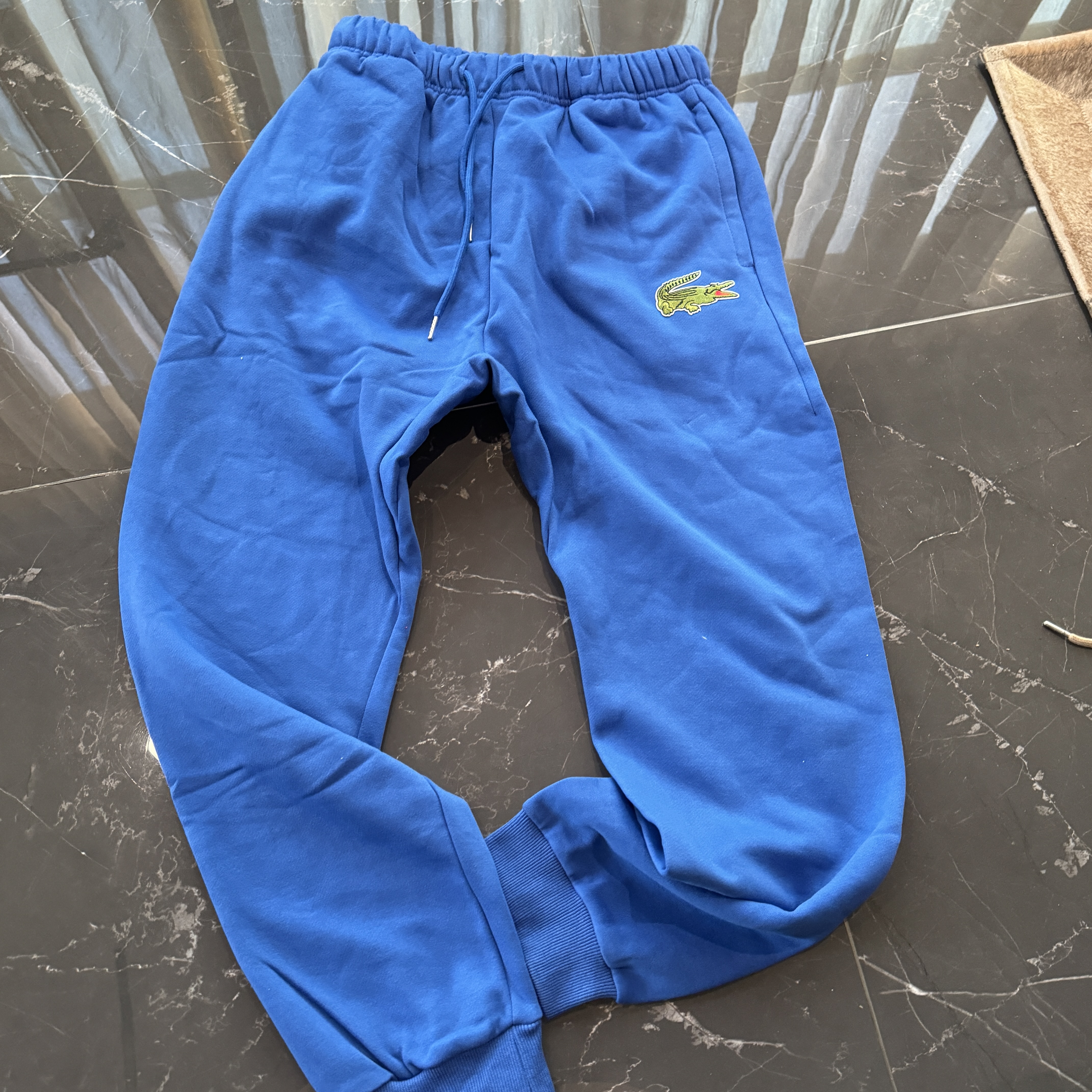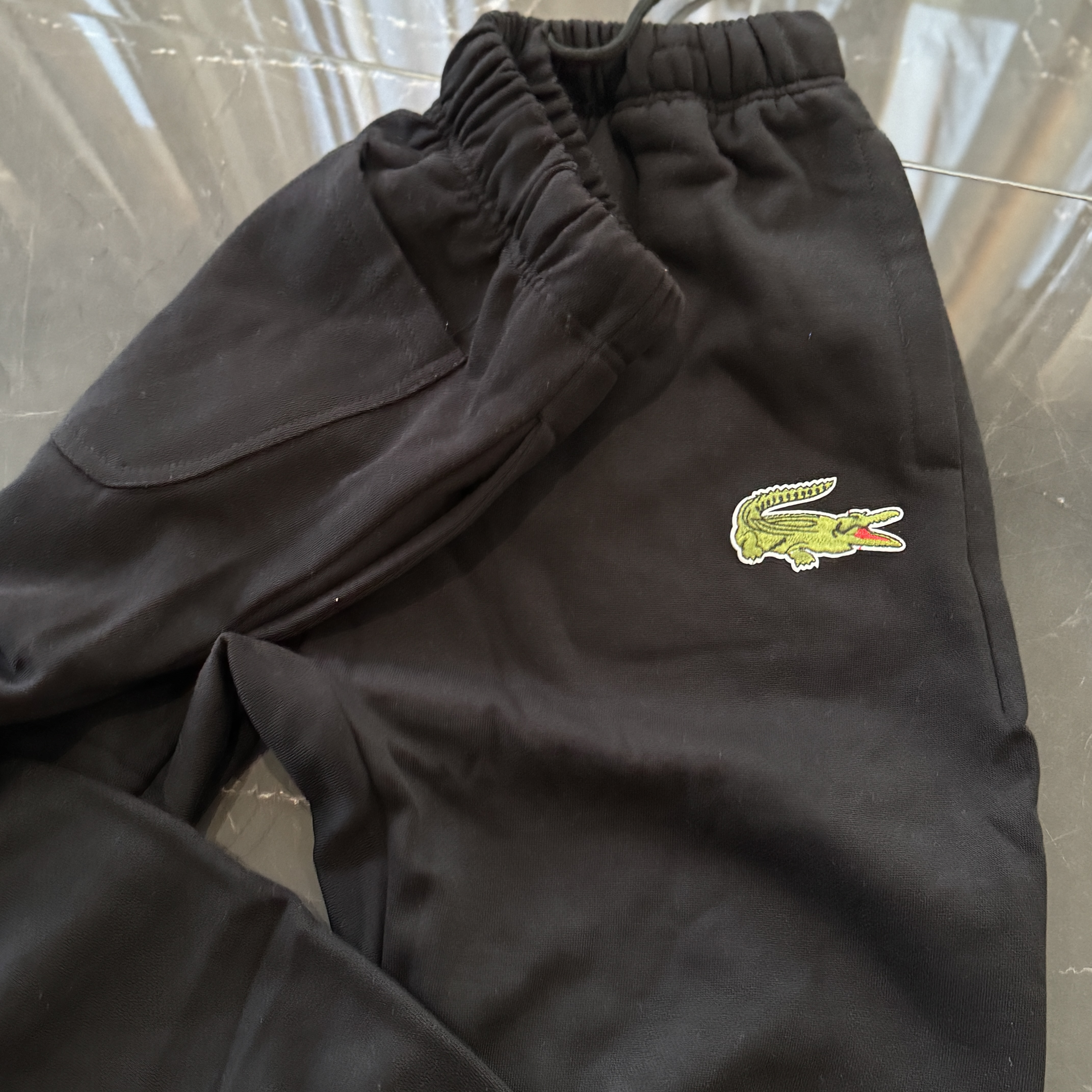5色:黑色 浅灰色 卡其 蓝色。红色 上身百搭轻松!鳄鱼刺绣好看吸引眼球。简约款式 无复杂大logo。不挑身材 不挑人 随随便便¥1000官价。 很超值。不起球 !摸起来跟婴儿肌肤一样!一点儿都不夸张!比普通卫裤强的不止一点儿半点儿!推荐货。