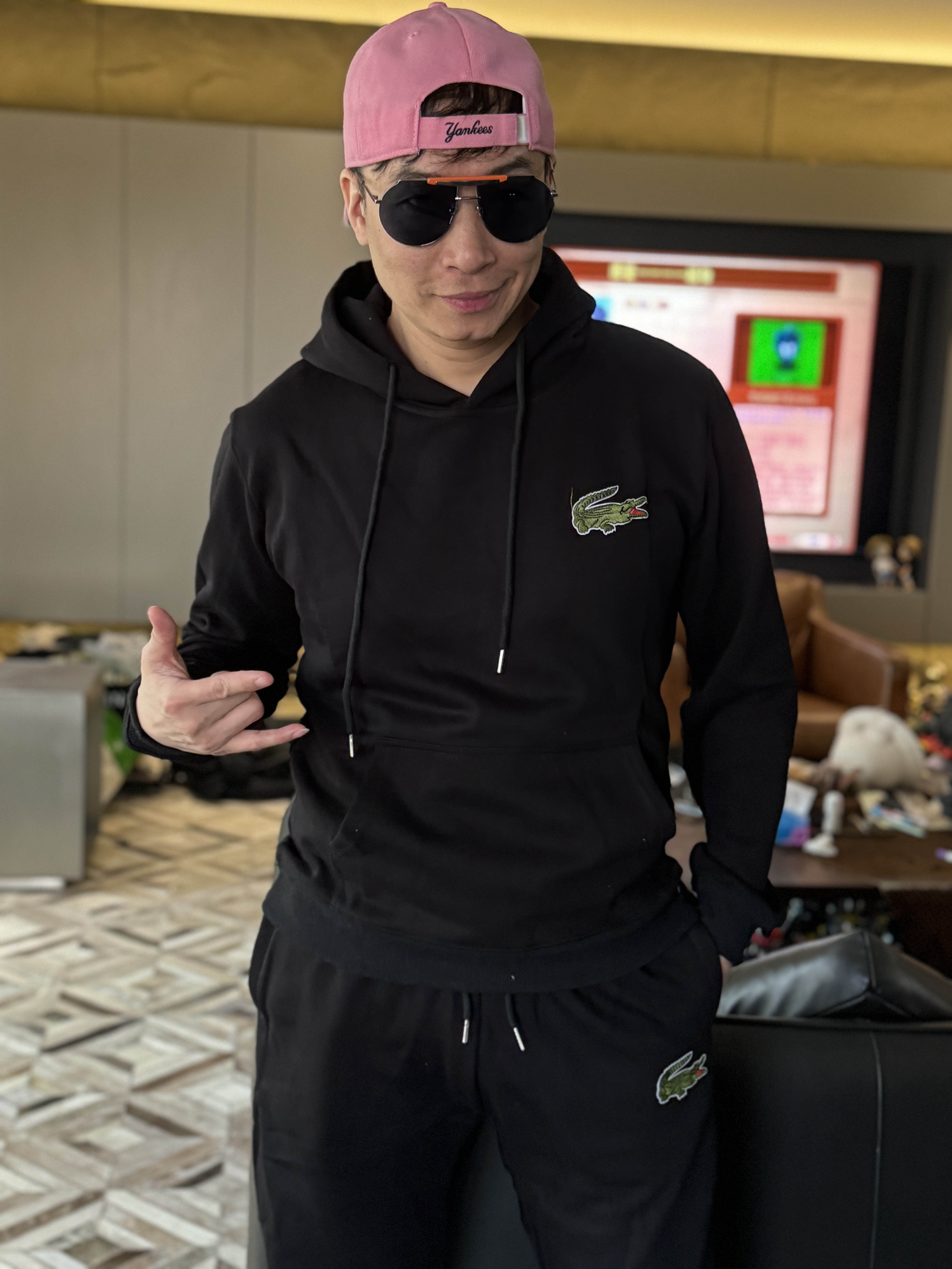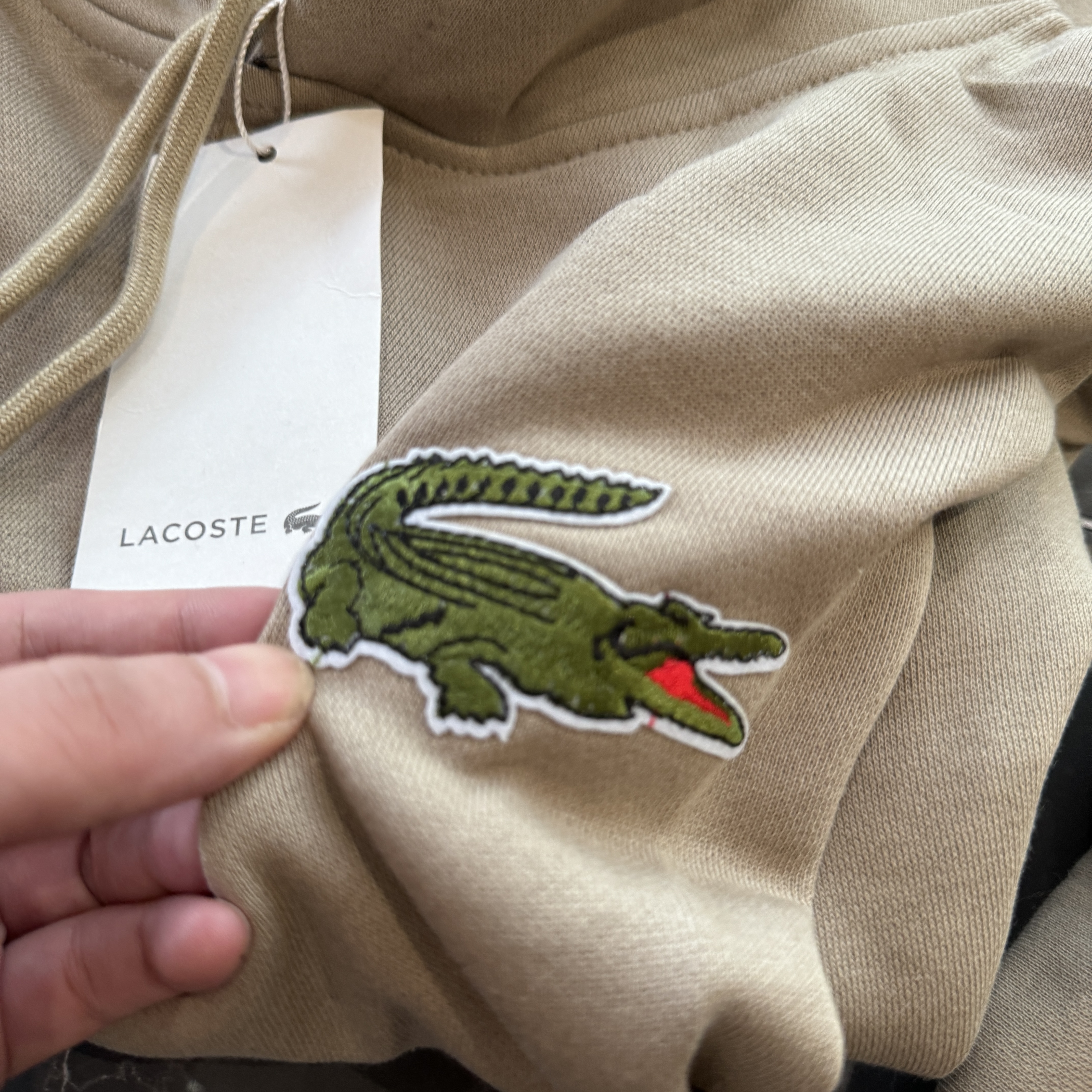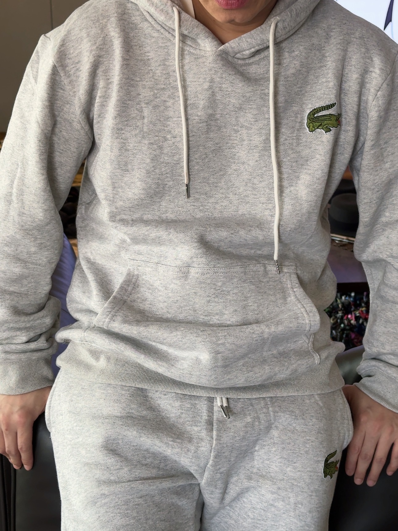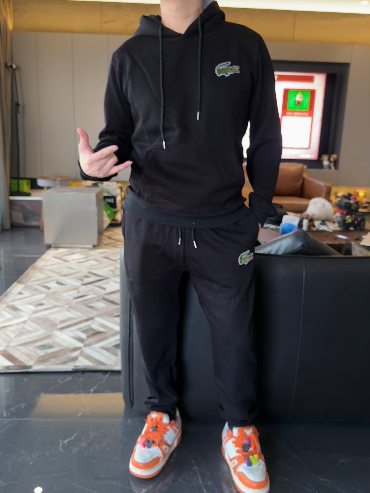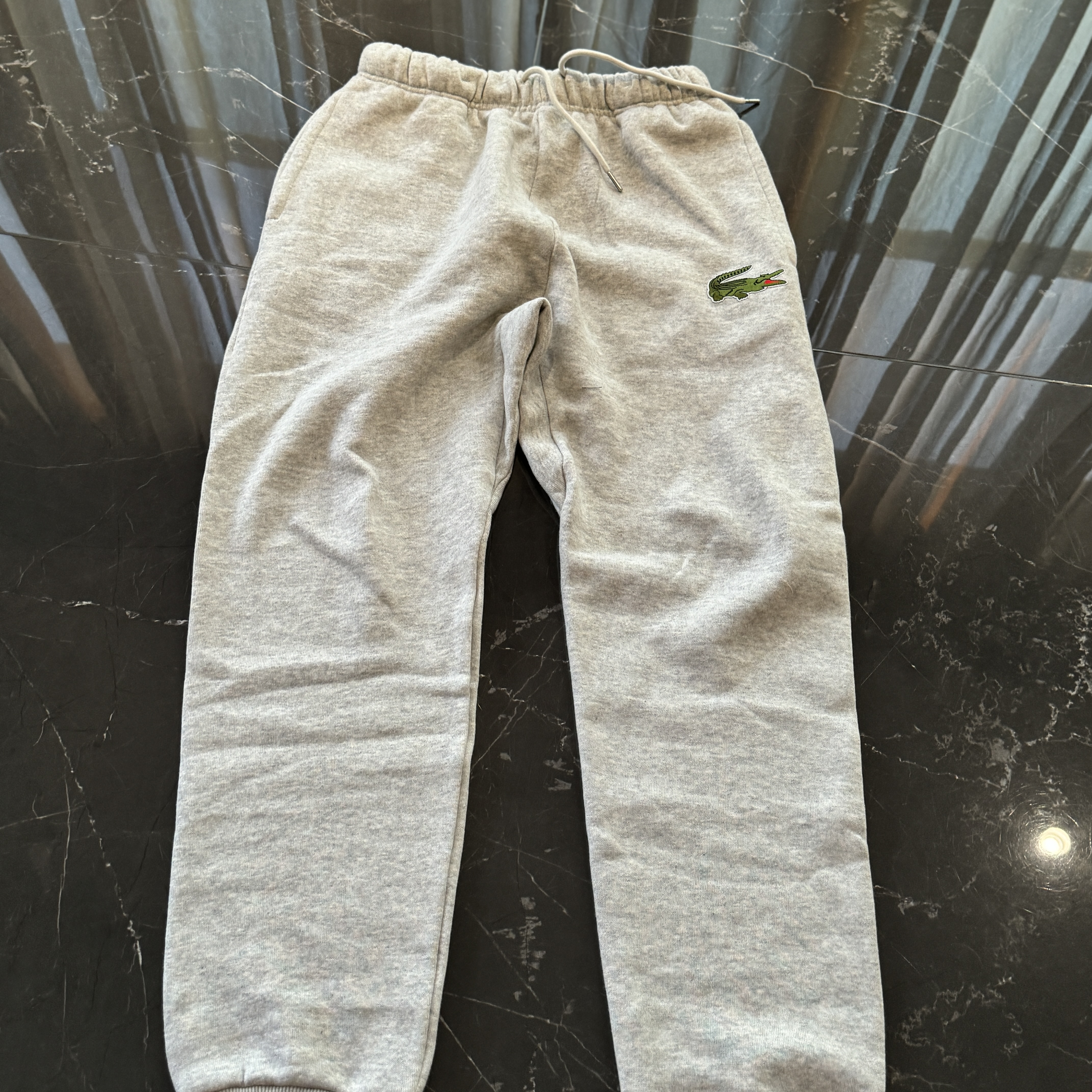 5色:黑色 浅灰色 卡其 蓝色。红色 上身百搭轻松!鳄鱼刺绣好看吸引眼球。简约款式 无复杂大logo。不挑身材 不挑人 随随便便¥1000官价。 很超值。不起球 !摸起来跟婴儿肌肤一样!一点儿都不夸张!比普通卫裤强的不止一点儿半点儿!推荐货。