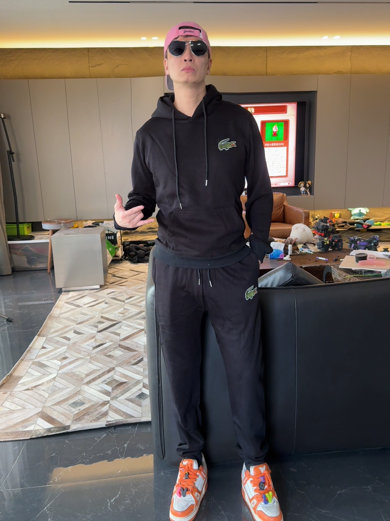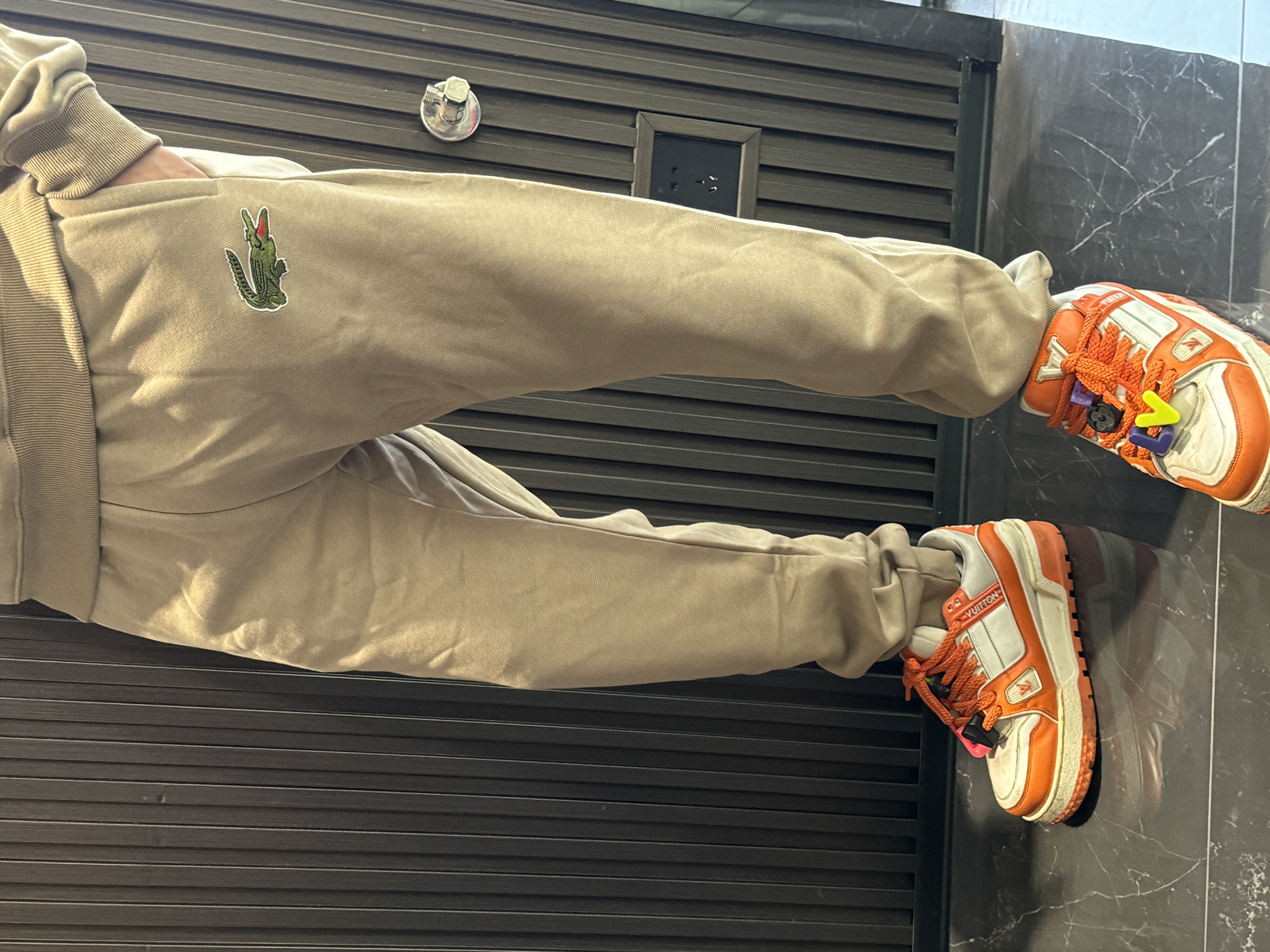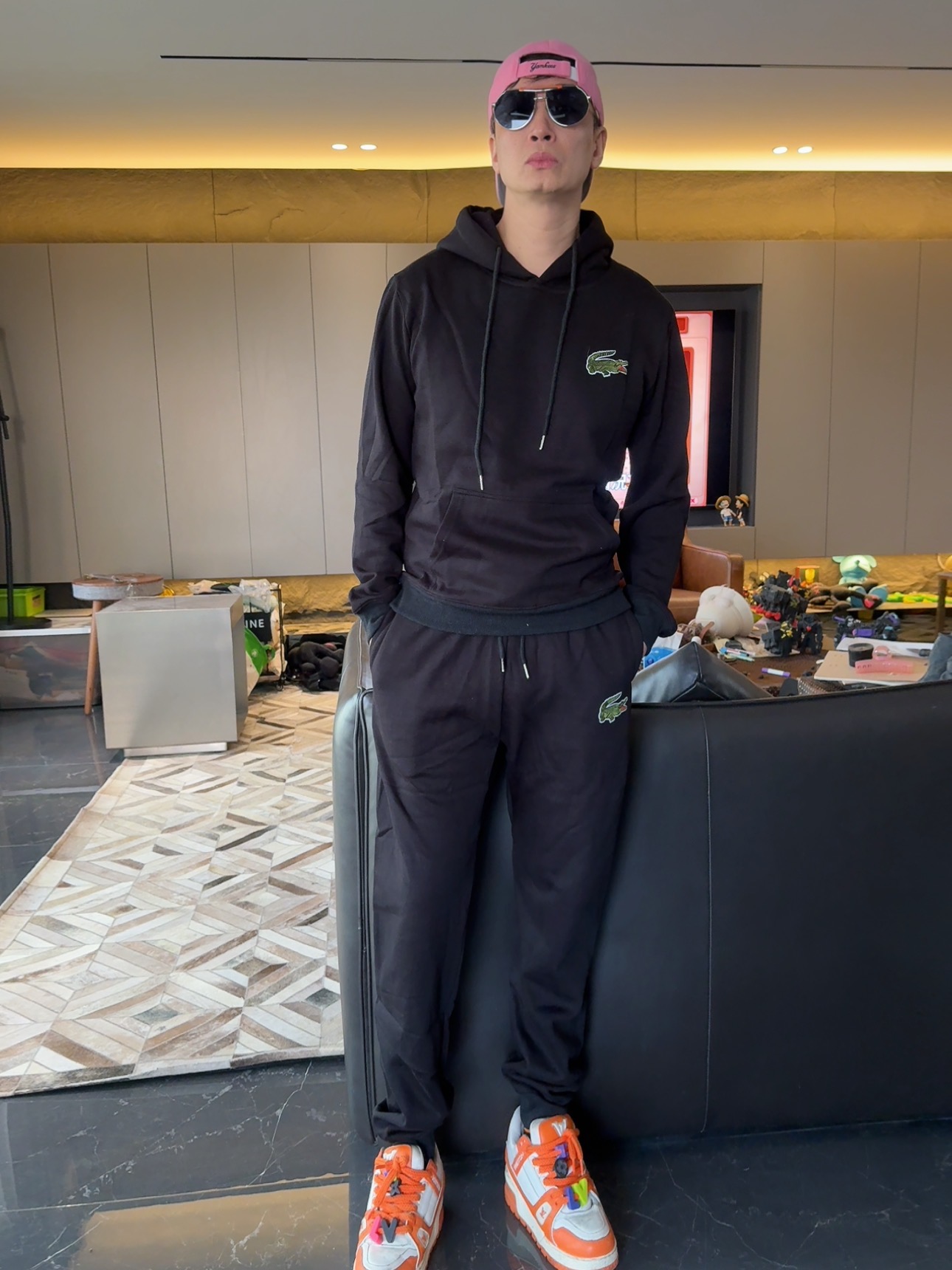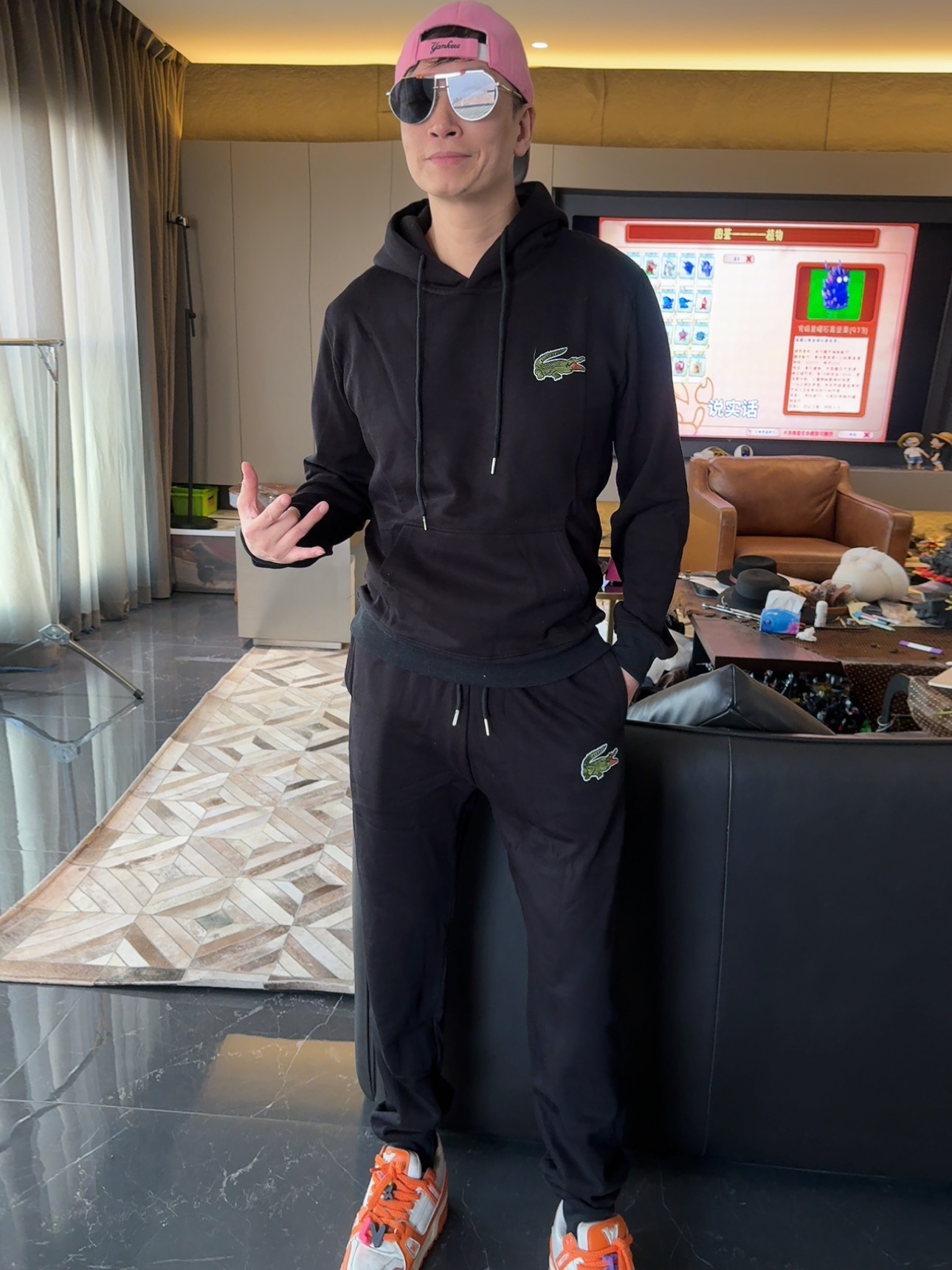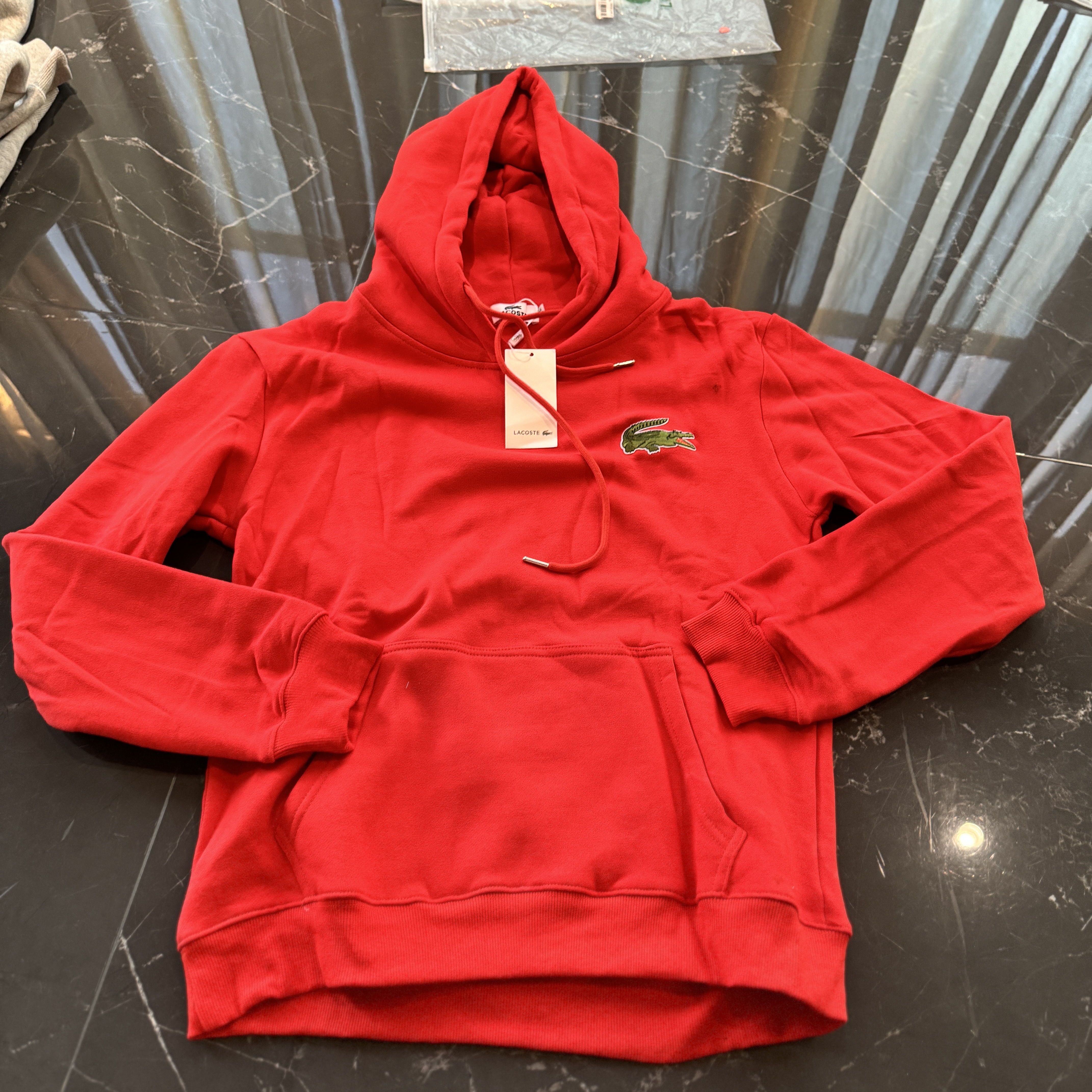 5色:黑色 浅灰色 卡其 蓝色。红色 上身百搭轻松!鳄鱼刺绣好看吸引眼球。简约款式 无复杂大logo。不挑身材 不挑人 随随便便¥1000官价。 很超值。不起球 !摸起来跟婴儿肌肤一样!一点儿都不夸张!比普通卫裤强的不止一点儿半点儿!推荐货。