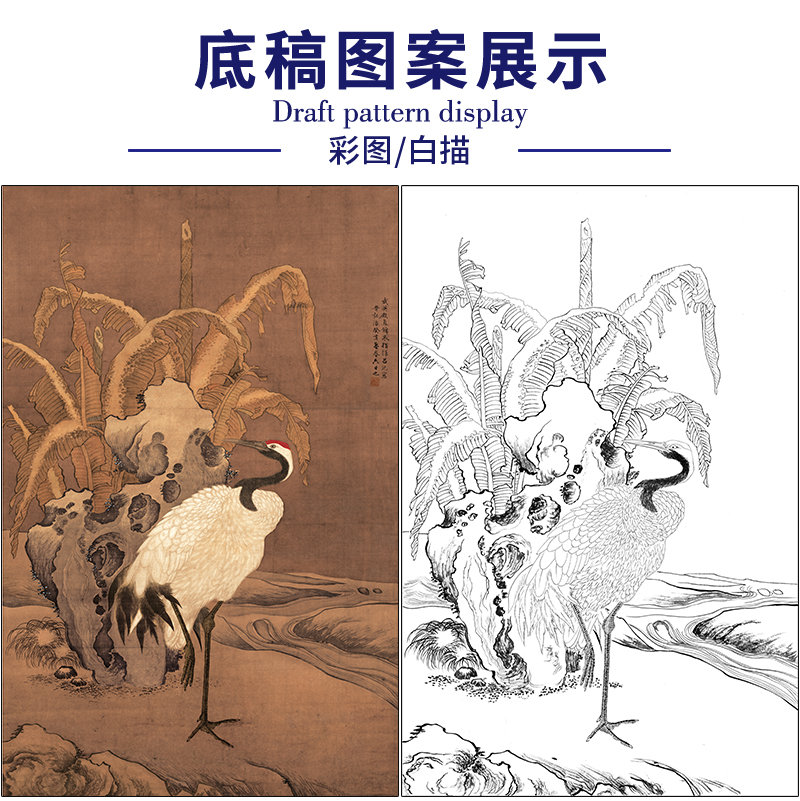吕纪花鸟工笔画白描底稿《蕉岩鹤立图》临摹勾线高清打印稿MD07