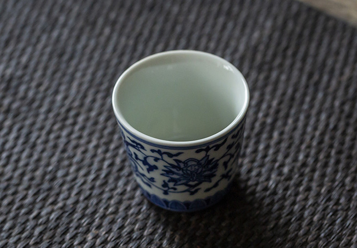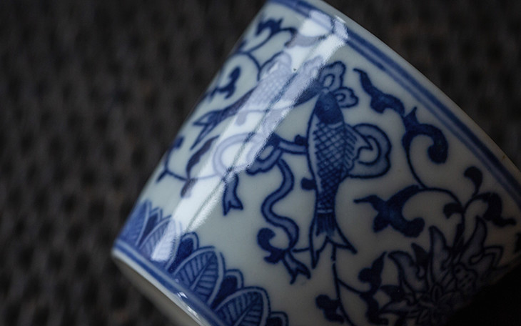 青花直口双鱼杯:双鱼游嬉莲叶间,莲叶缠绕,