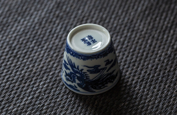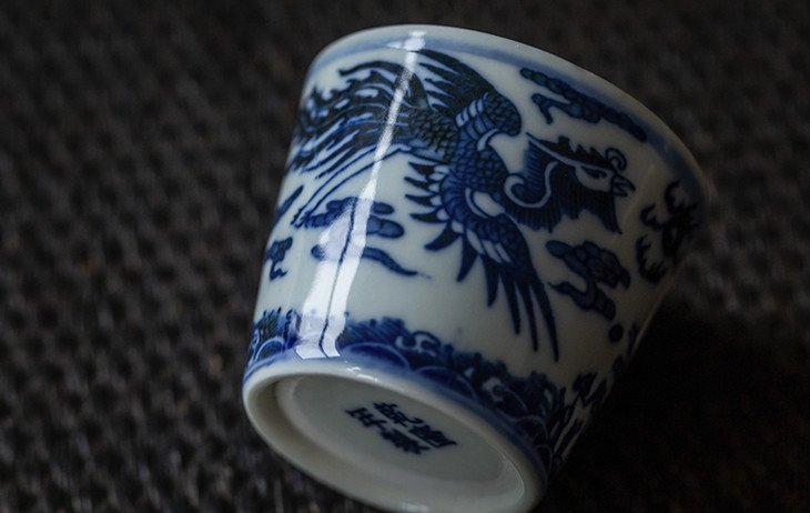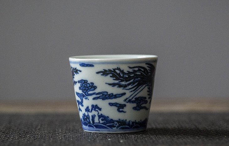 青花直口双凤杯:凤凰衔祥云,凌于空中,飘逸生动。