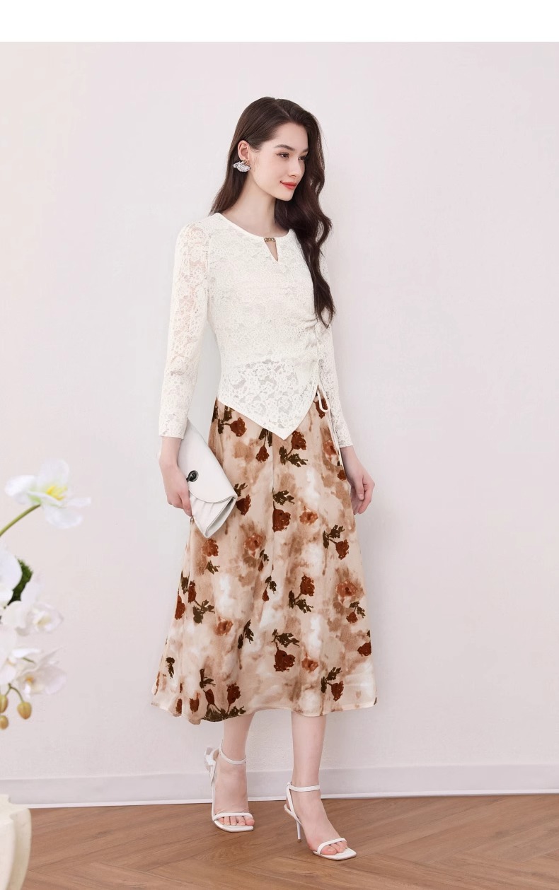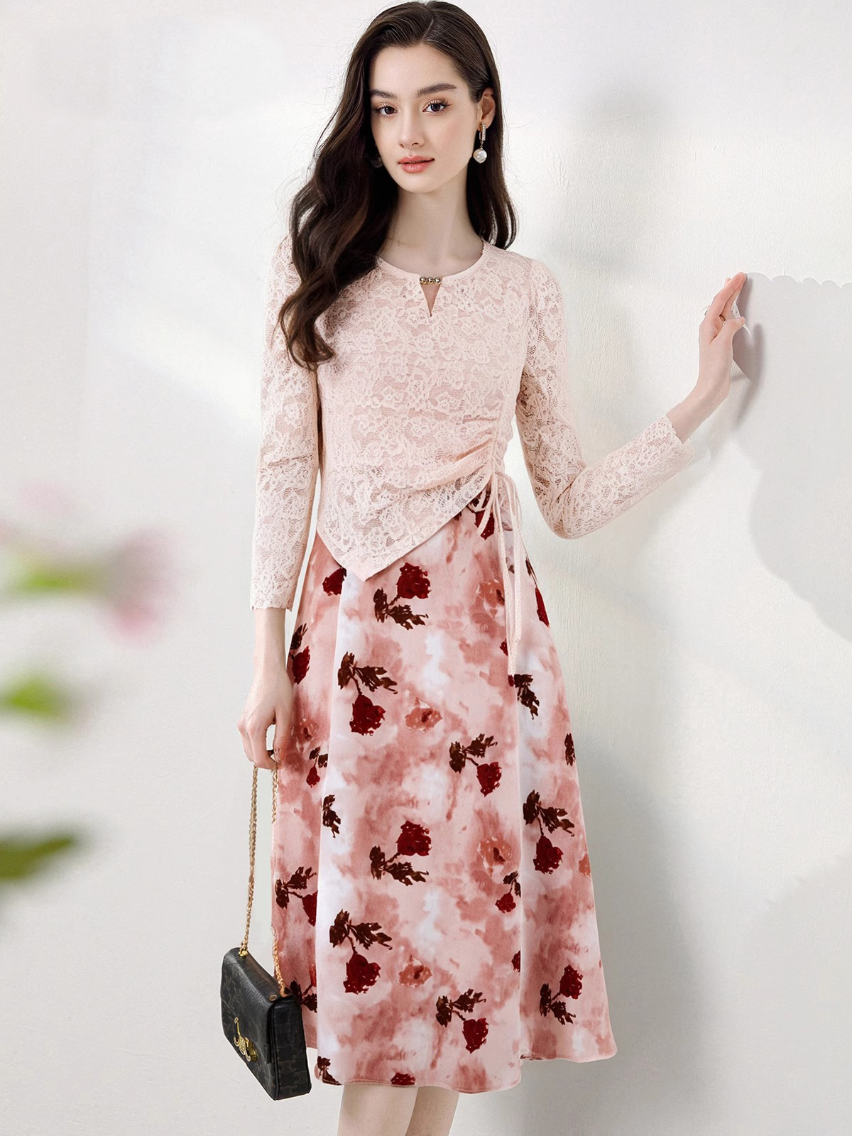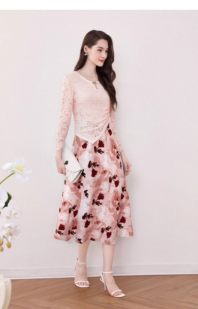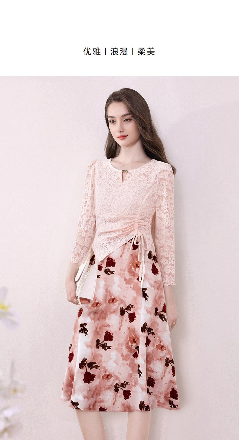 全新升级【铂金会员220/天猫299/差价79】(15130)粉色假两件气质连衣裙春季2025新款蕾丝印花度假风裙子