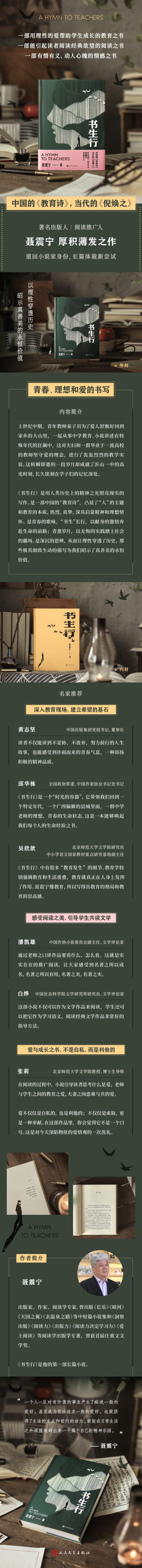 《书生行》是用人类历史上的精神之光照亮现实的写作。是一部中国的“教育诗”,凸显了“人”的主题和教育的本质,热烈、真挚,深具启蒙精神和理想情怀。 是青春的歌咏,“书生”长行,以献身的激情奔赴生命的前路;青葱岁月,以无悔的实践踏上社会的疆场。是深沉的思辨,从而让理性穿透了历史,那些极其细致生动的描写为我们昭示了真善美的永恒价值。