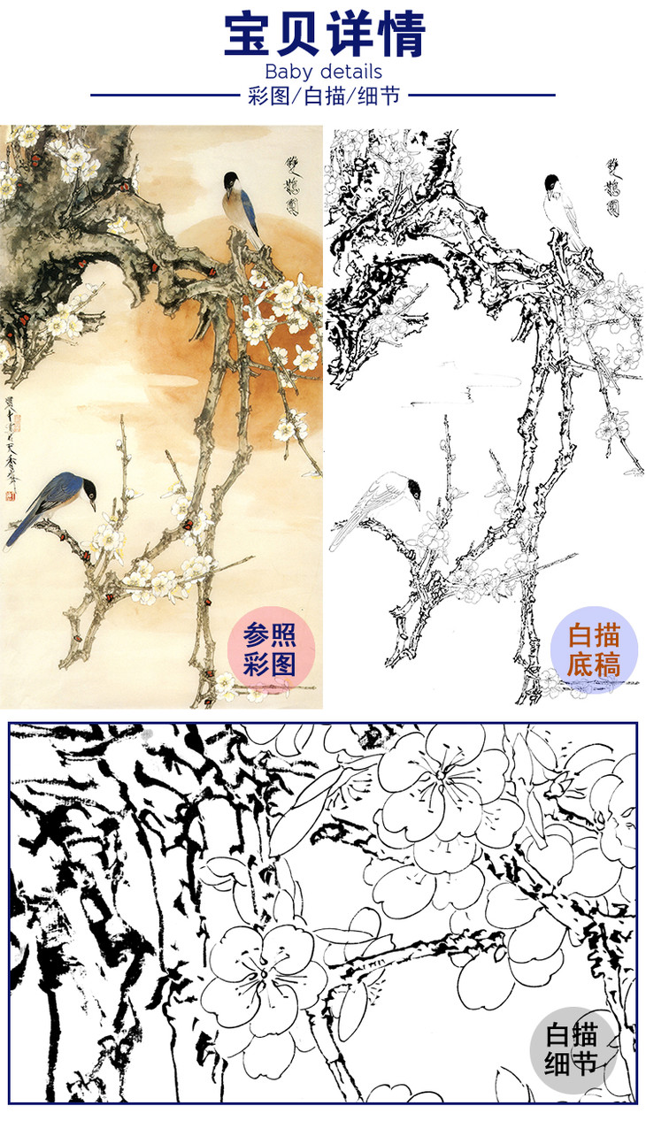 竖幅工笔花鸟白描底稿-王道中-《双鹊图》-多种白描尺寸可选-QS14
