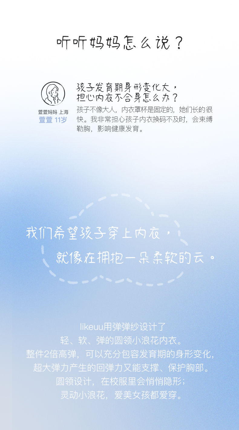 - likeuu是专注于为6~15岁的青少年创造柔软、无束缚的成长体验,以好奇心为灵感的成长发育期贴身衣物品牌。likeuu的产品覆盖内衣、内裤、保暖衣、家居服、运动等品类。