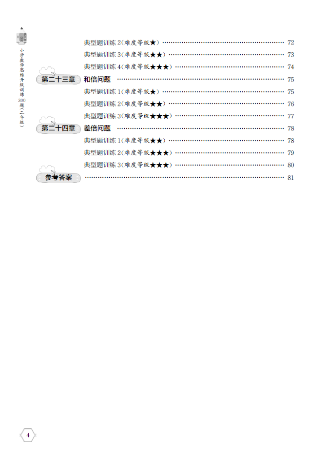 《小学数学思维升级训练300题(二年级)》采用分章专题的编排,以例题+练习的形式,将所有常见小学数学思维题分门别类编入24章。全书不仅题型全面、场景丰富,且编排合理、难度由浅入深,避免了很多教辅书出现头重脚轻、编排混乱的问题,是中等以上学生学习数学思维题的好帮手。