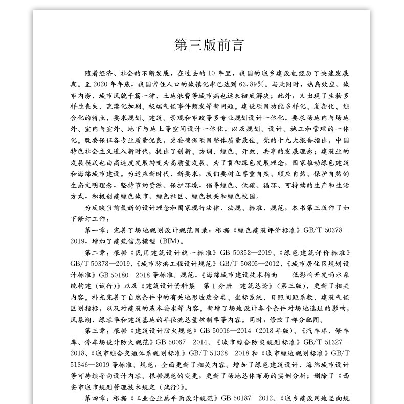 中国特色社会主义进入了新时代,为了适应国家大政方针的变化,先后已有超过17本规范更新:《绿色建筑评价标准》GB/T 50378-2019、《海绵城市建设技术指南——低影响开发雨水系统构建(试行)》 2014、《海绵城市建设评价标准》 GB/T 51345-2018、《海绵城市建设10项相关标准修订条文汇编》2017年8月第一版、《城市绿地规划标准》GB/T 51346-2019、《民用建筑设计统一标准》 GB 50352-2019、《城乡建设用地竖向规划规范》 CJJ 83-2016 、《城市居住区规划设计标准》 GB 50180-2018、《建筑设计防火规范》 GB 50016-2014局部修订条文(2018版)、《城市道路工程设计规范》 CJJ 37-2012 (2016版)、《公园设计规范》GB 51192-2016、《城市防洪工程设计规范》GB/T50805-2012、《建筑边坡工程技术规范》 GB 50330-2013、《城市工程管线综合规划规范》GB50289-2016、《城市综合管廊工程技术规范》GB 50838-2015、《城市停车规划规范》GB/T51149-2016和《工业企业总平面设计规范》GB 50187-2012等。