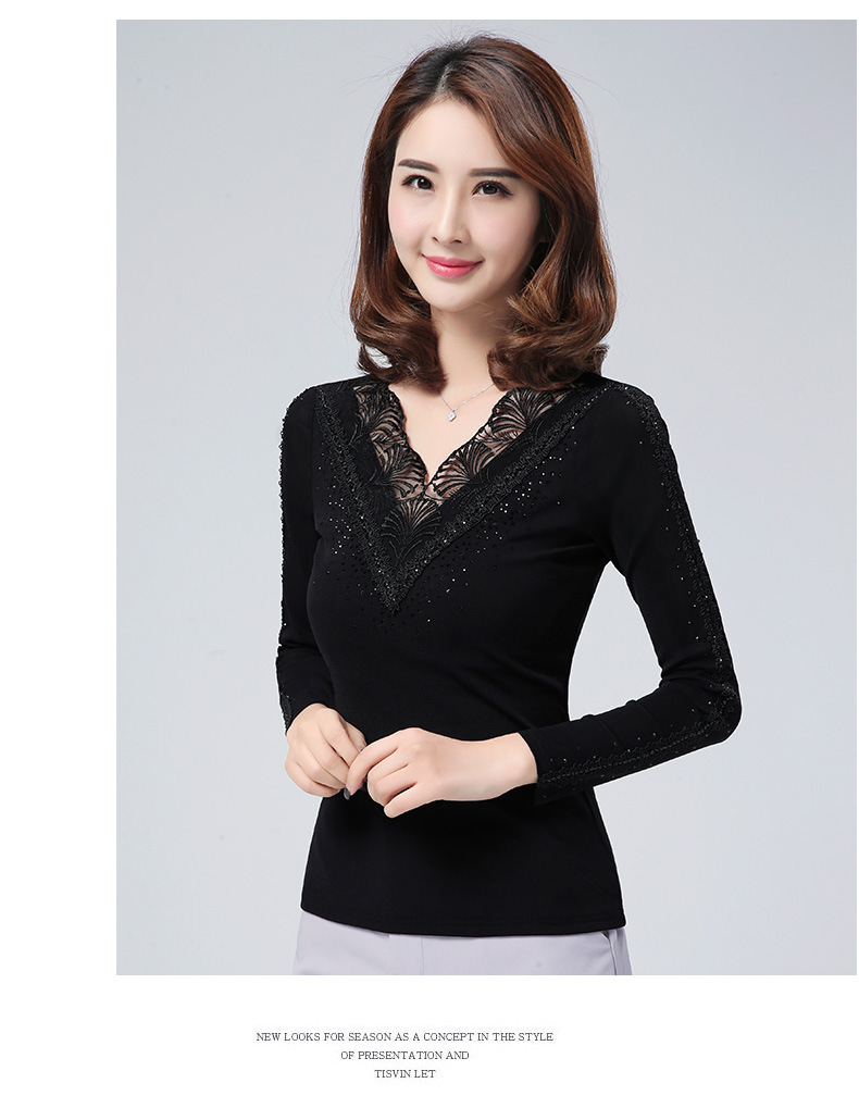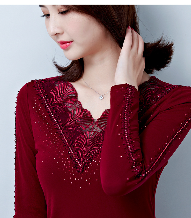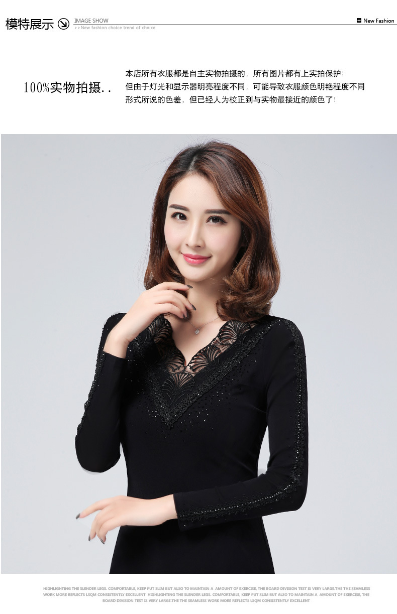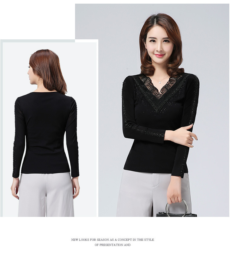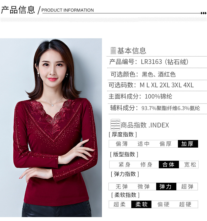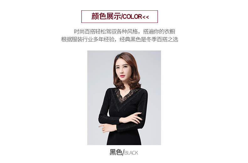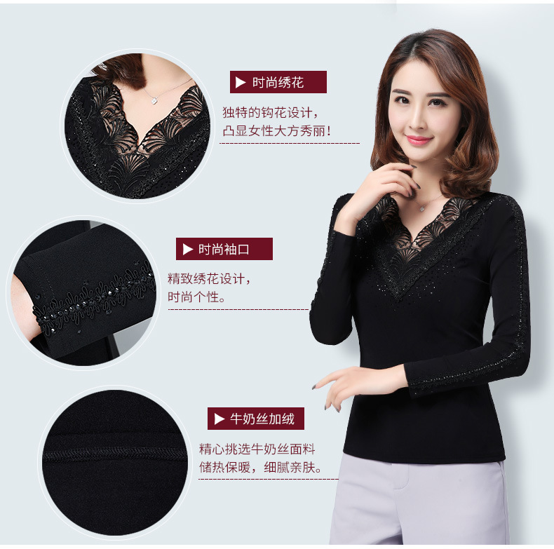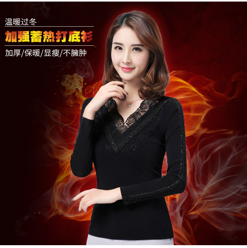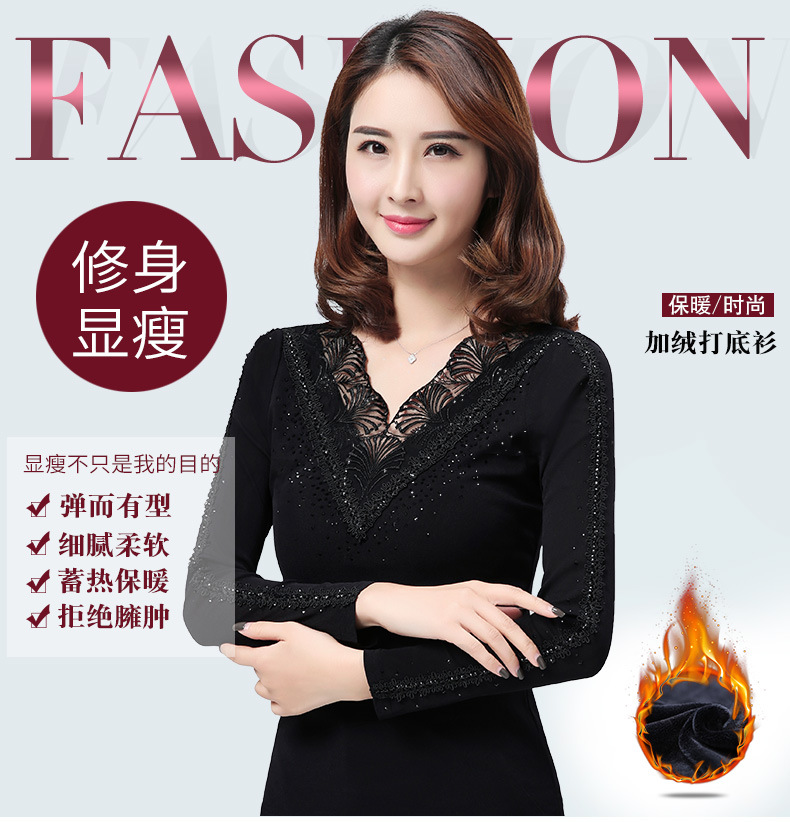 LXG-LR3163新款冬装蕾丝花边V领加绒加厚打底衫