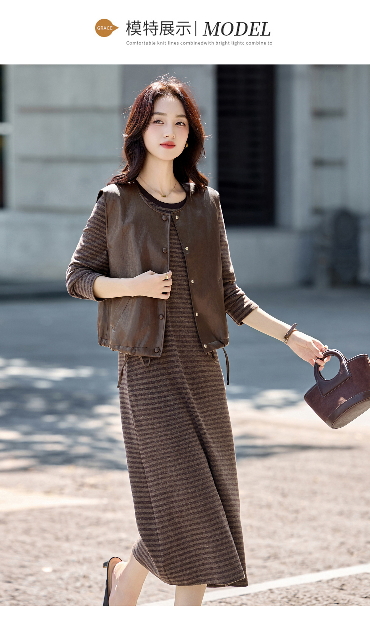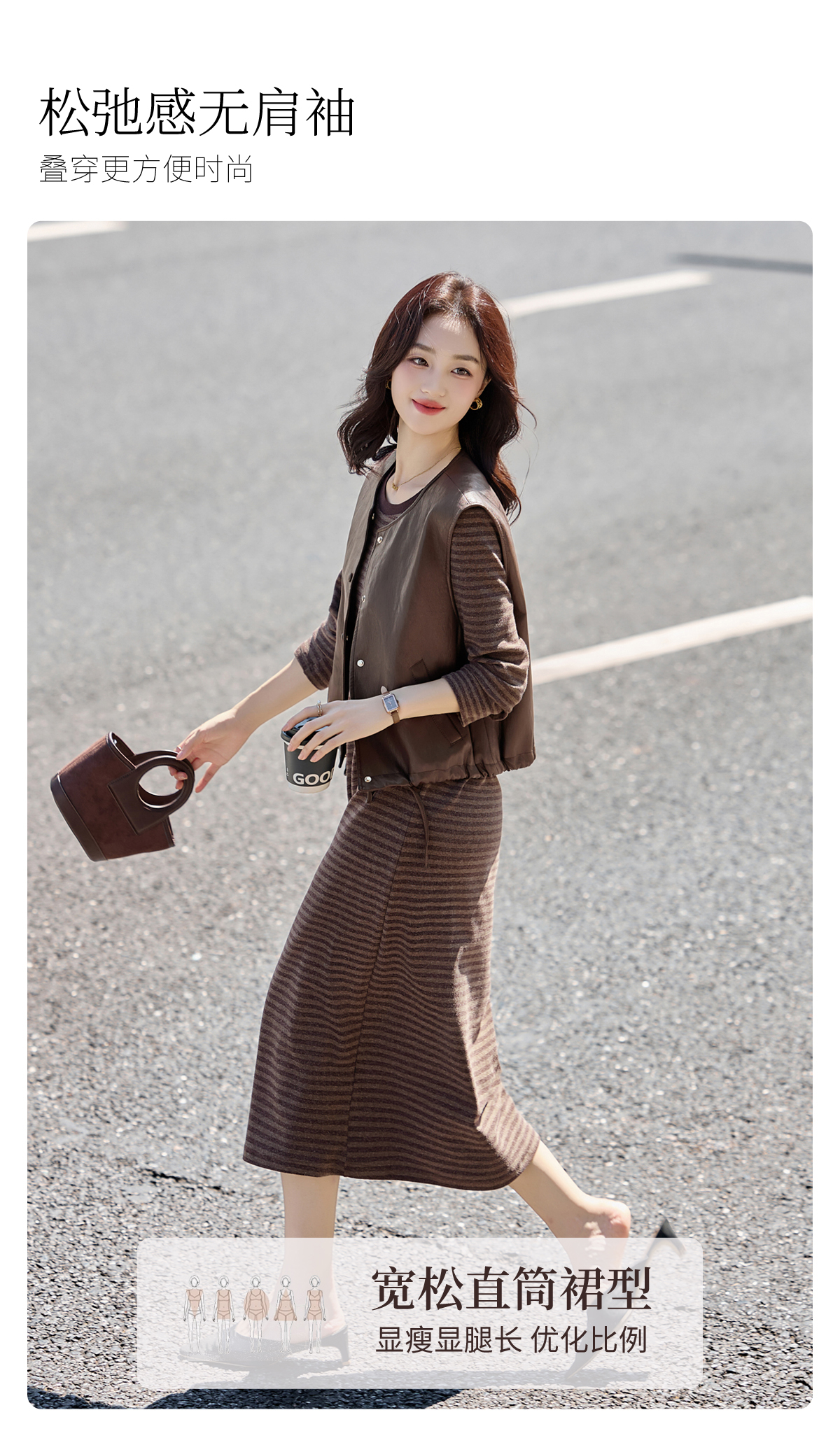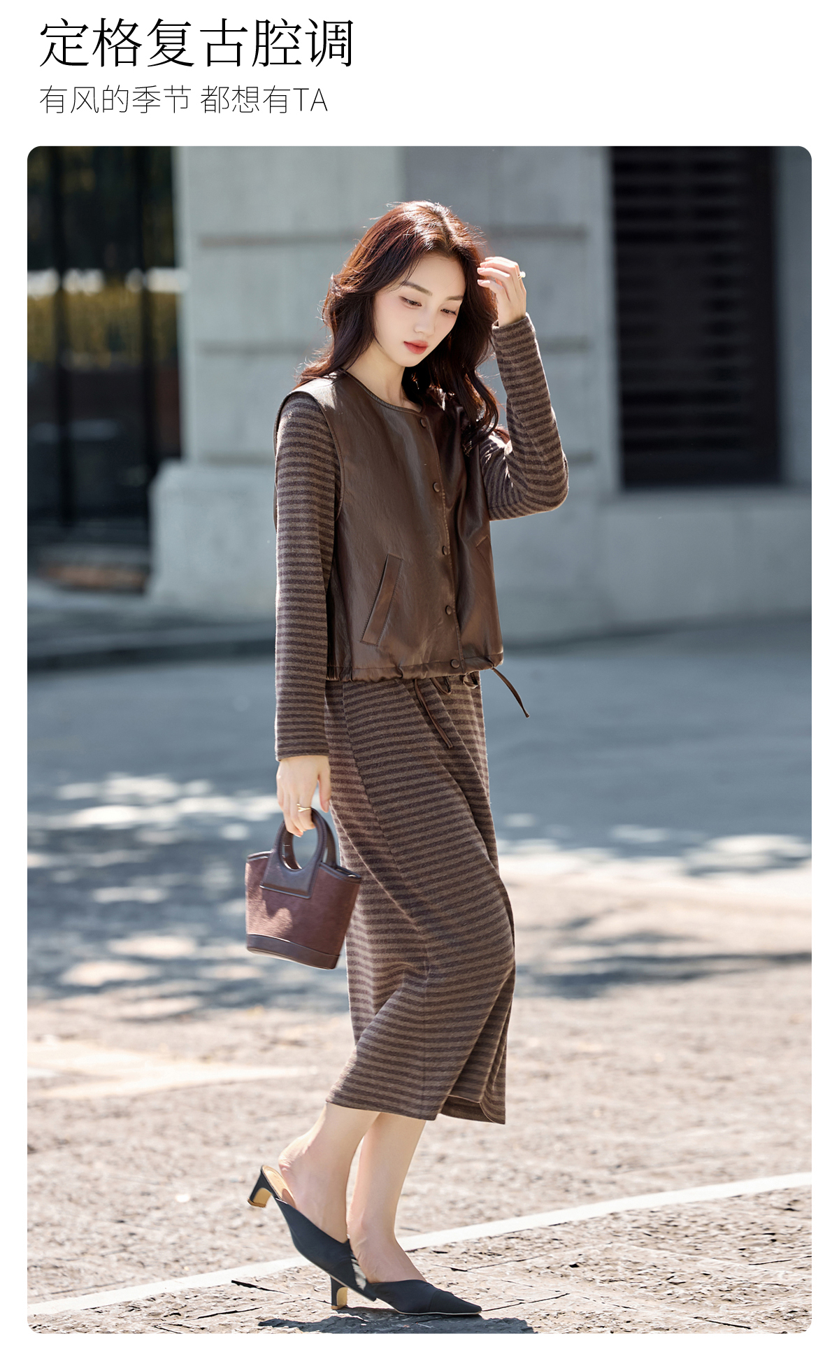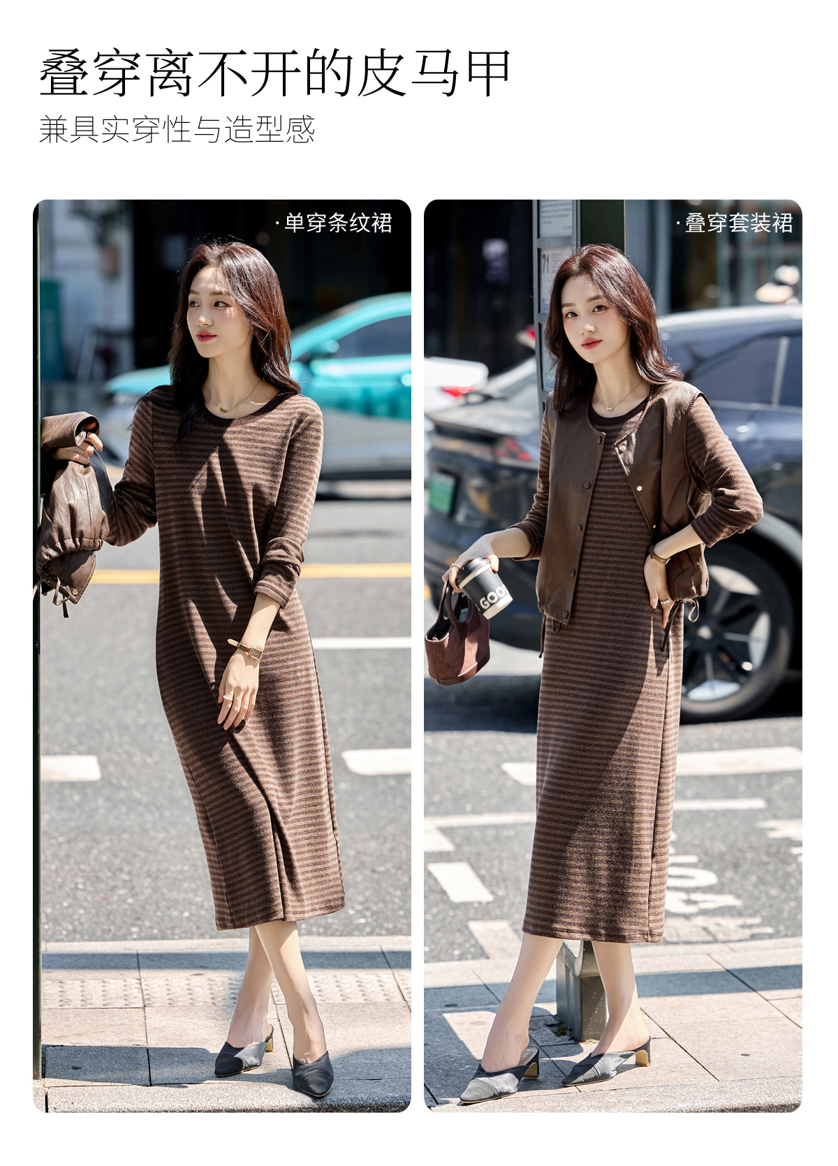 休闲百搭皮马甲条纹裙,套装两件套长袖连衣裙HR-YF2622