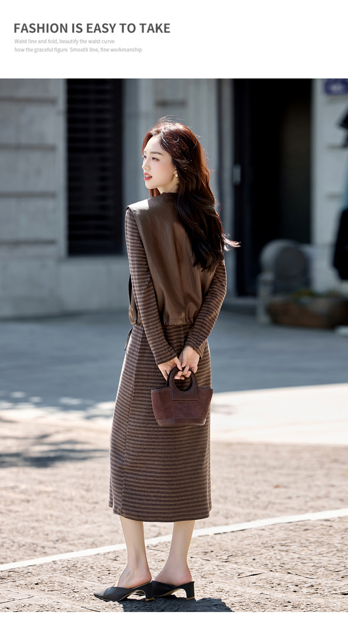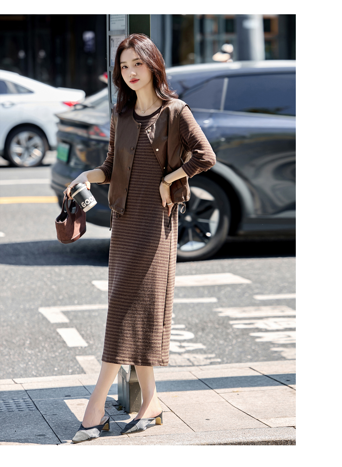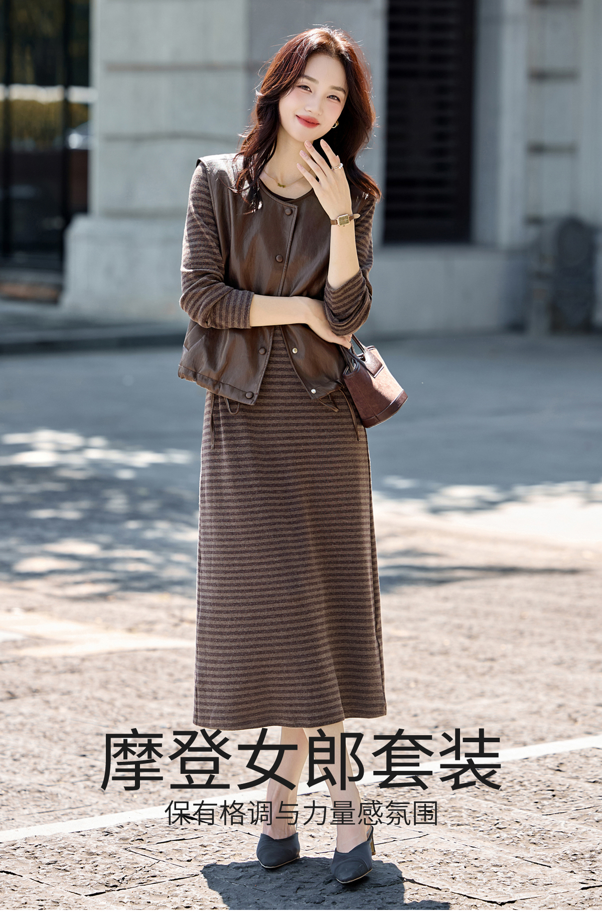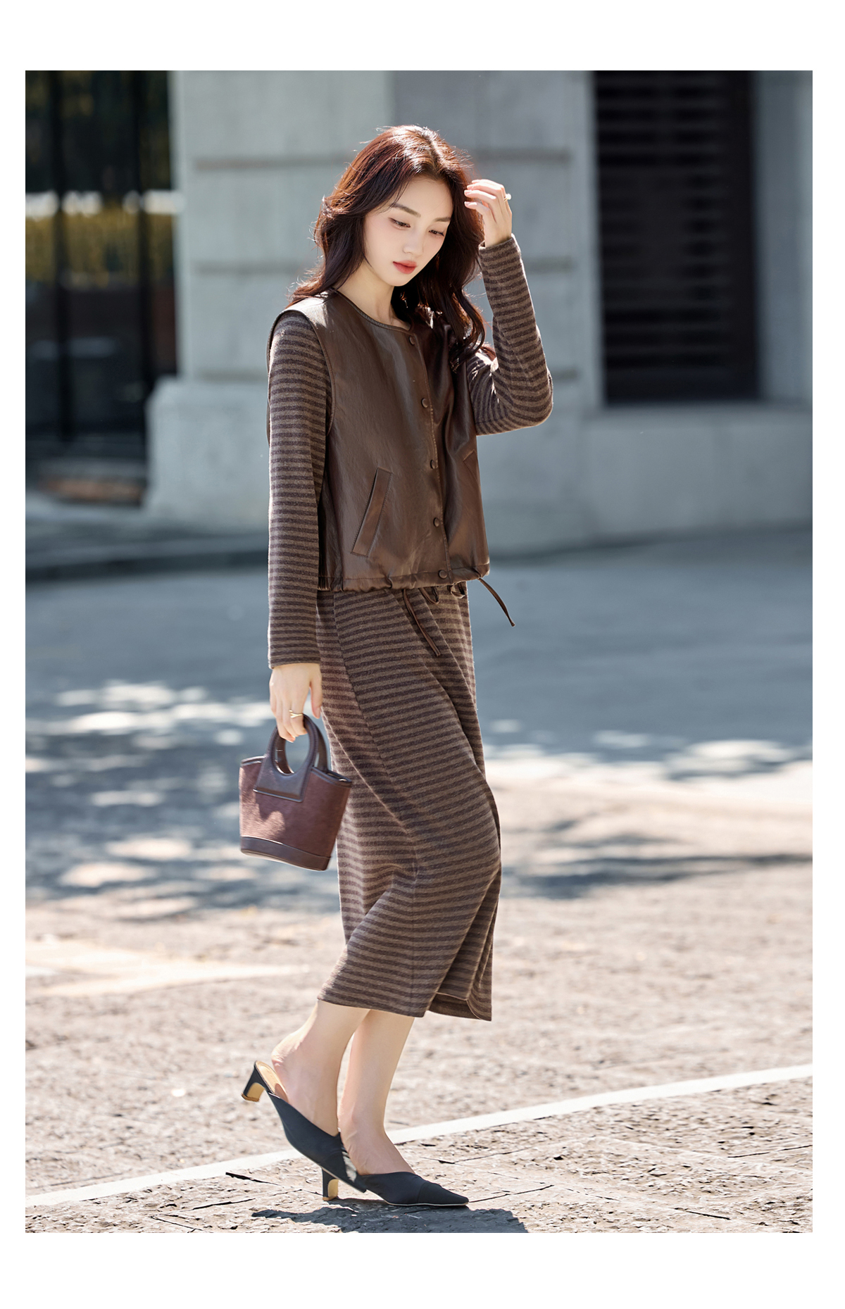 休闲百搭皮马甲条纹裙,套装两件套长袖连衣裙HR-YF2622
