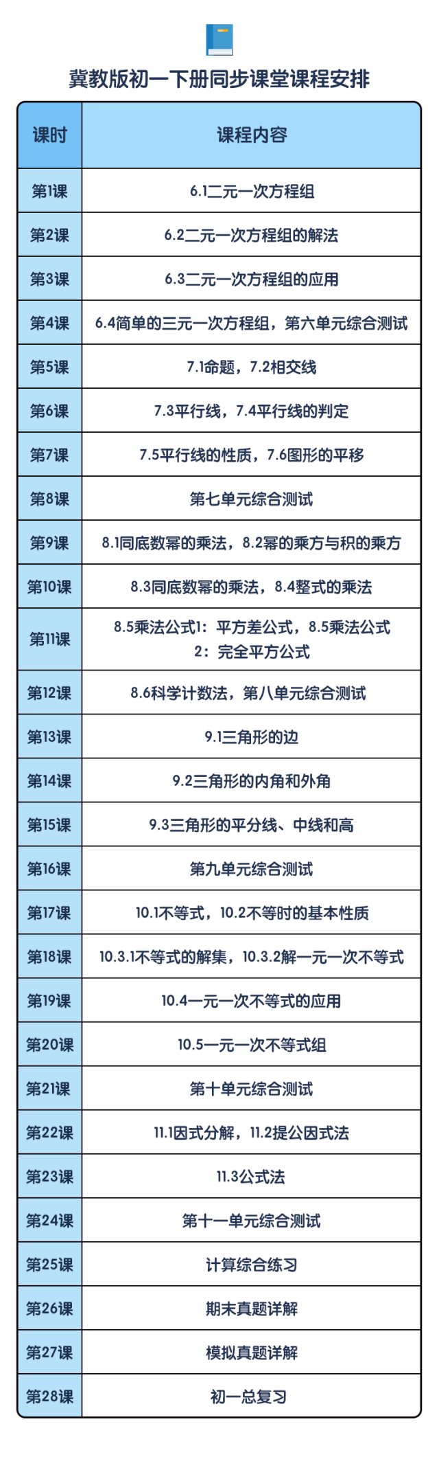 2.每个版本的课程分为28节课,其中涉及两节整个初一知识的总复习。