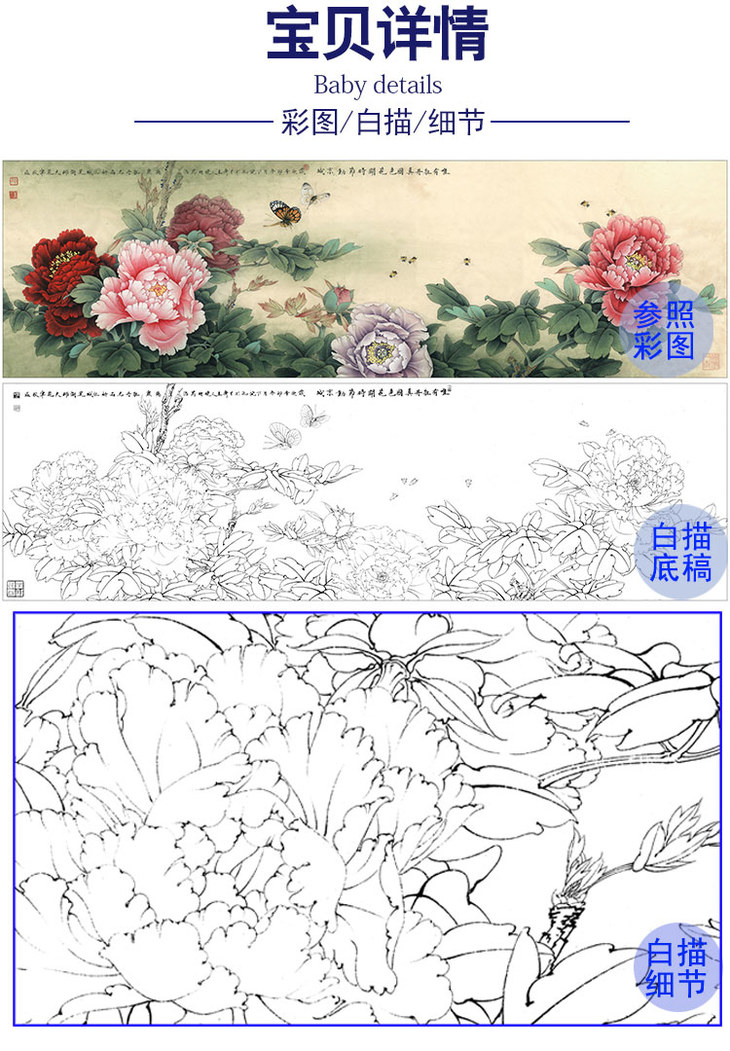 李晓明横幅工笔花鸟白描底稿-牡丹长卷《彩蝶舞翩跹》-多种白描尺寸可选-K050