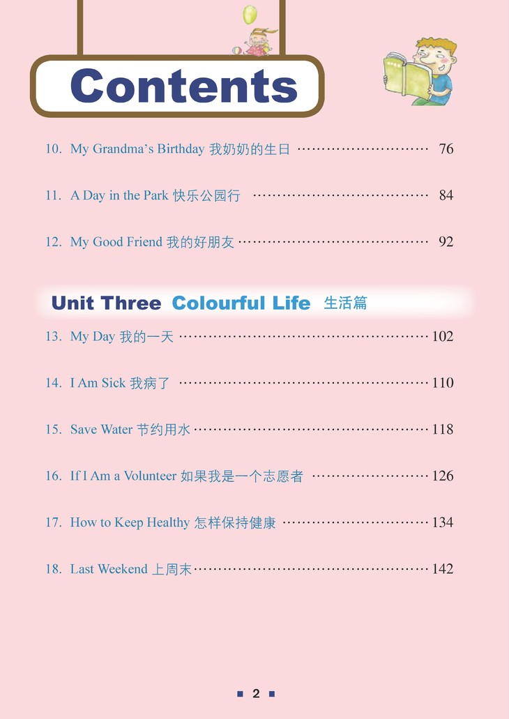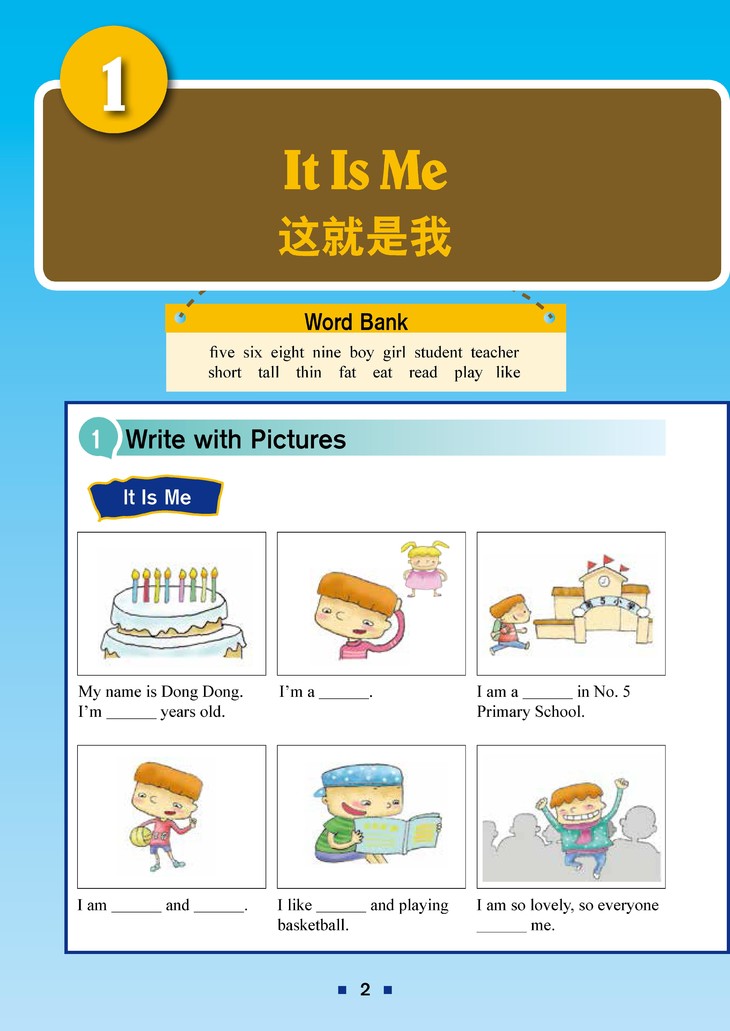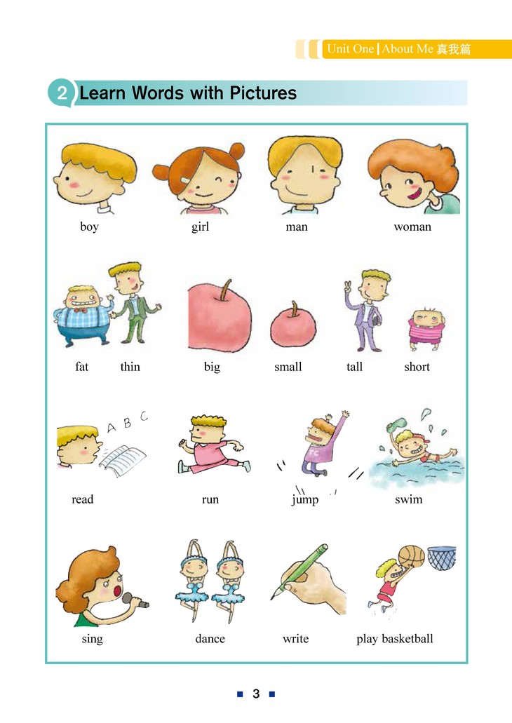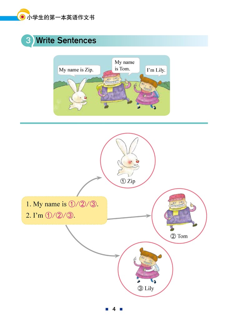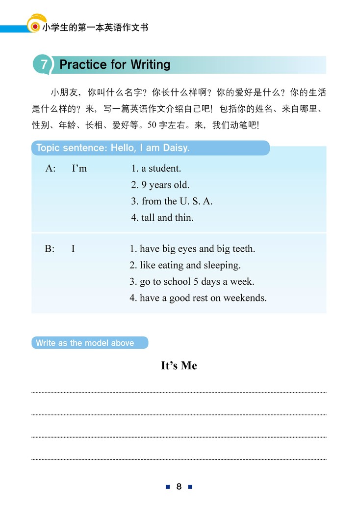 本书旨在为各位小朋友的英语写作提供一些指导,从而帮助掌握正确的表达方式。本书分为3个单元,题材包括自我、家庭、生活等方方面面。本书一共18课,每课有7~8页。第1页为看图作文,第2页为以图画的形式拓展单词,第3~4页为句型模板练习,第5页为范文阅读和填空,第6页为针对范文的语法讲解,第7~8页提供更多的句型并布置相应的写作任务。