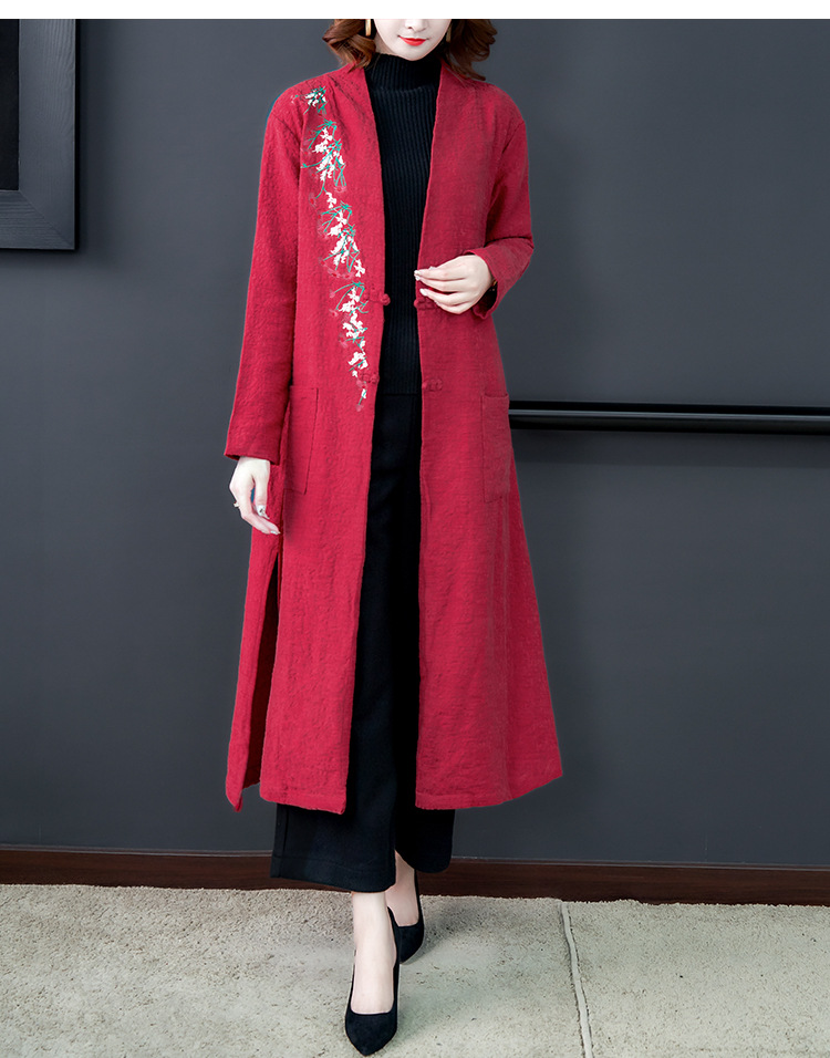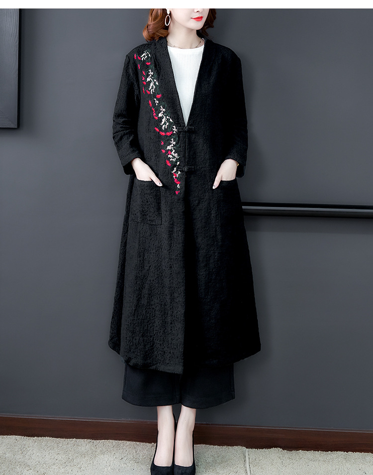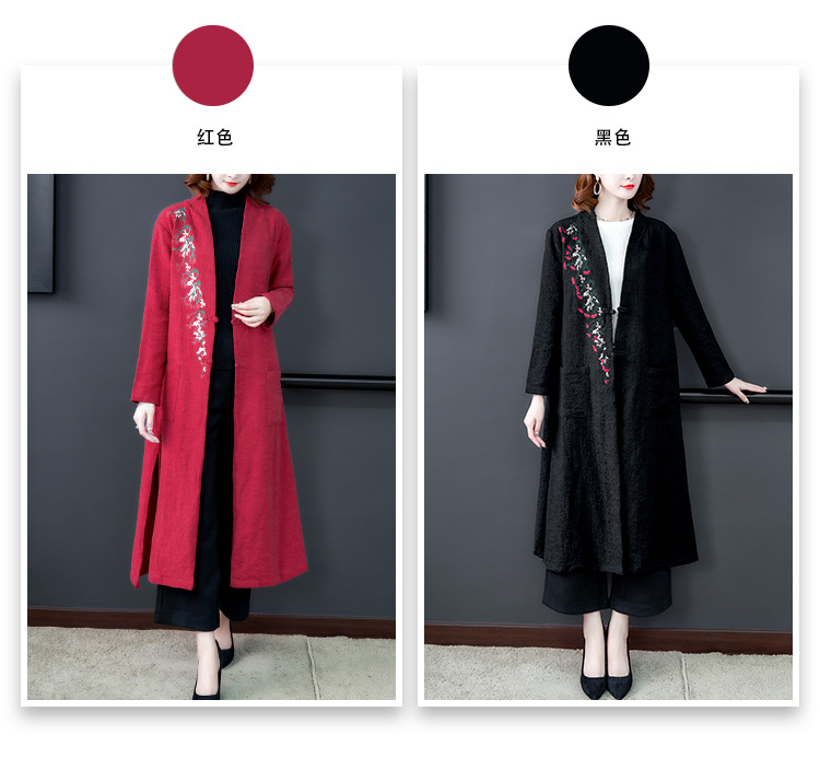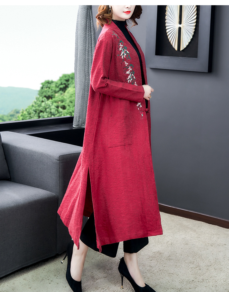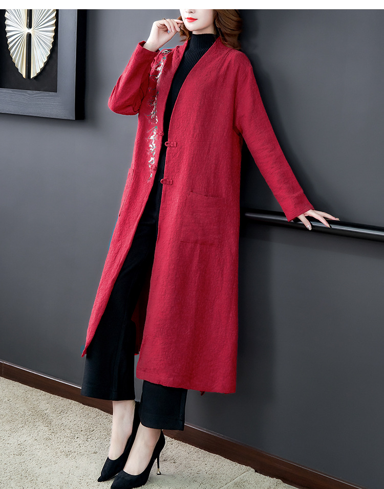 GZM-myx8022秋冬新款复古盘扣大码中长款外套民族风开叉提花亚麻刺绣风衣