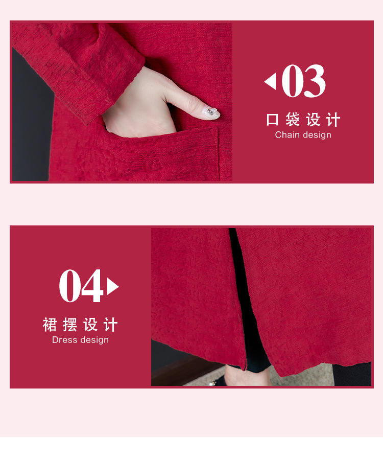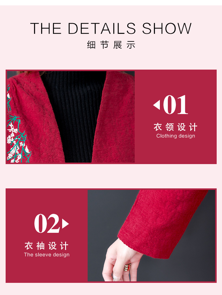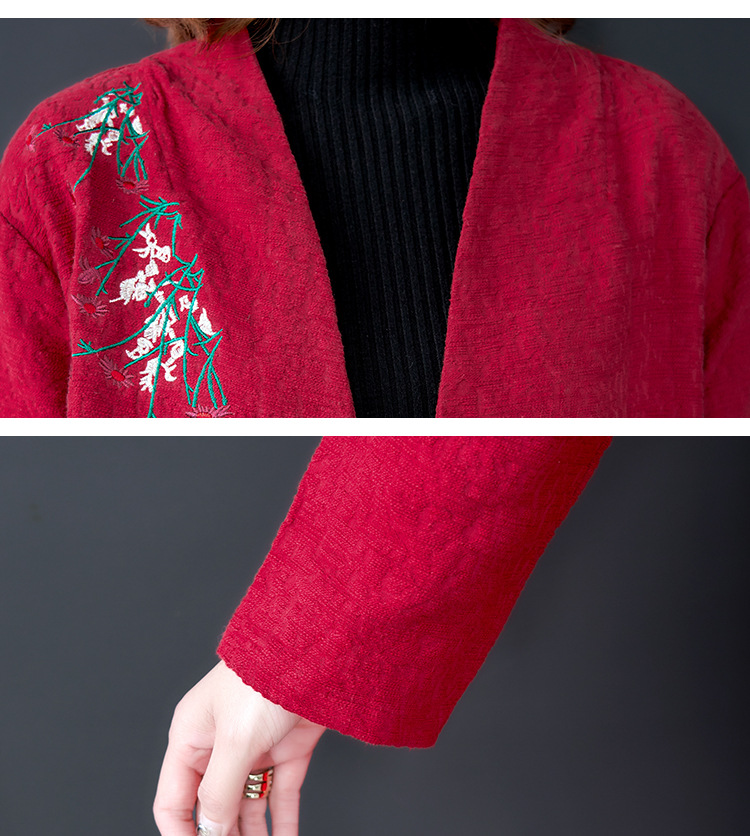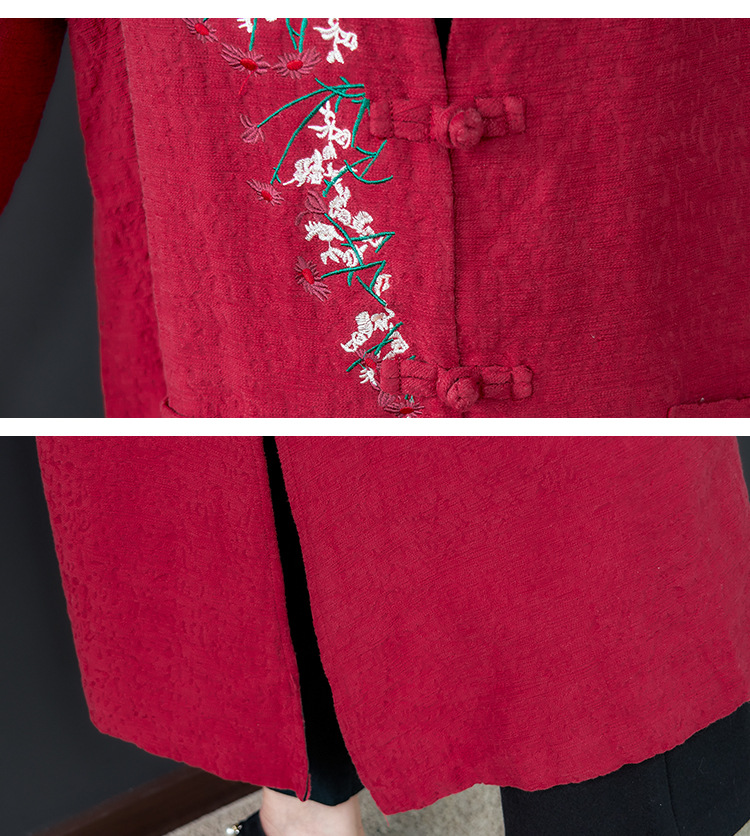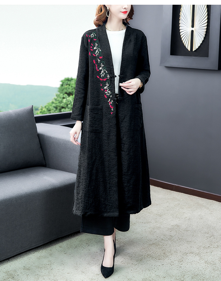 GZM-myx8022秋冬新款复古盘扣大码中长款外套民族风开叉提花亚麻刺绣风衣