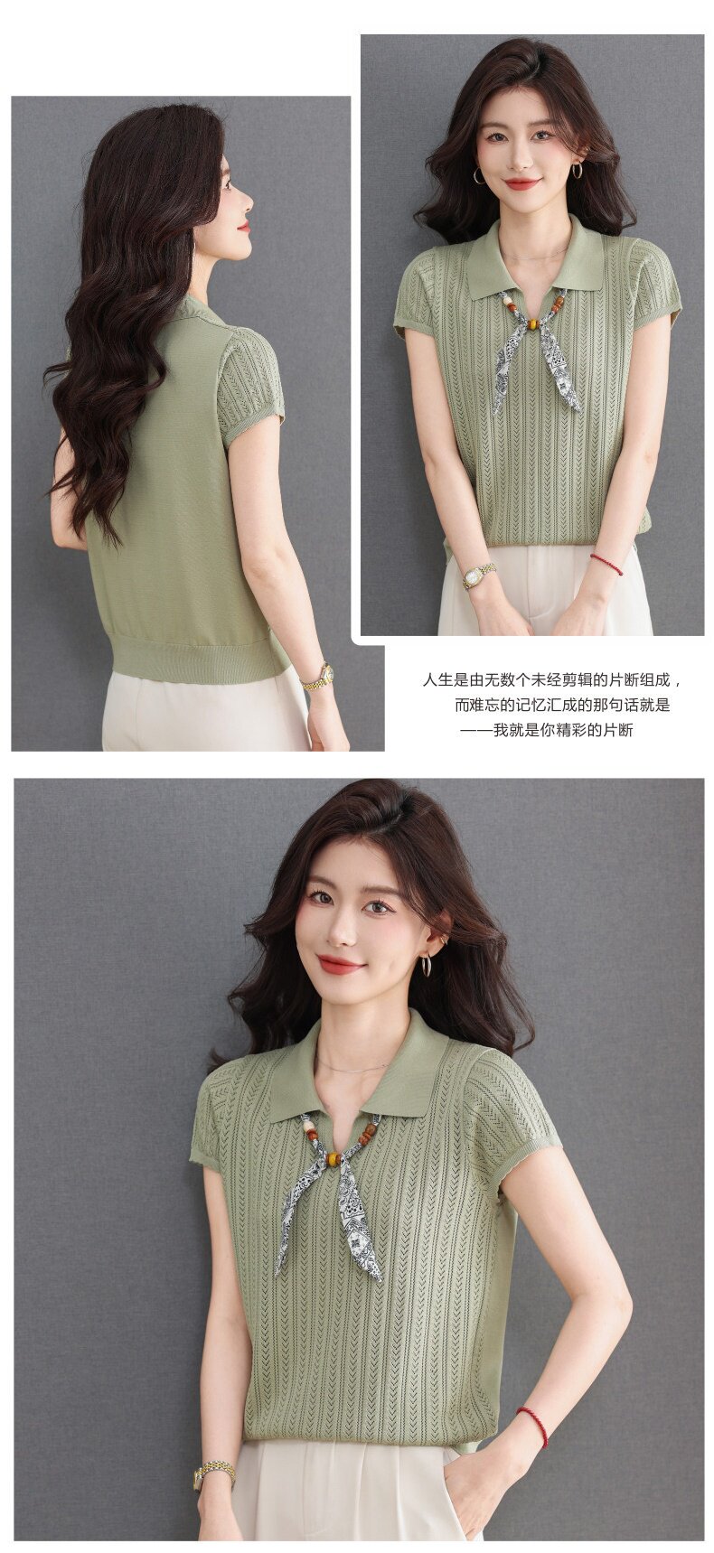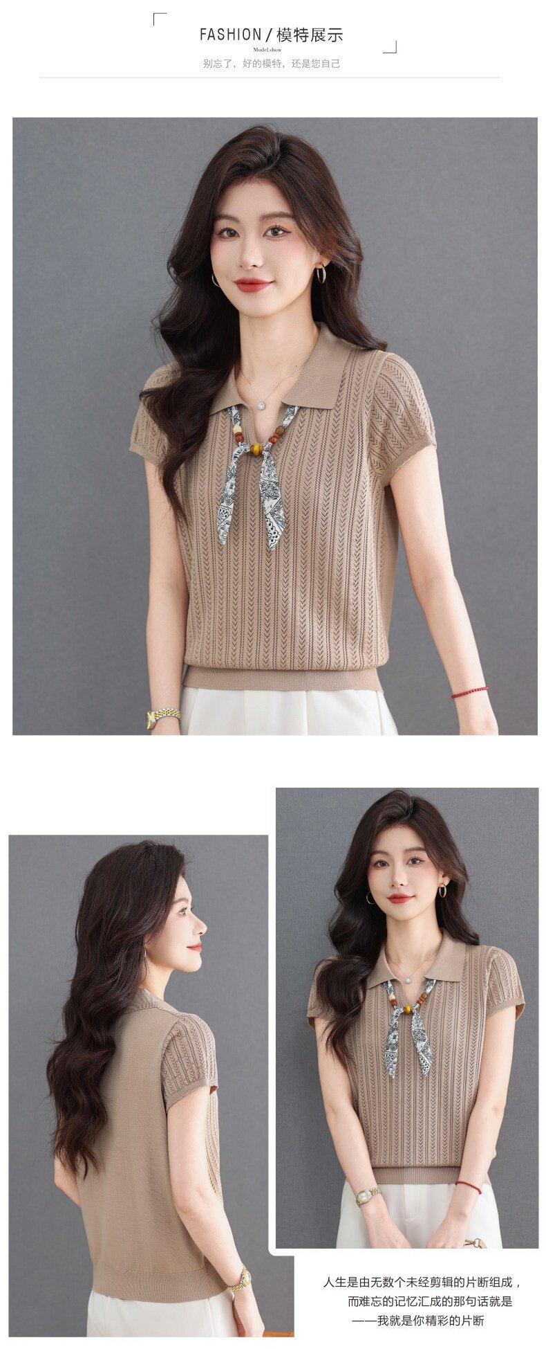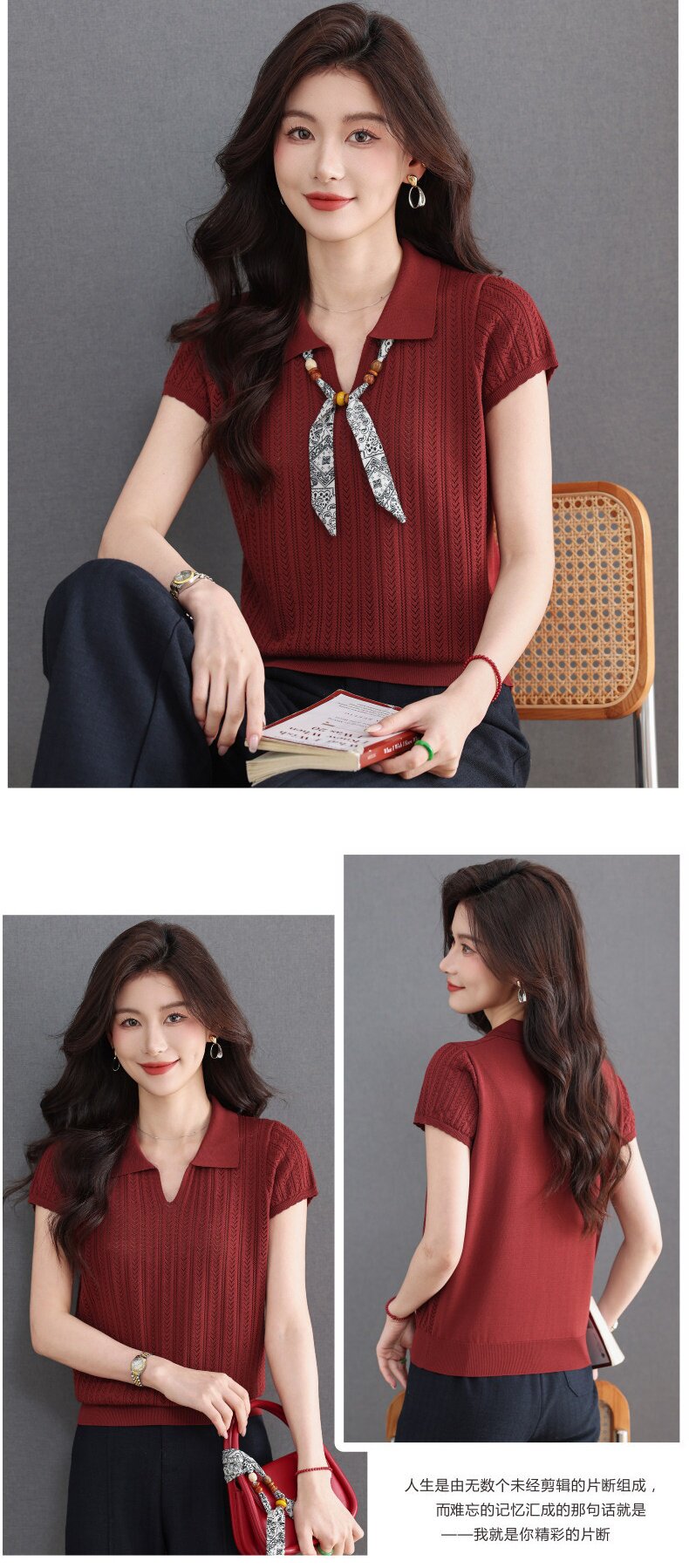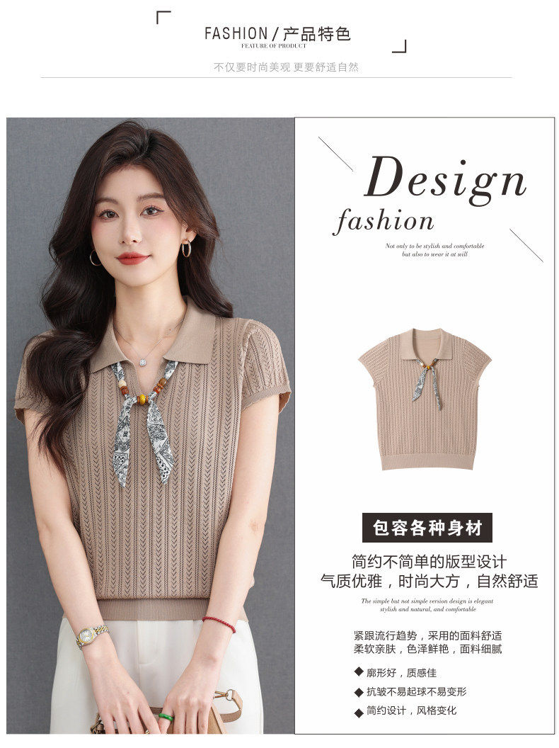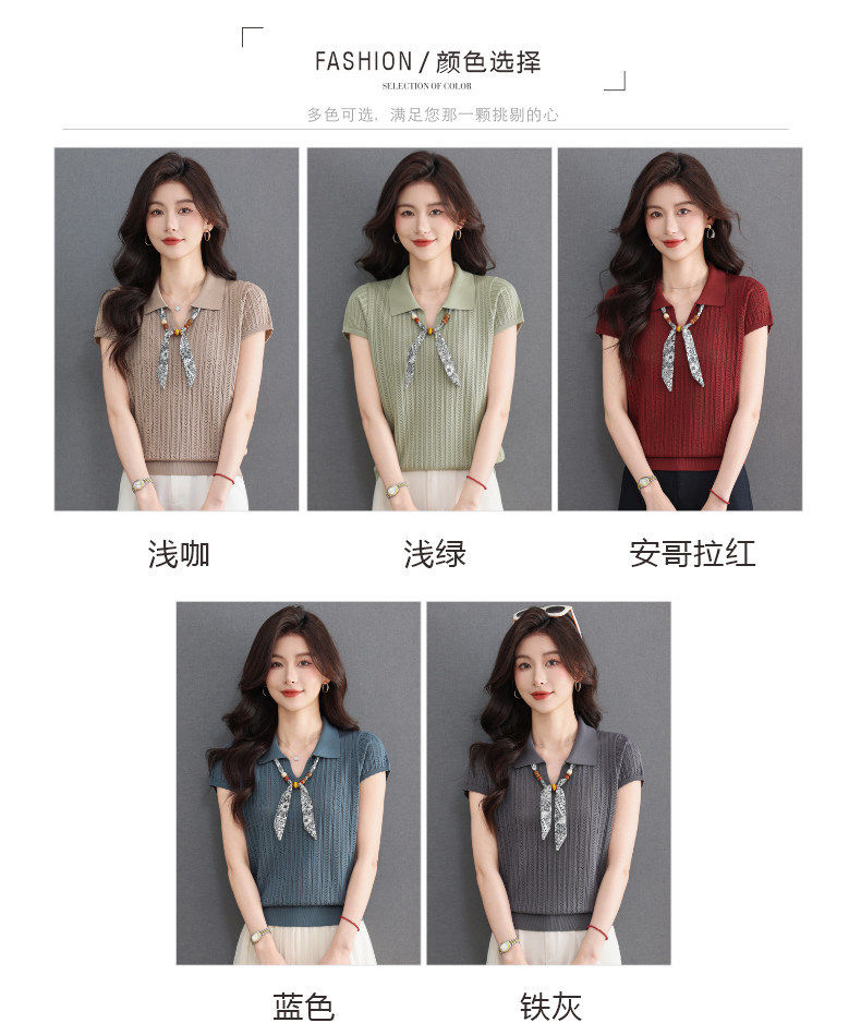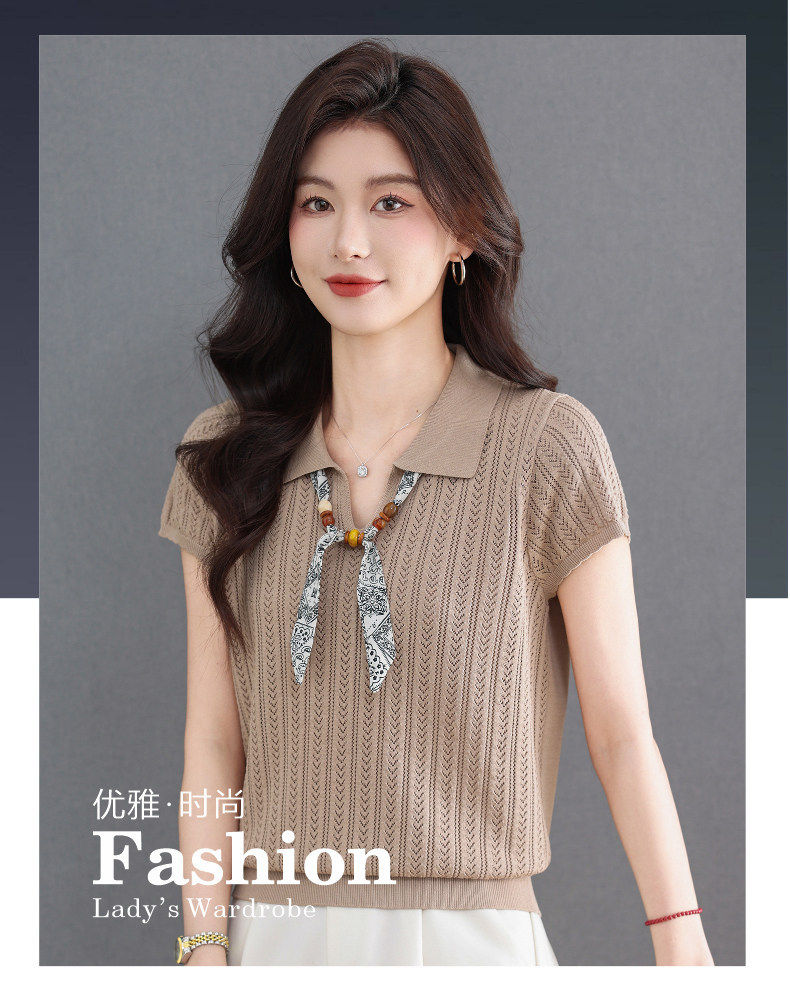 「自」全新升级【铂金会员174/天猫229/差价55】(02702)洛诗琳气质POLO领针织短袖女2026新款飘带镂空冰丝通勤T恤