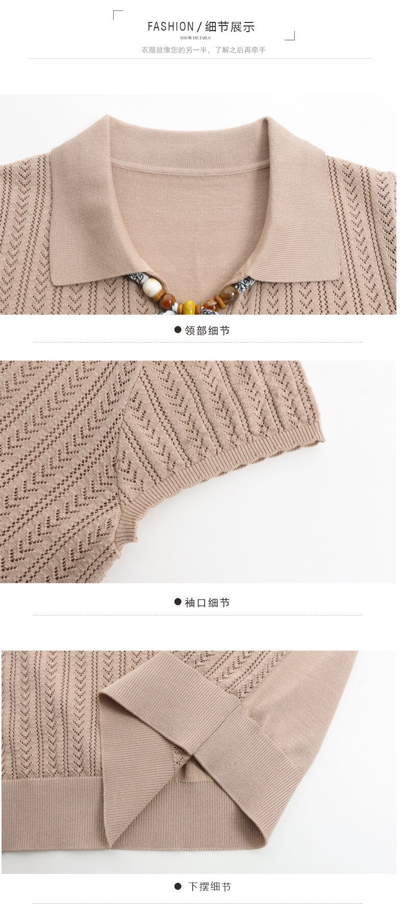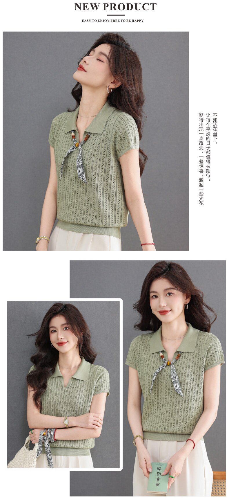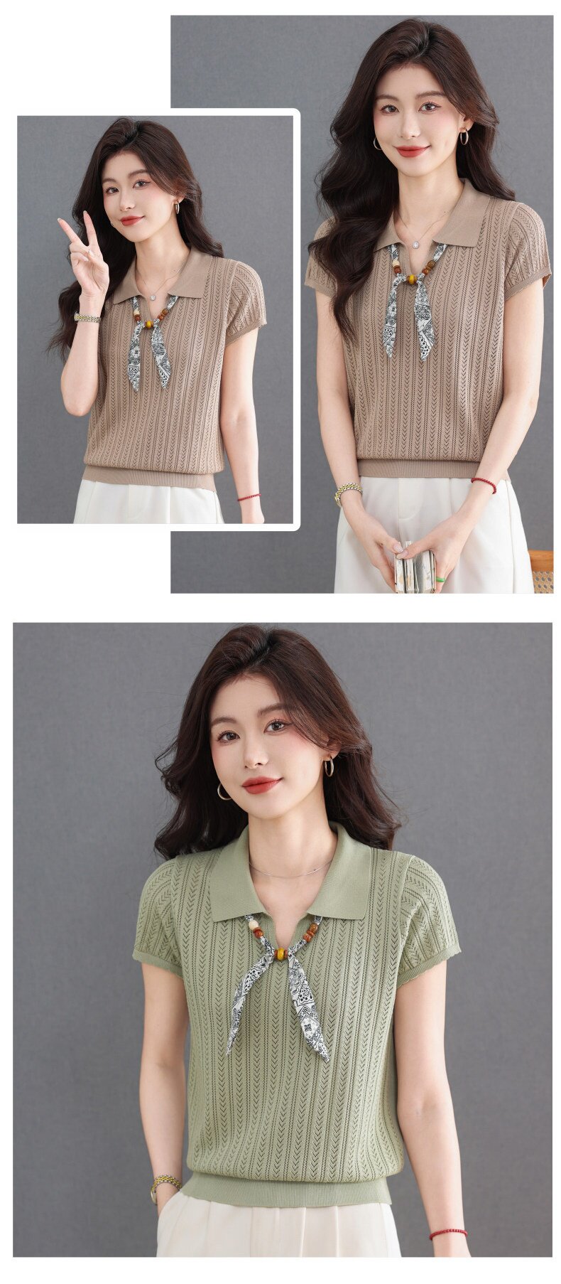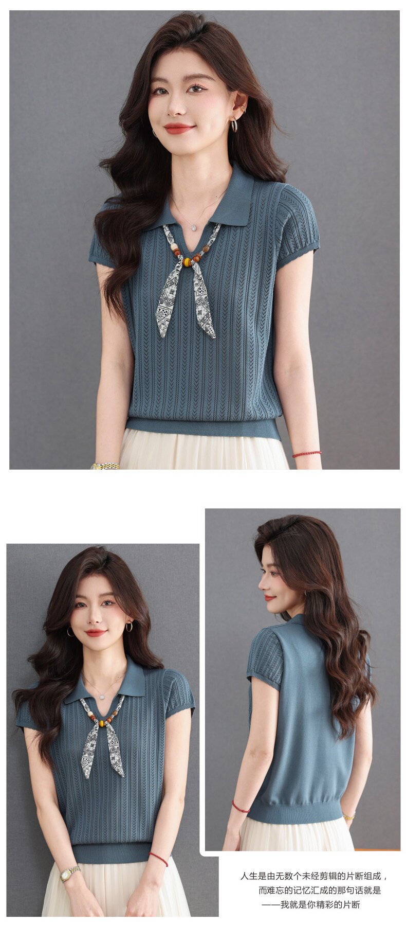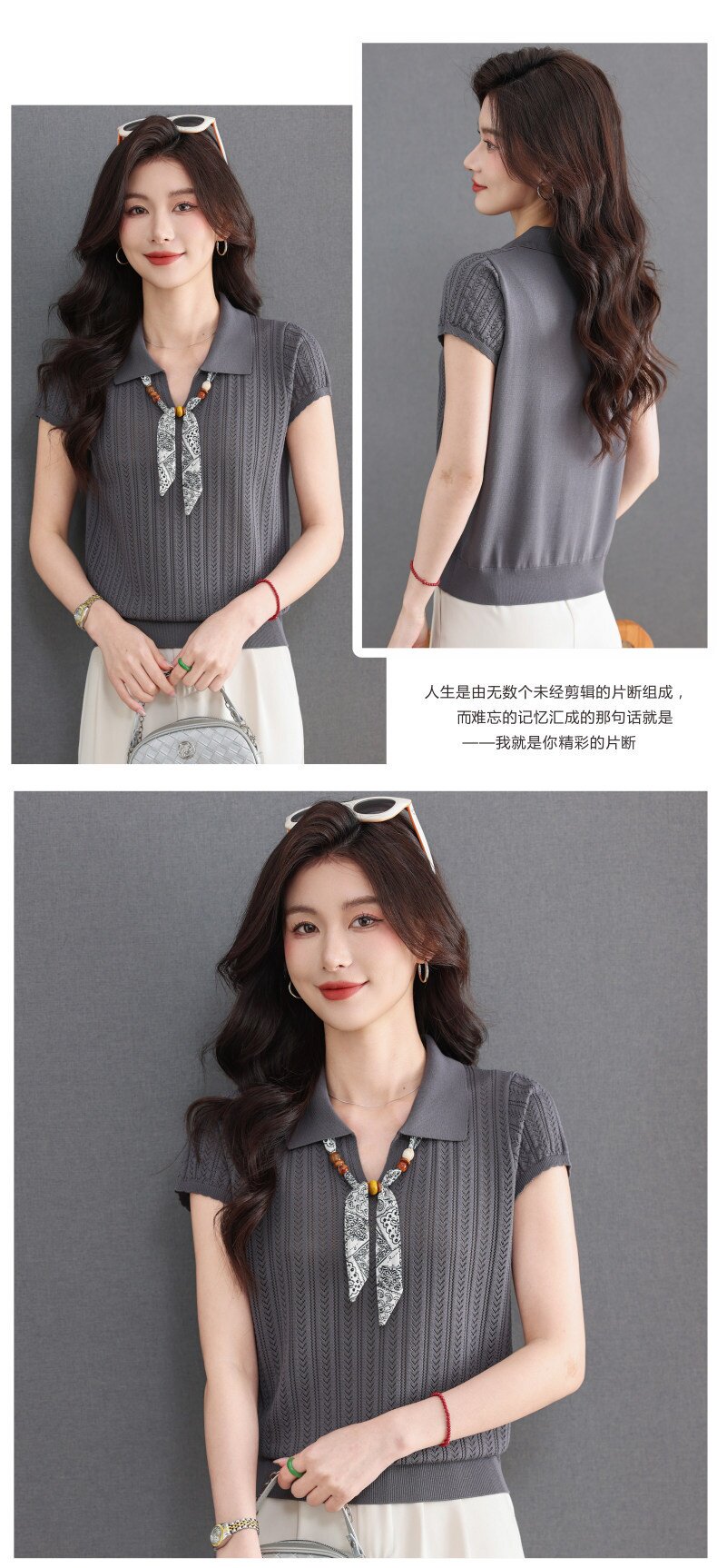 「自」全新升级【铂金会员174/天猫229/差价55】(02702)洛诗琳气质POLO领针织短袖女2026新款飘带镂空冰丝通勤T恤