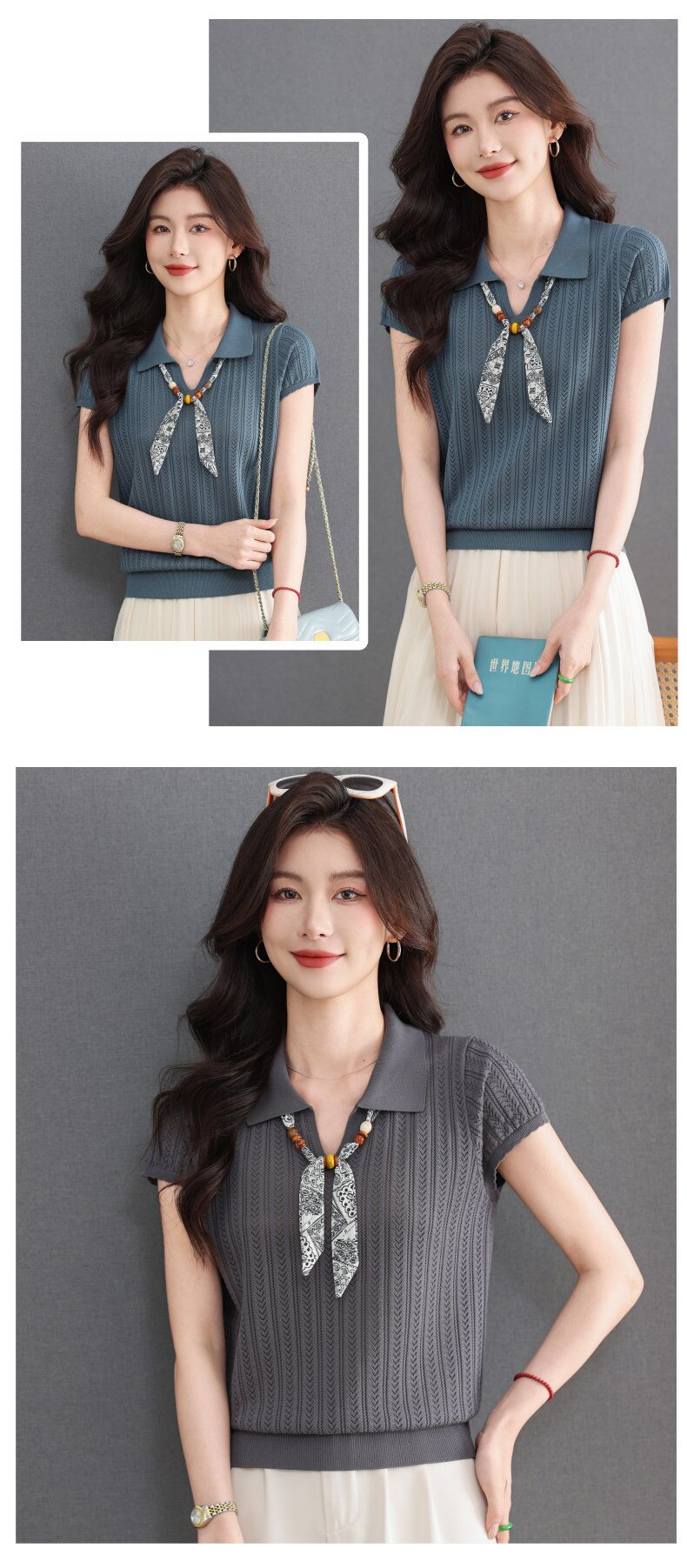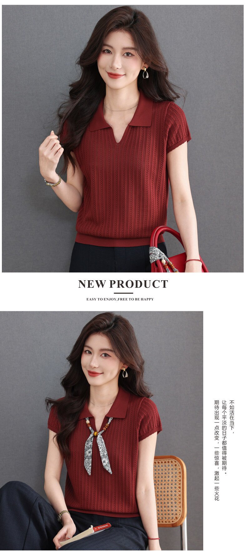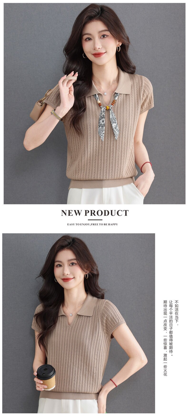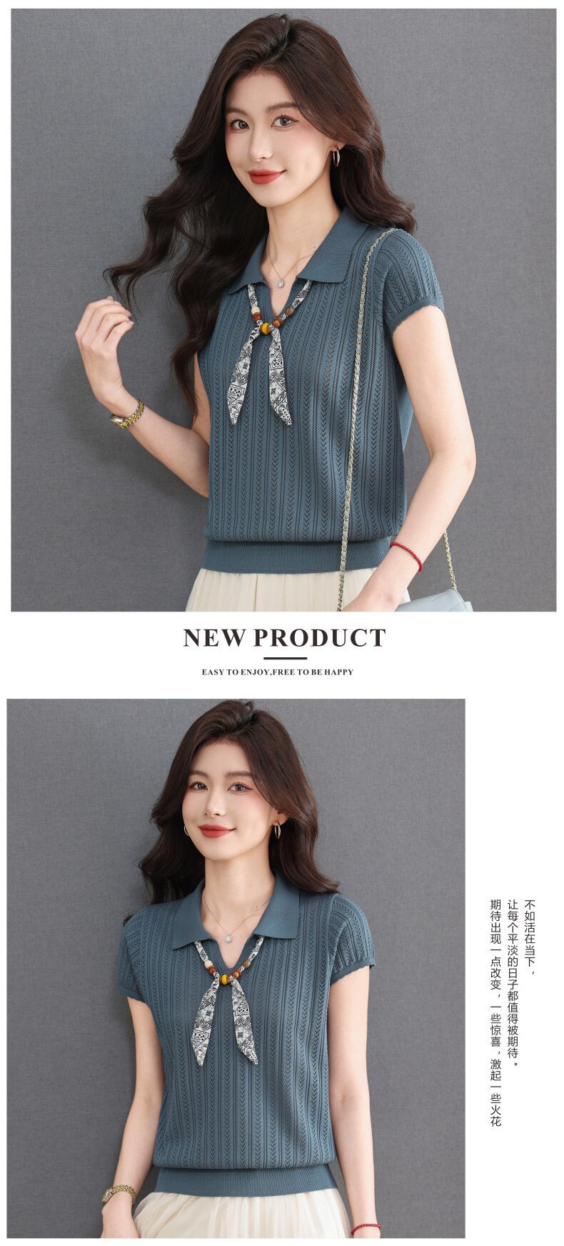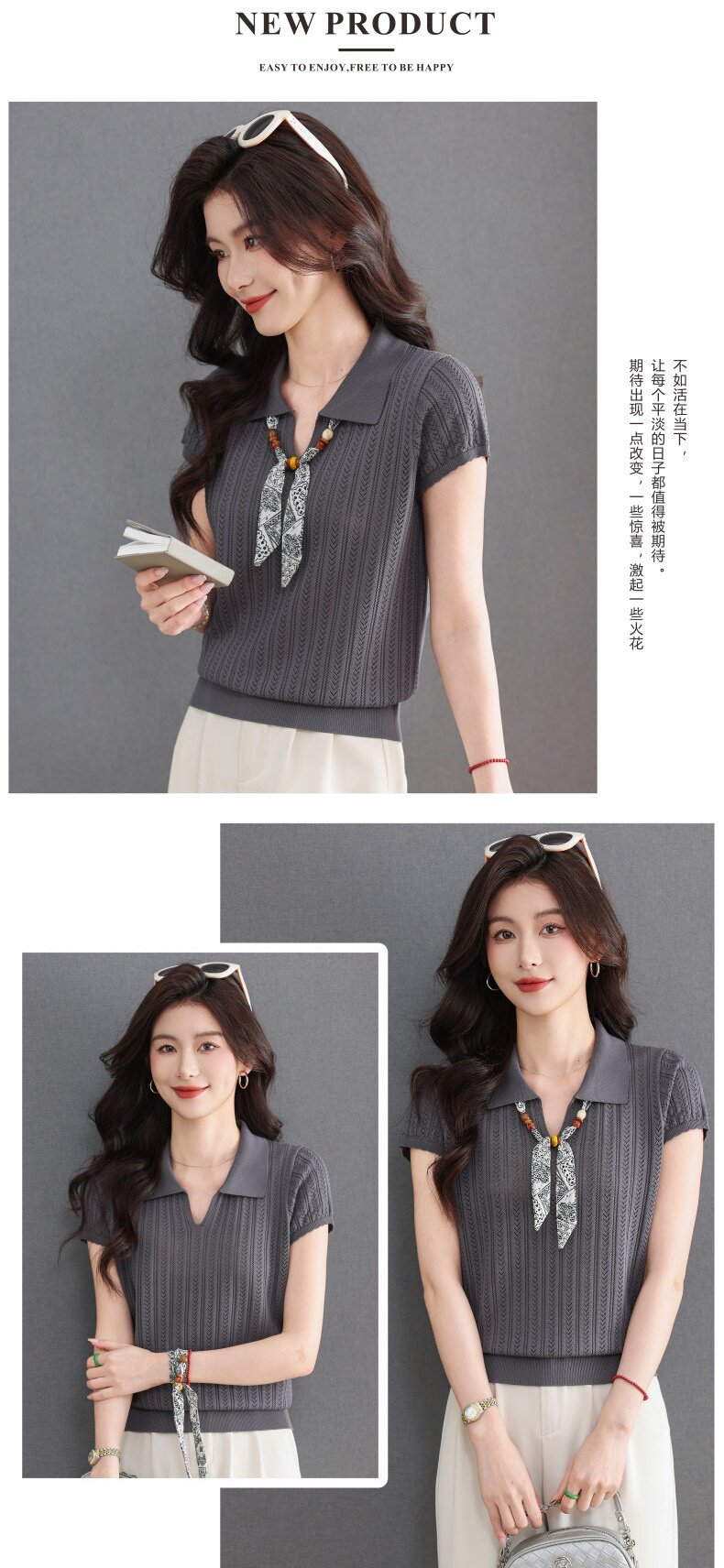 「自」全新升级【铂金会员174/天猫229/差价55】(02702)洛诗琳气质POLO领针织短袖女2026新款飘带镂空冰丝通勤T恤