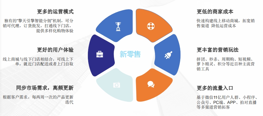 分销代理商城 + 门店分销 + 订货商 + 营销 + 大数据+直播+全网推广+推动线上线下多渠道裂变营销拓客,助力商家开启社交新零售时代。