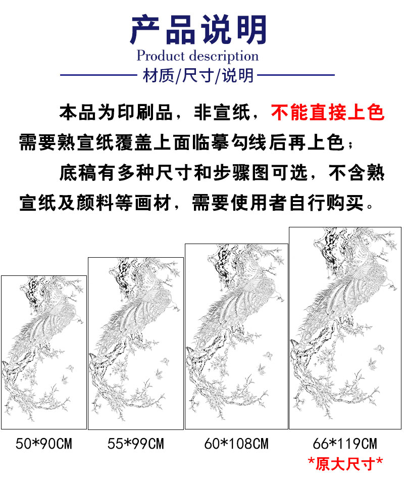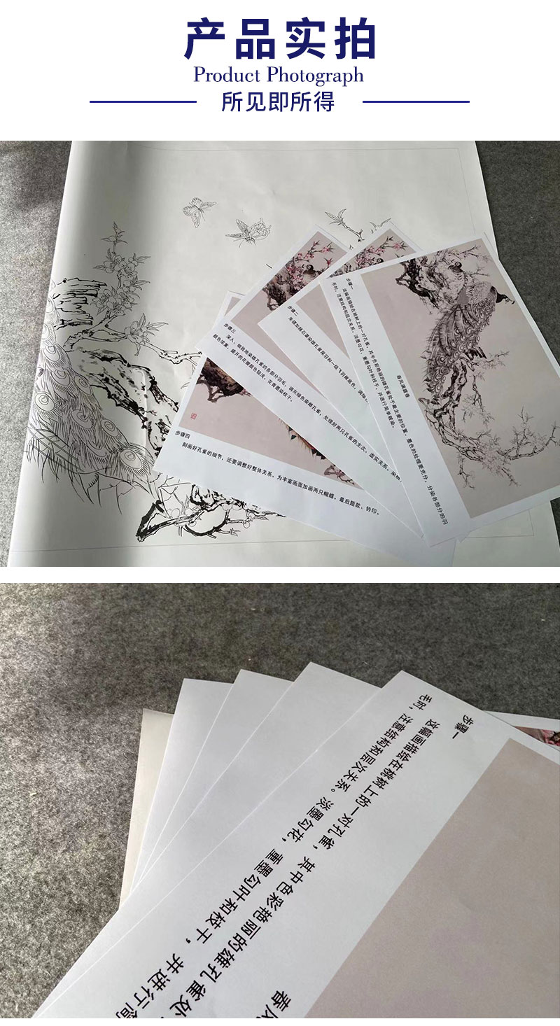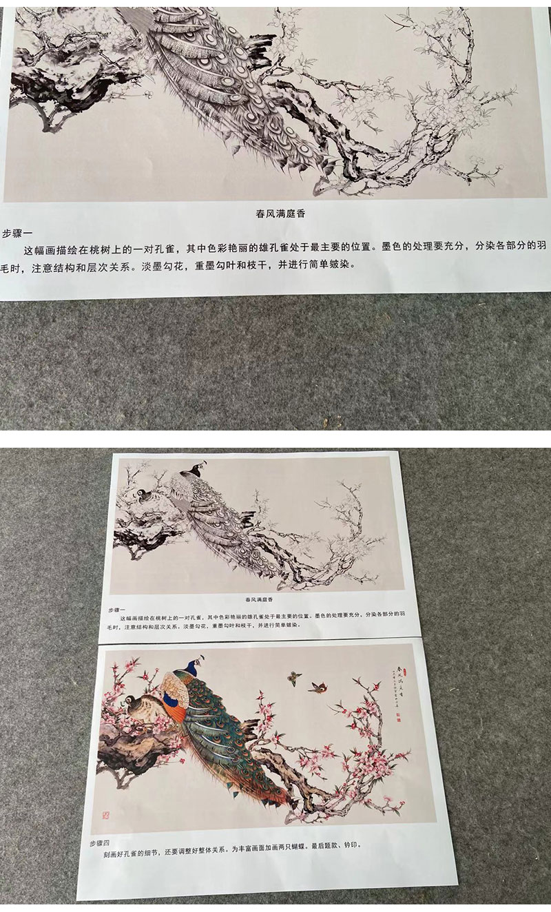 【有步骤】陈军横幅工笔画白描底稿《春风满庭香》桃花树孔雀初学者临摹花鸟线稿CJ30